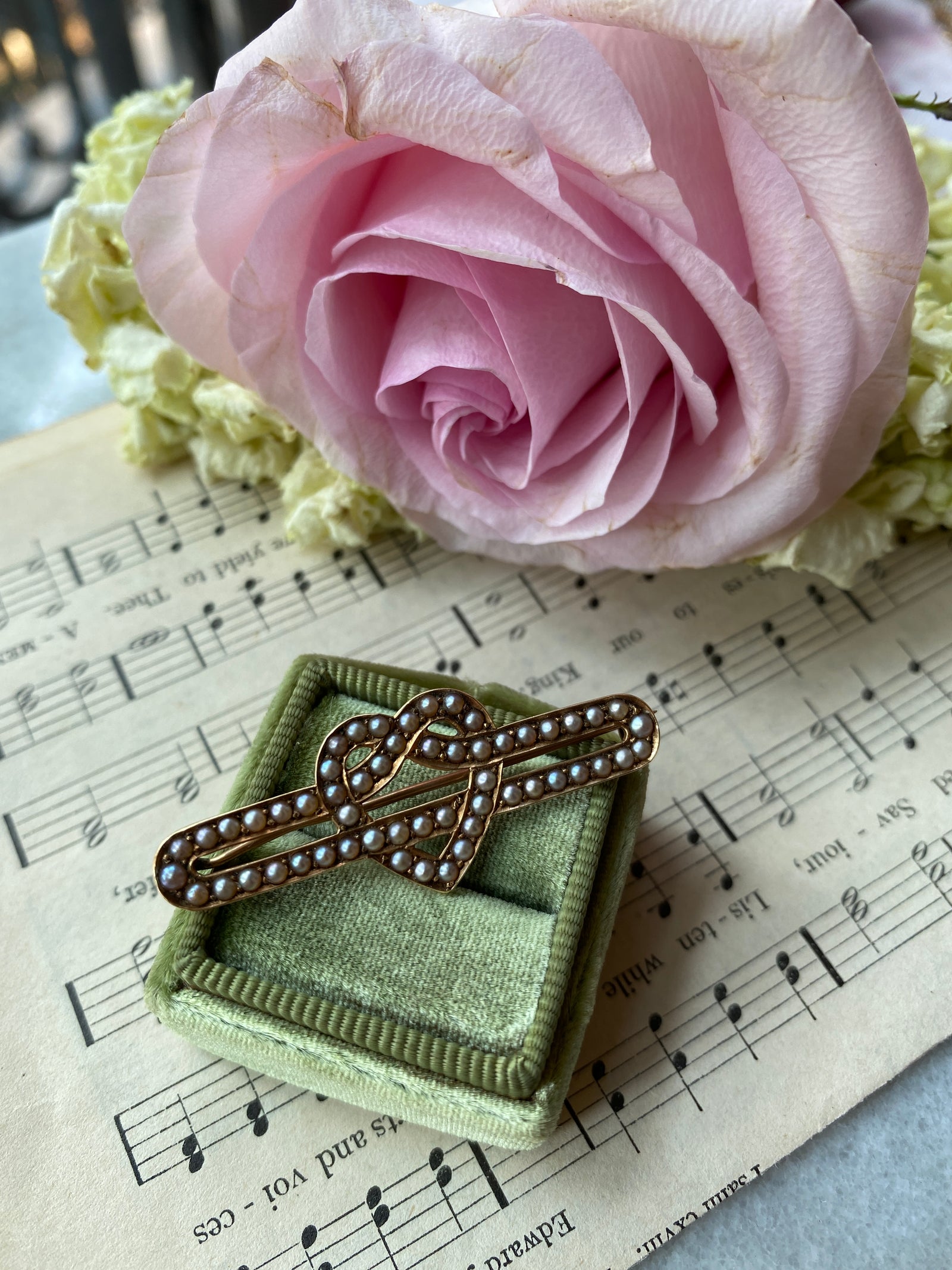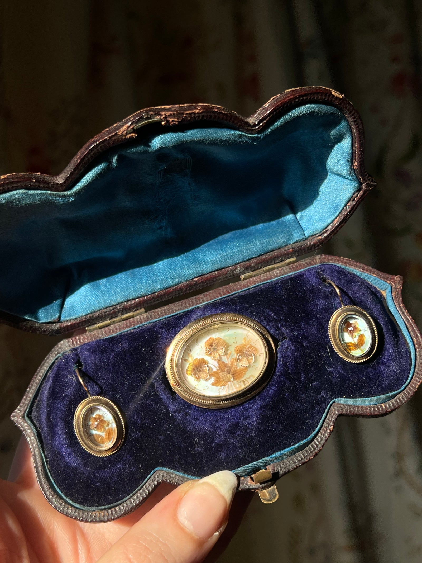 14ct Boxed Demi Parure of Brooch and Earrings Containing Hair Flowers