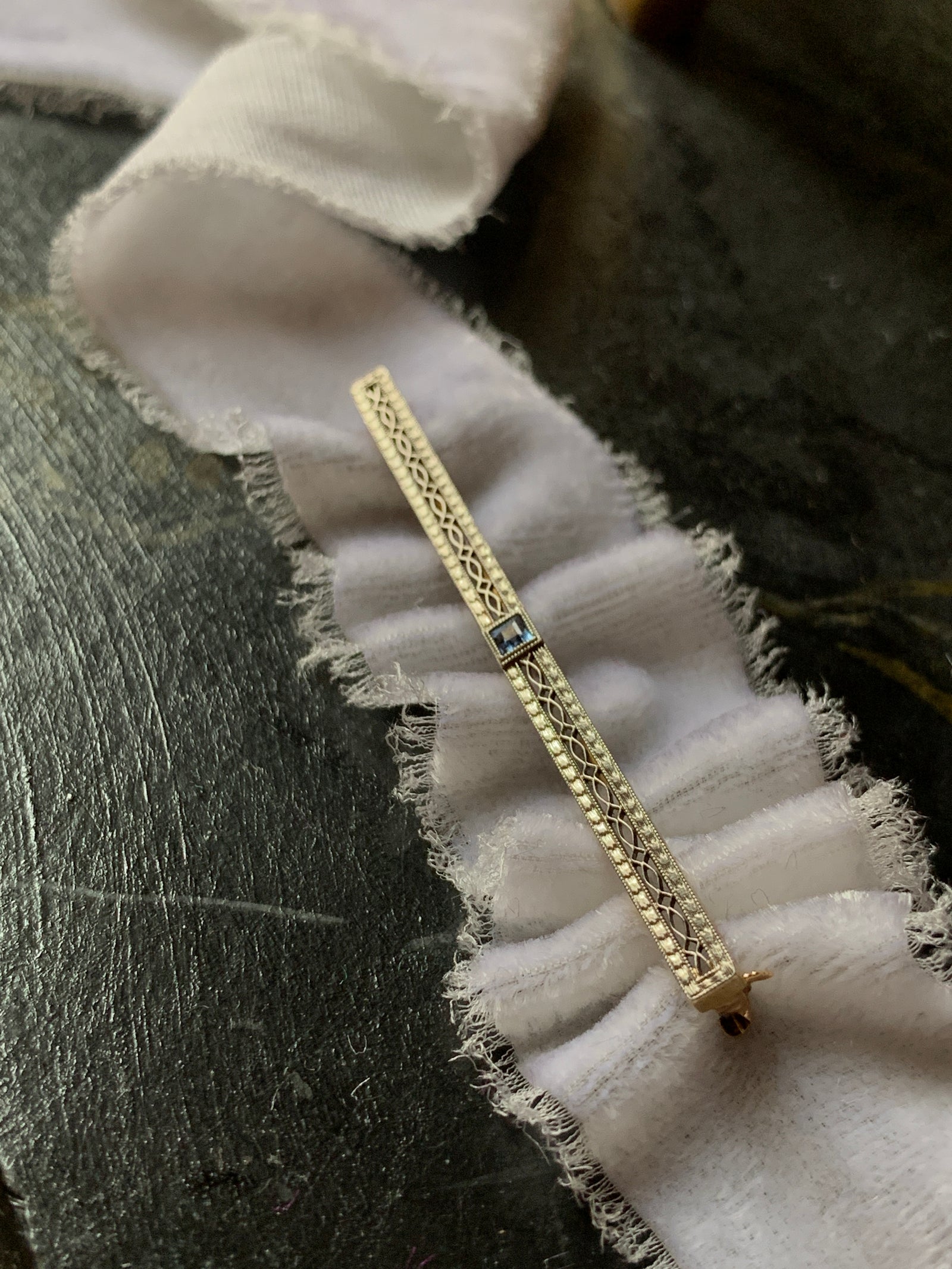 14ct American Bar Brooch with Natural Sapphire Circa 1910, Pre-Deco, 2.25” length