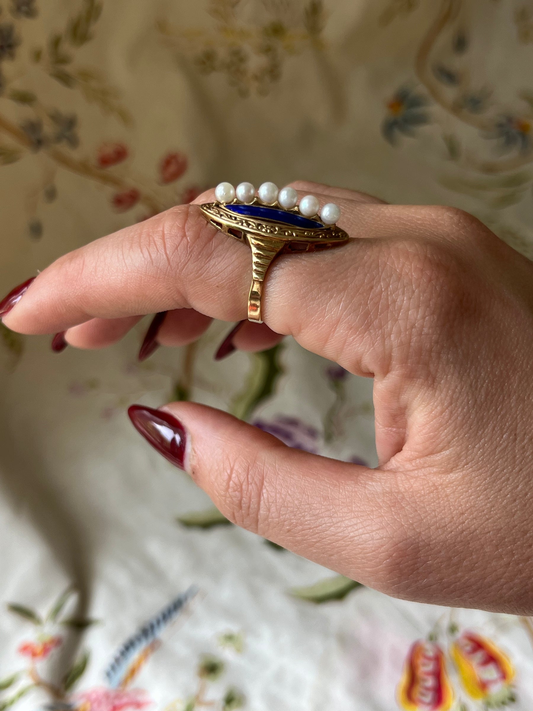 This gorgeous vintage ring is a rare treasure, as it beautifully reinterprets the iconic 18th century navette design in a sleek mid-20th century façade. Crafted in 14 carat gold, this ring features stunning scrolling foliate design around the center halo of the ring. Equally striking is the vibrant blue cobalt enamel setting, upon which sits a scalloped, spike setting of central pearls; the pearls are arranged in such a way that they almost appear to be floating off the ring!