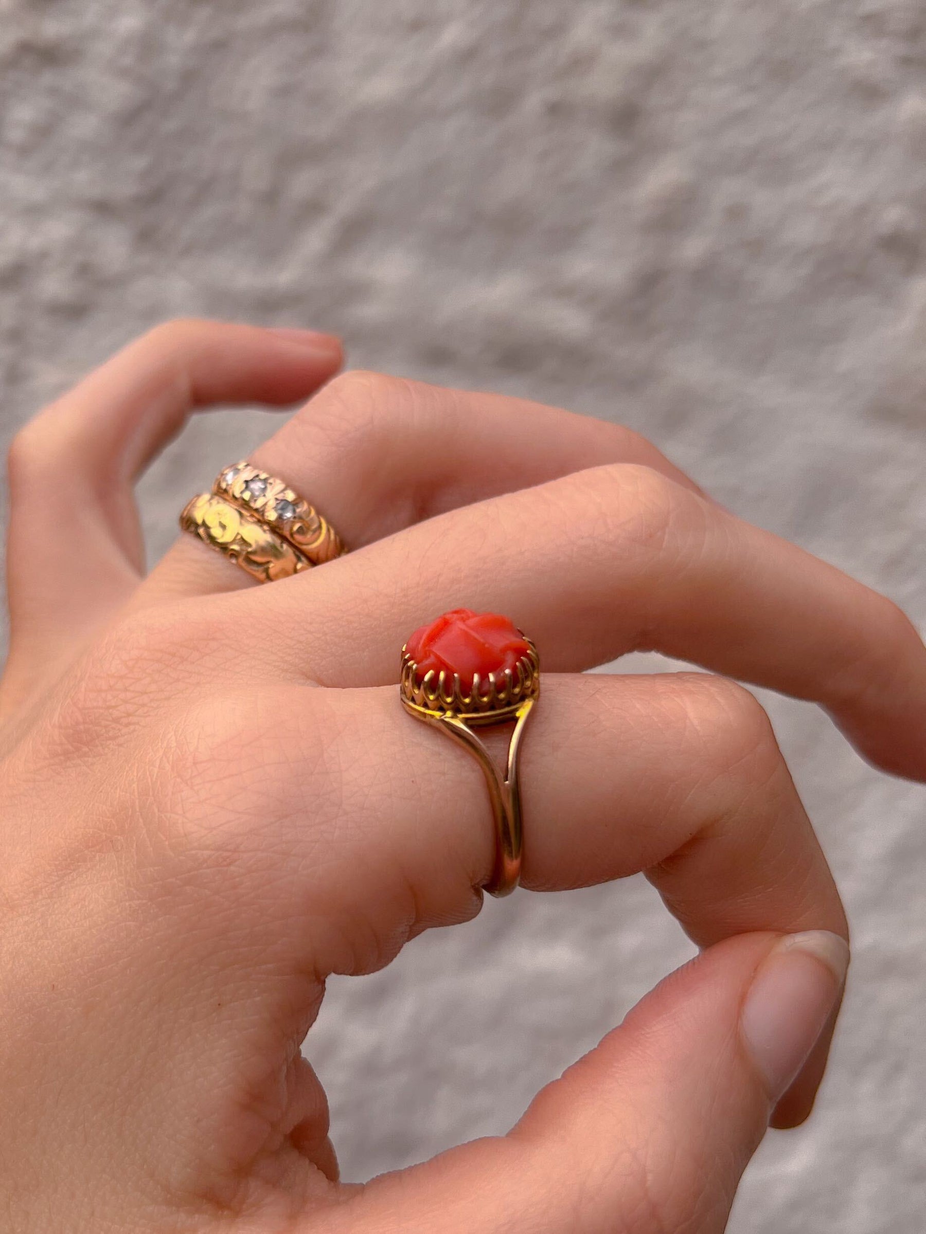 A peculiar, delightful find, this beautiful 9k conversion ring has a sumptuous pie-like lovers knot carving, prong set beautifully upon a split shoulder shank. Strips of buttery pastry seam to tuck under one another in creating a harmonious infinity symbol of life’s ever ebbing flow.