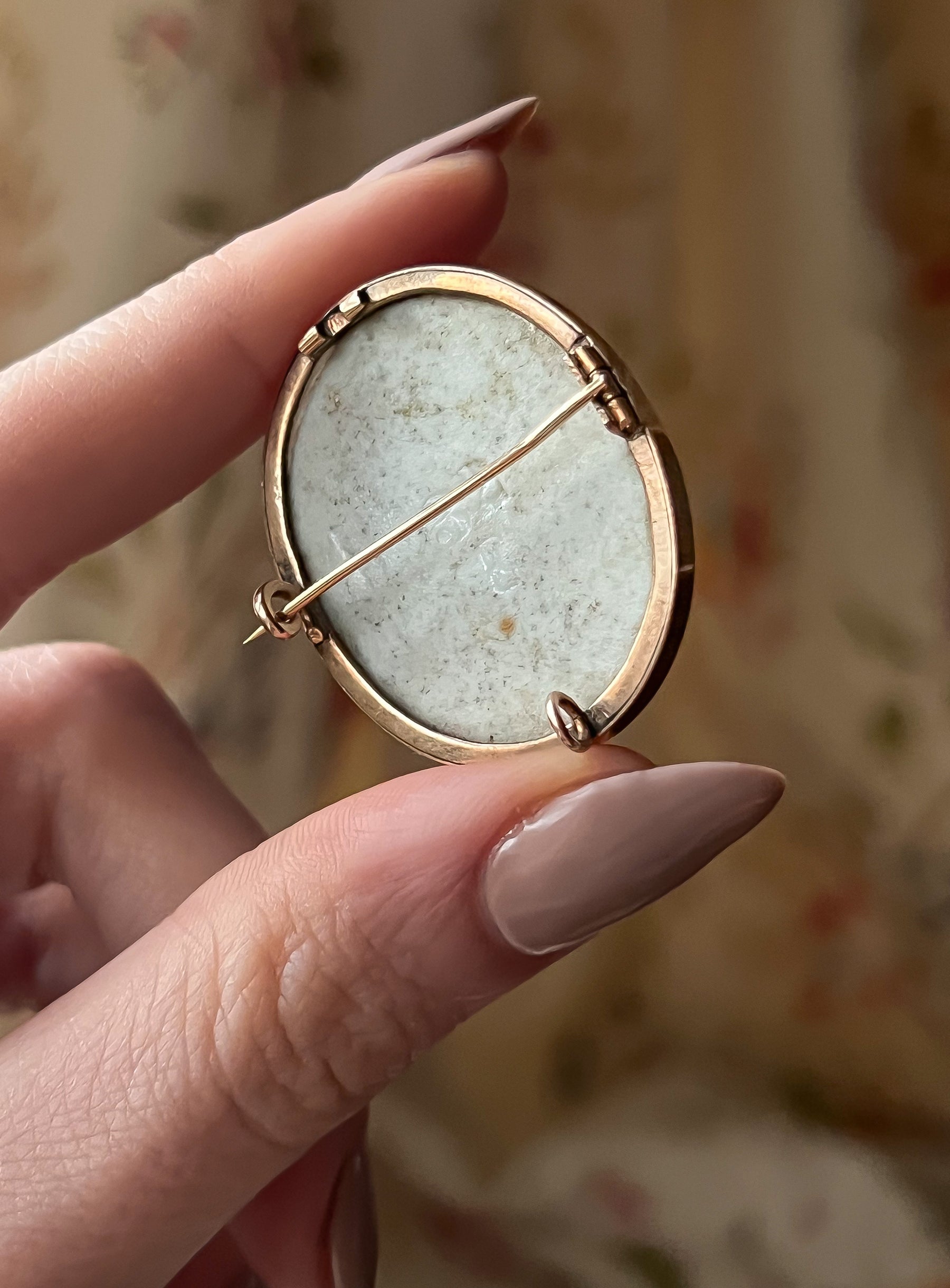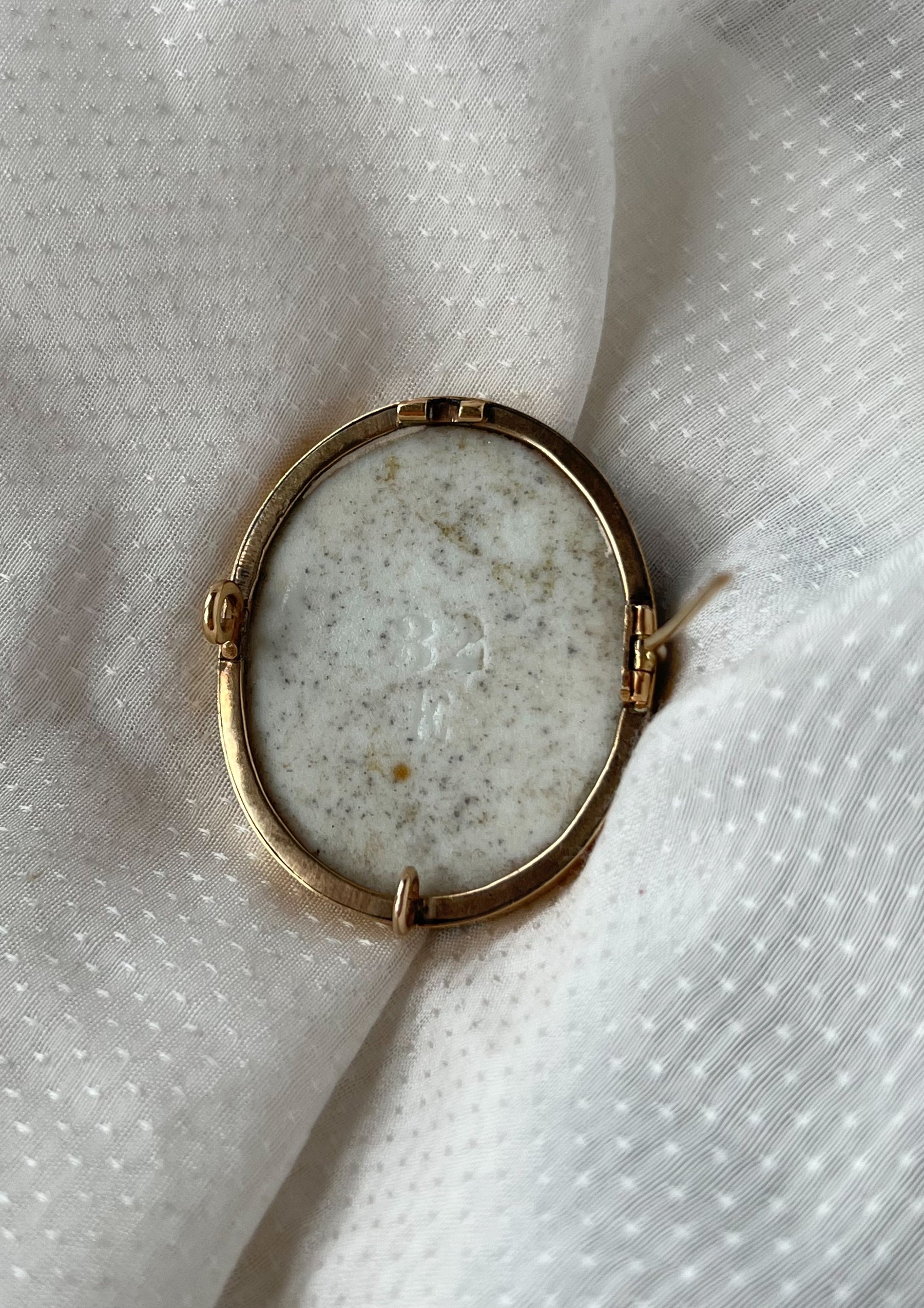 A darling little English portrait set in 15ct. Reminiscent of superb KPM of porcelain plaques, this hand painted porcelain miniature depicts a young girl of 12 or so, leaning over a bed of fresh blossoming flowers in a vernal moment. She dons a sumptuous strand of pearls, while wearing quite simple dress, accented by purple, yellow, white and blue. This piece speaks to the tradition of dressing young wealthy children up in provincial ensembles in attempts to hearken back to a simpler time and remember them in their innocence. This cute portrait is likely a delicate portrait of a beloved one. Outstanding in every way, the piece is impressed 32 P on the reverse.