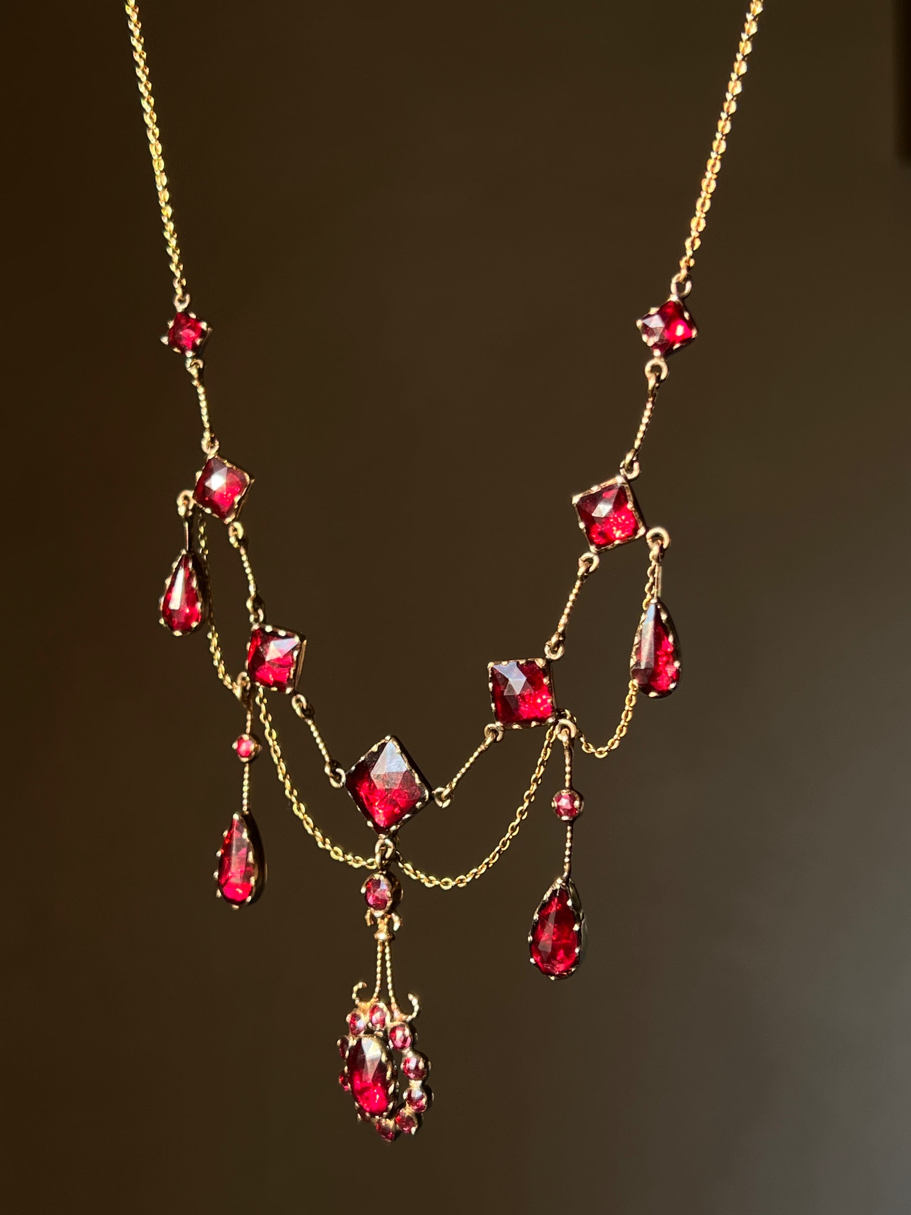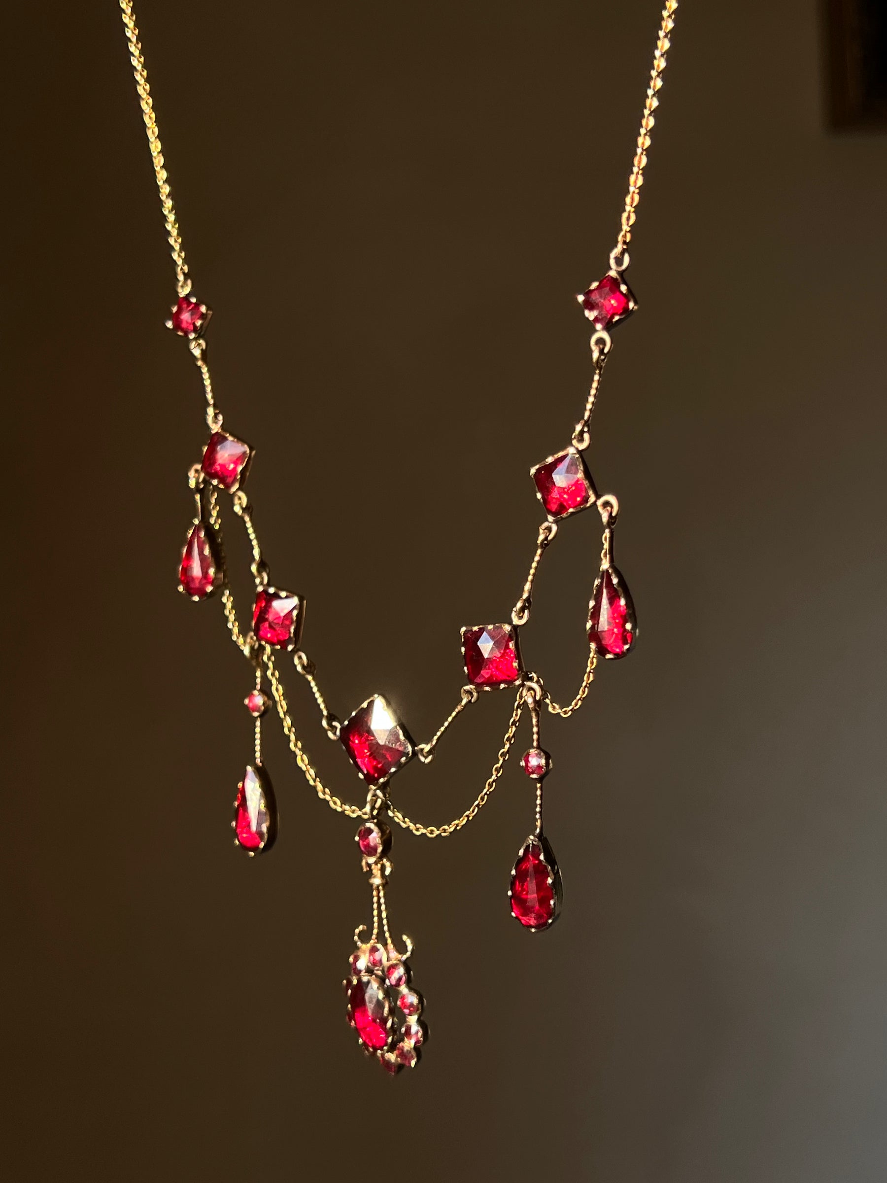 This Swagged French Perpignan Garnet Garland Necklace is a true princess necklace! Crafted circa 1880s in a striking 18 carat gold, this necklace is a pre-Belle Epoque example, with many striking design elements.
