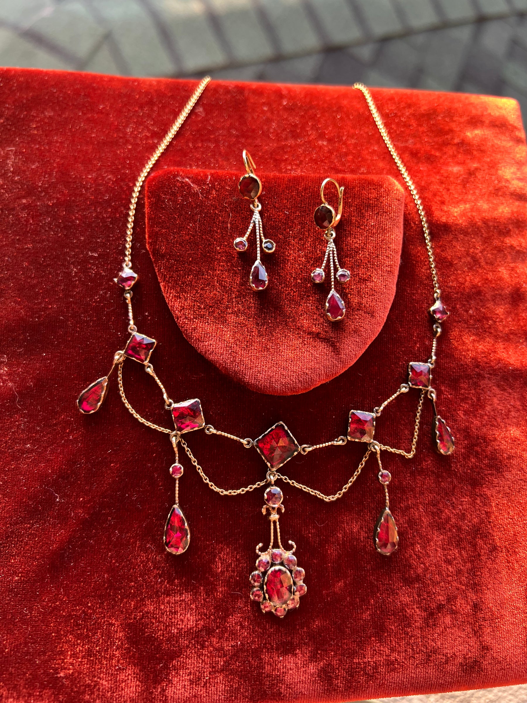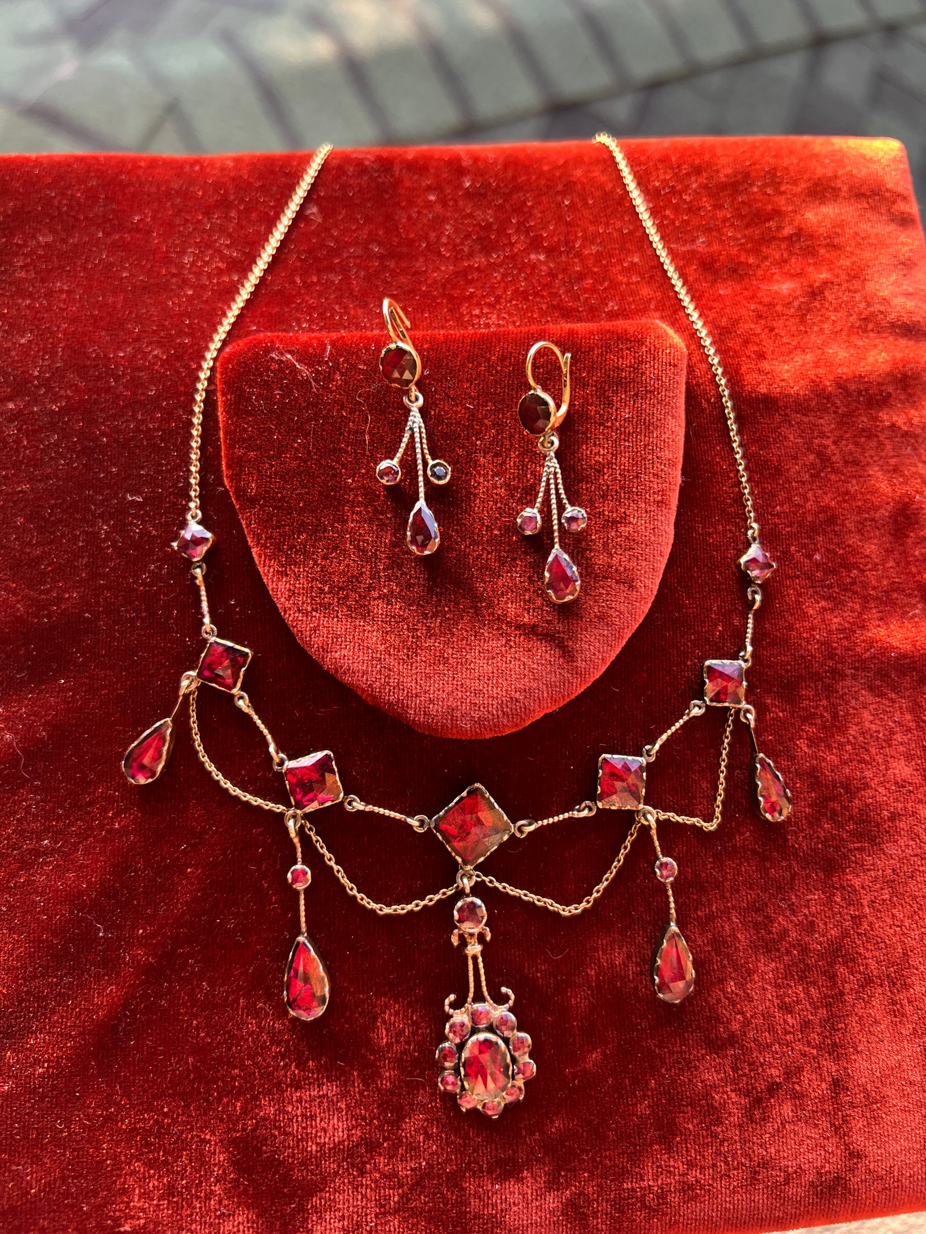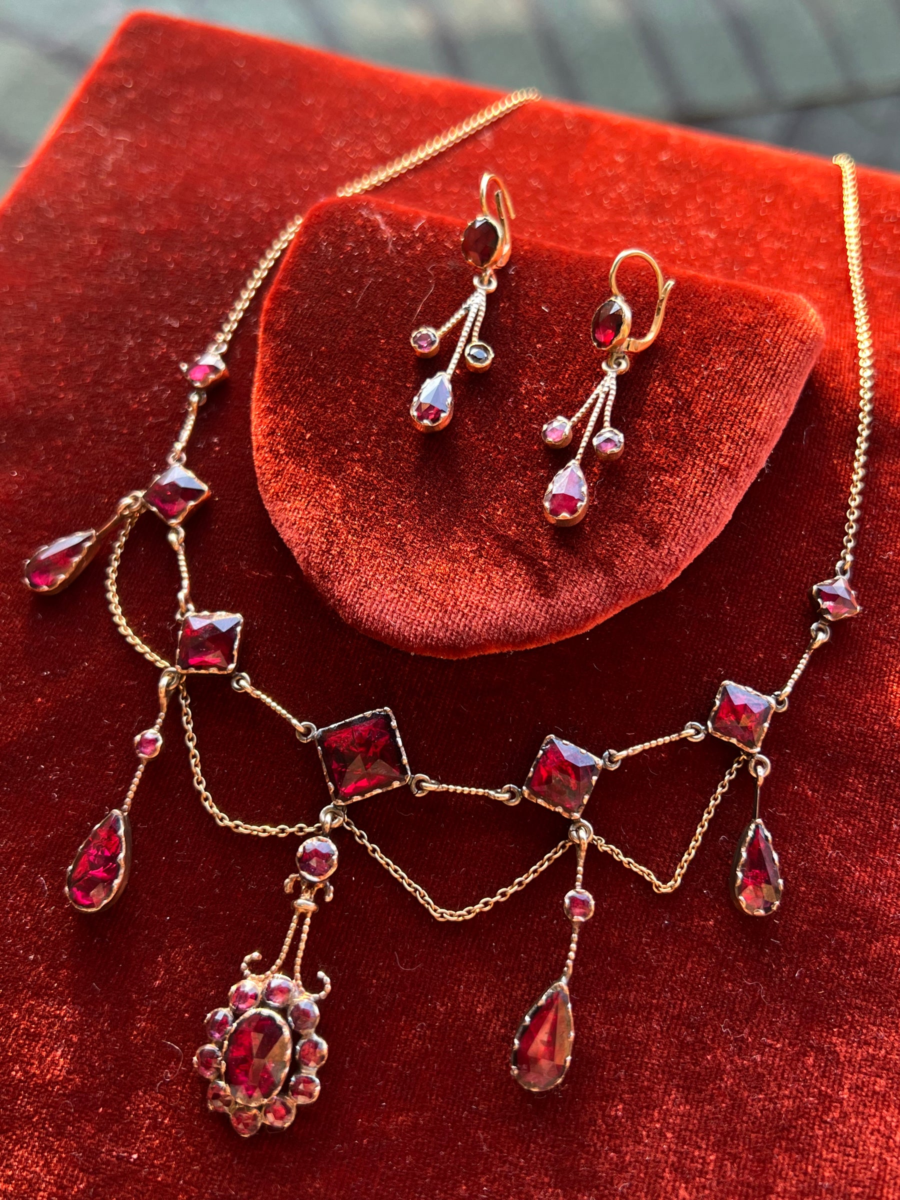 Finally, this necklace features wonderful matching fanned earrings, with delicate blood-red Perpignan garnets dangling elegantly from their central station.