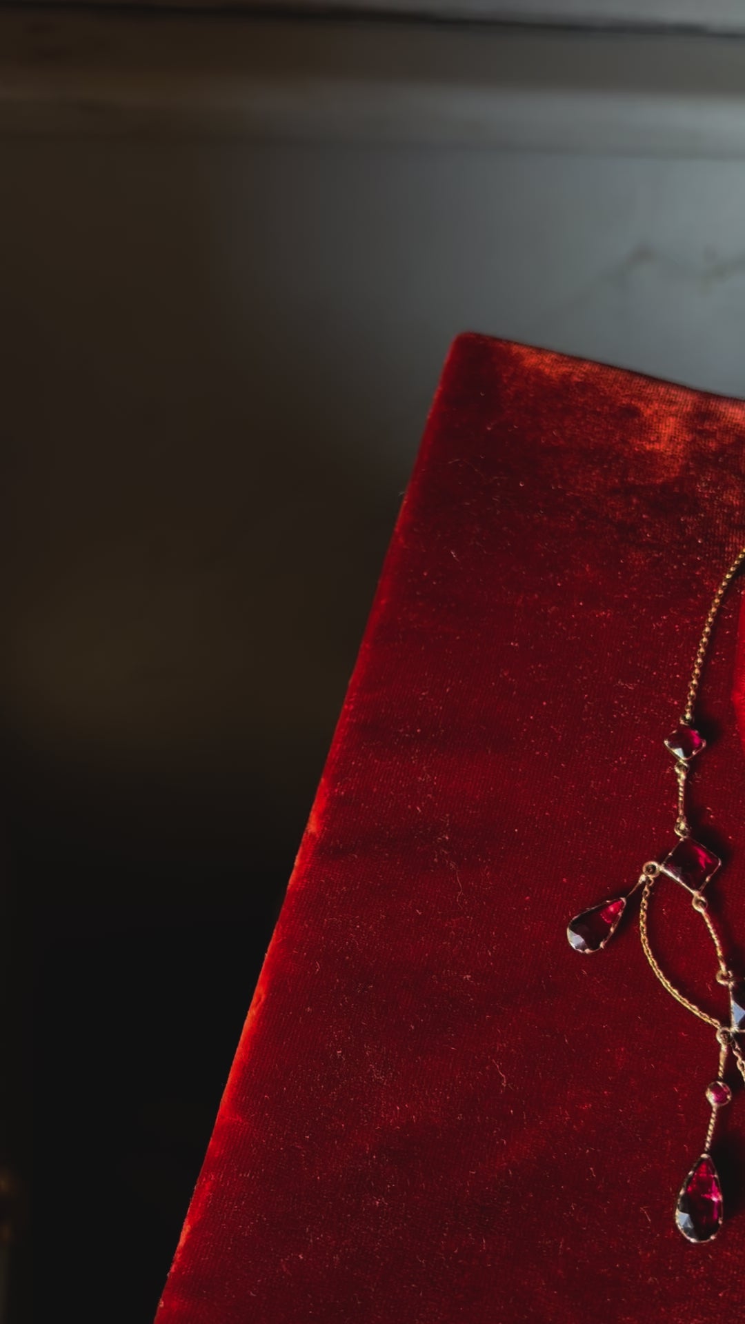 First and foremost, these decadent foiled Perpignan Garnets glimmer like starry pomegranate jewels along the length of the necklace, creating the most romantic silhouette. No matter how you choose to wear this piece, it is certain to turn heads.
