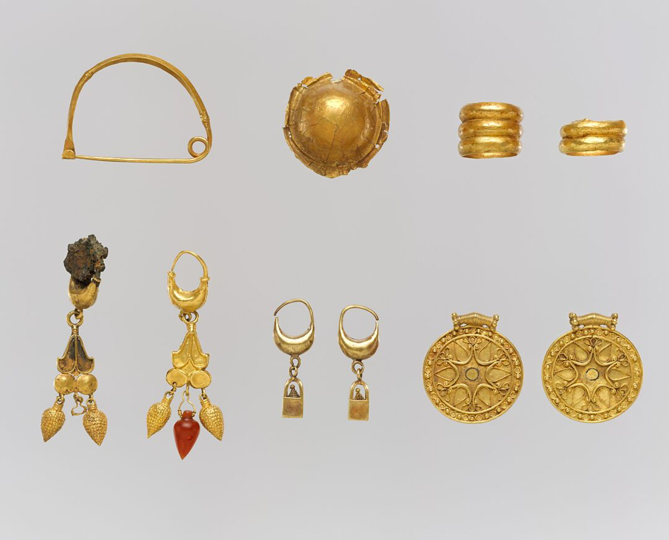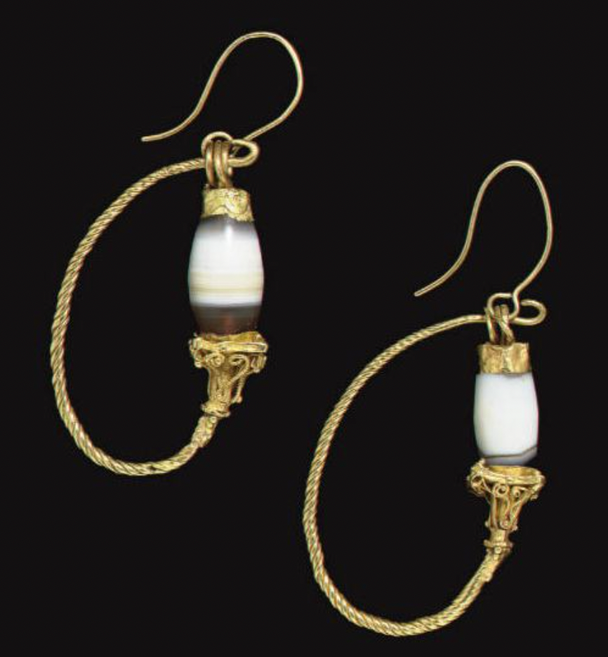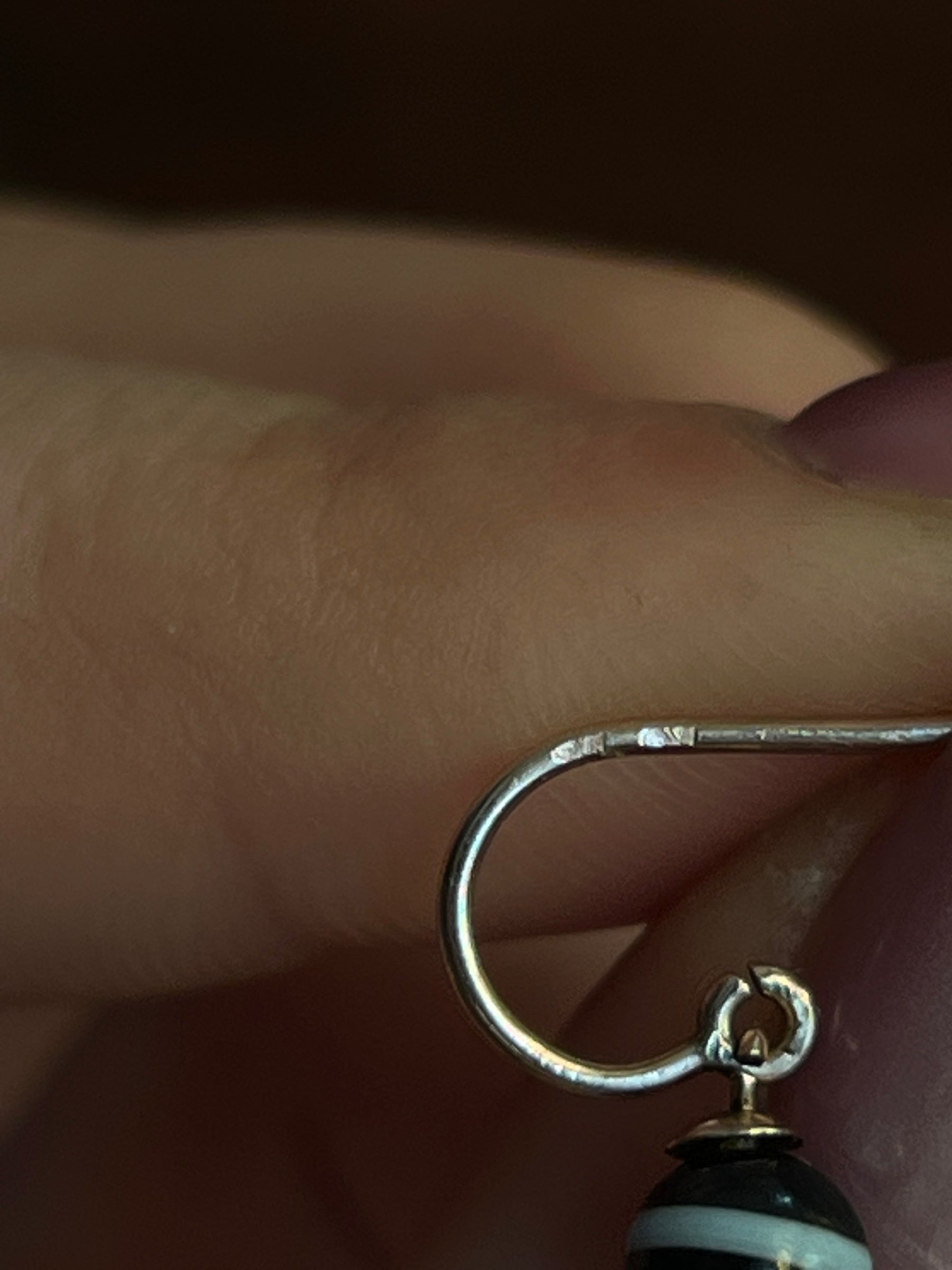 A special pair of agate earrings that have a wonderful passport stamp of travel history! Built in a typical Archaeological Revival construction, they allow the banded agate material to shine. The secret they hold is, in fact, written on the shepherd's hook; while likely made in England (they are in the typical English manner, and test at 15ct gold) they were imported into France, and bear the 14ct French import hallmark (a shell! on each earring)- how superb! I've included some images of original Ancient earrings for you to enjoy in comparison, and draw your own lines of reference in their design and historical placement.