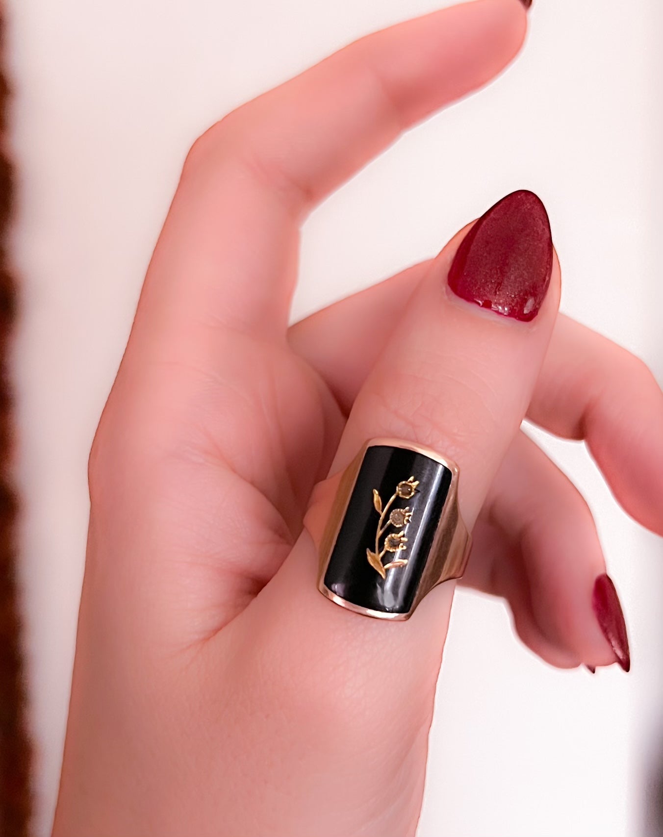 Victorian Onyx and Diamond Gold Inlaid Lily of the Valley Ring