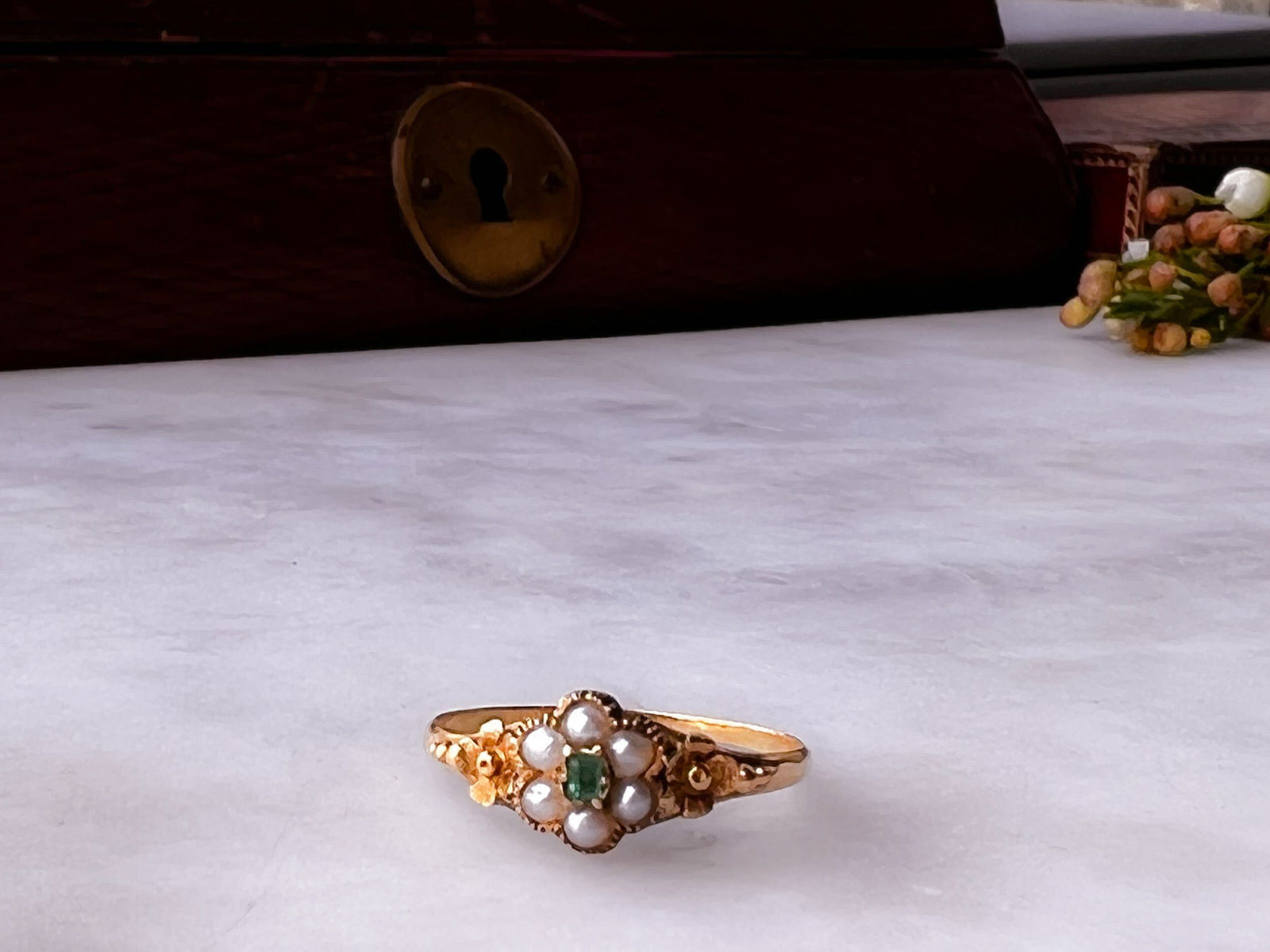 Wonderful 18k Pearl and Emerald Forget-Me-Not Ring