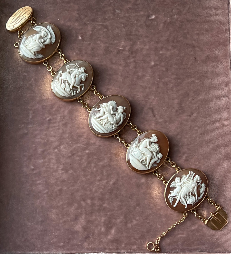 An opulent cameo bracelet containing five individually carved shell scenes and winsomely inscribed “HKH” initial on the clasp. Pieces comprising of multiple cameos, such as this example, were often commissioned by the original owner who would select them from a batch of scenes to be compiled into the jewel of their choosing. Each signet round is individually hallmarked for 14ct, indicating these scenes were initially crafted separately! It may have actually been possible to see these pieces as brooches, earrings, or part of a larger necklace presentation had the original owner chosen to do so, but aren’t we so glad they picked this formation, creating this breathtaking banger of a bracelet, fit for any