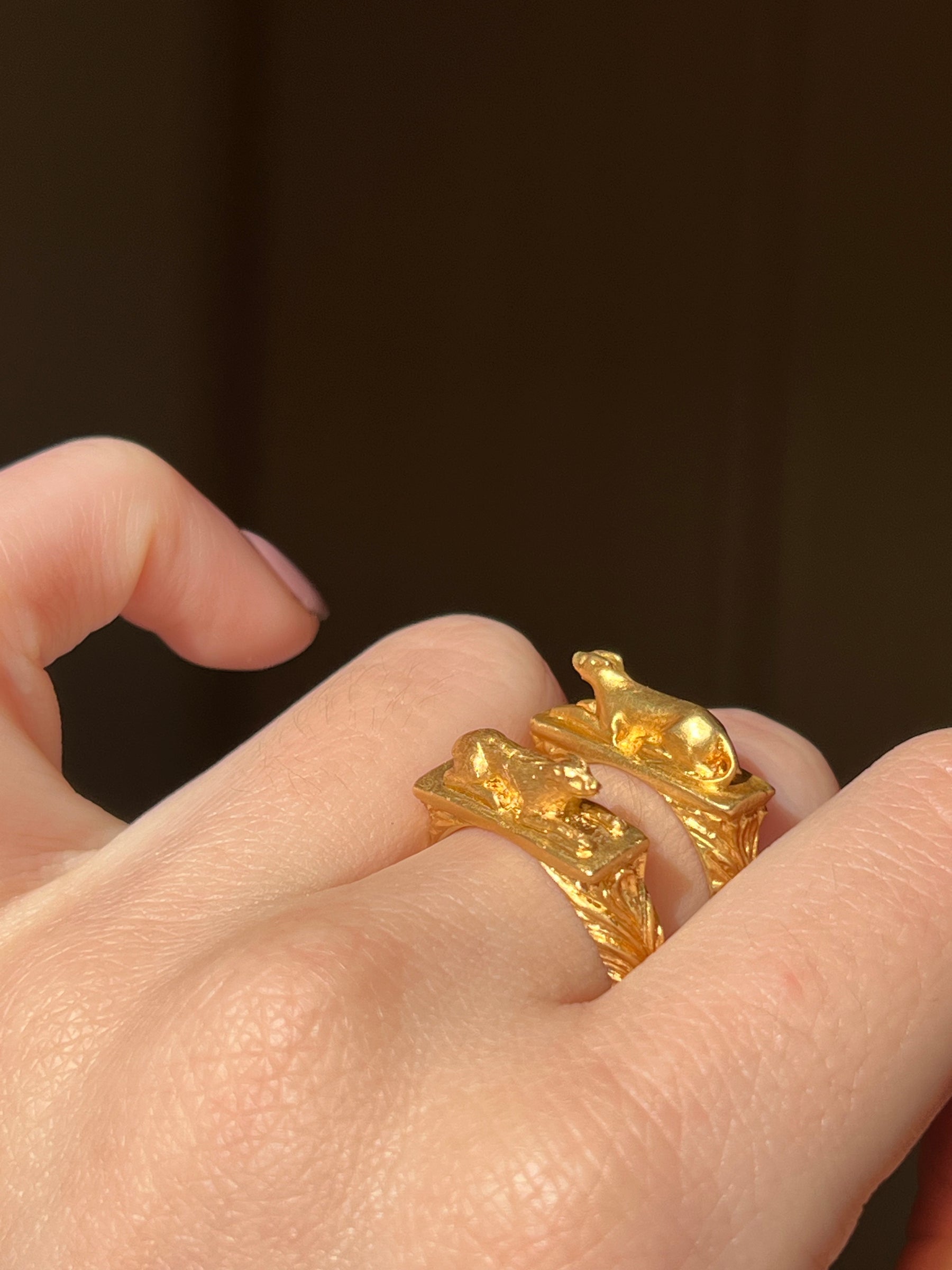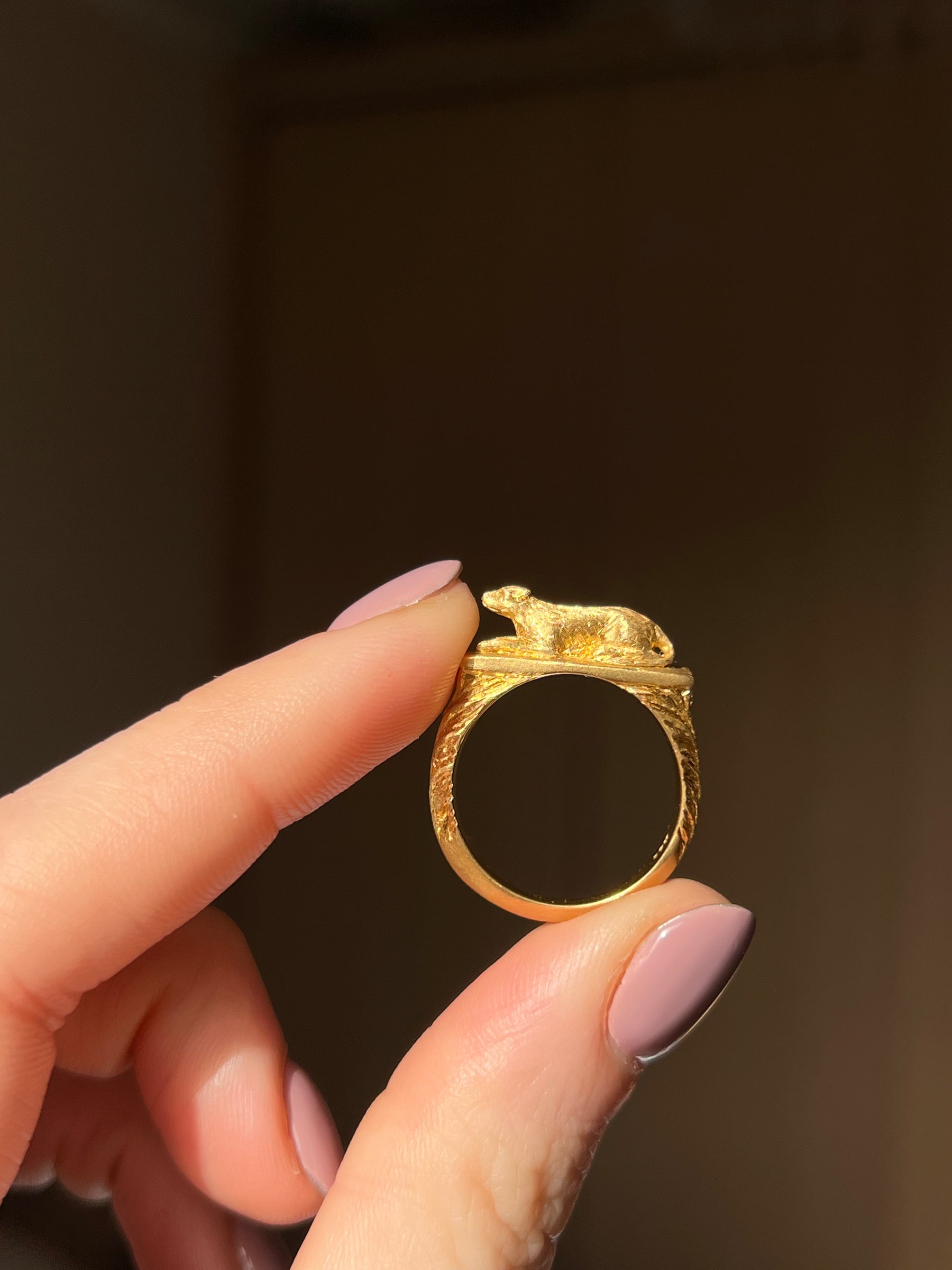 The Celebrated Puppy is one such interpretation of the very best that the ancient world had to offer us, reinterpreted for the modern era. Featuring a beautiful dog, seated atop a thin, rectangular plinth, celebrated with floliate designs. The ring is based on an 18th century Marine Ivory example from my personal collection, hand hewn at sea by a careful sailor.