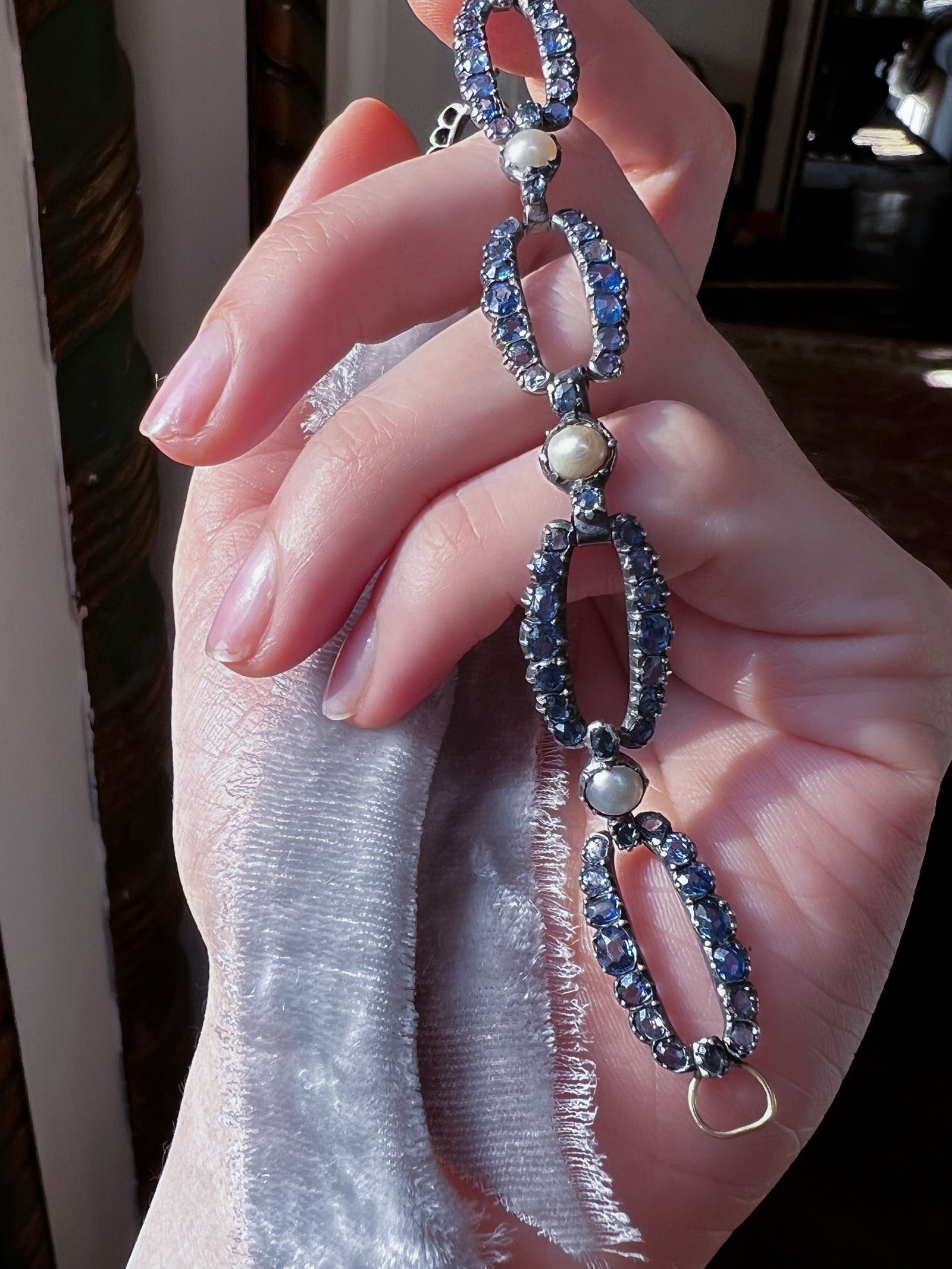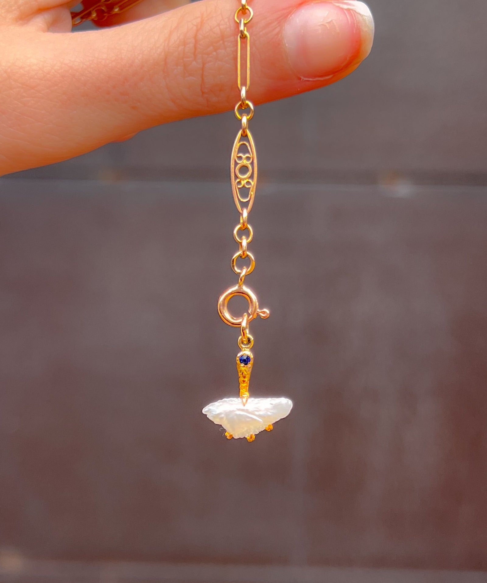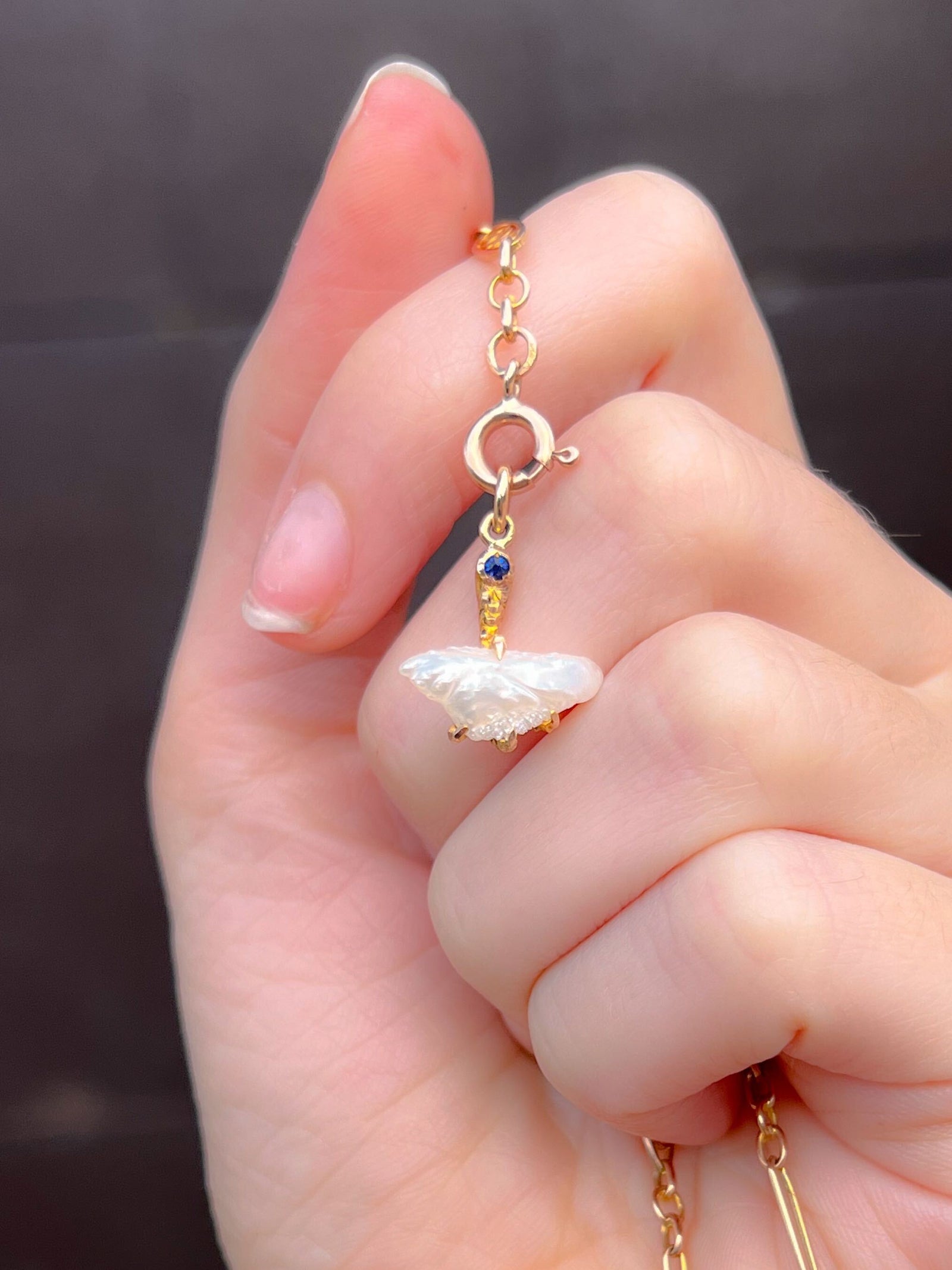 Born of a nineteenth-century necklace discovered in Paris, reimagined for modern temptation. Nine luminous 9mm cultured pearls form her celestial map, strung together by countless seed pearls. Her 10ct gold double-pearl clasp allows endless play: connect her to a pendant, twist her twice about the throat, or fasten her to a favorite brooch for an operatic flourish. Even link one Eloise to her matching bracelet—or to another Eloise, should your appetite demand it.