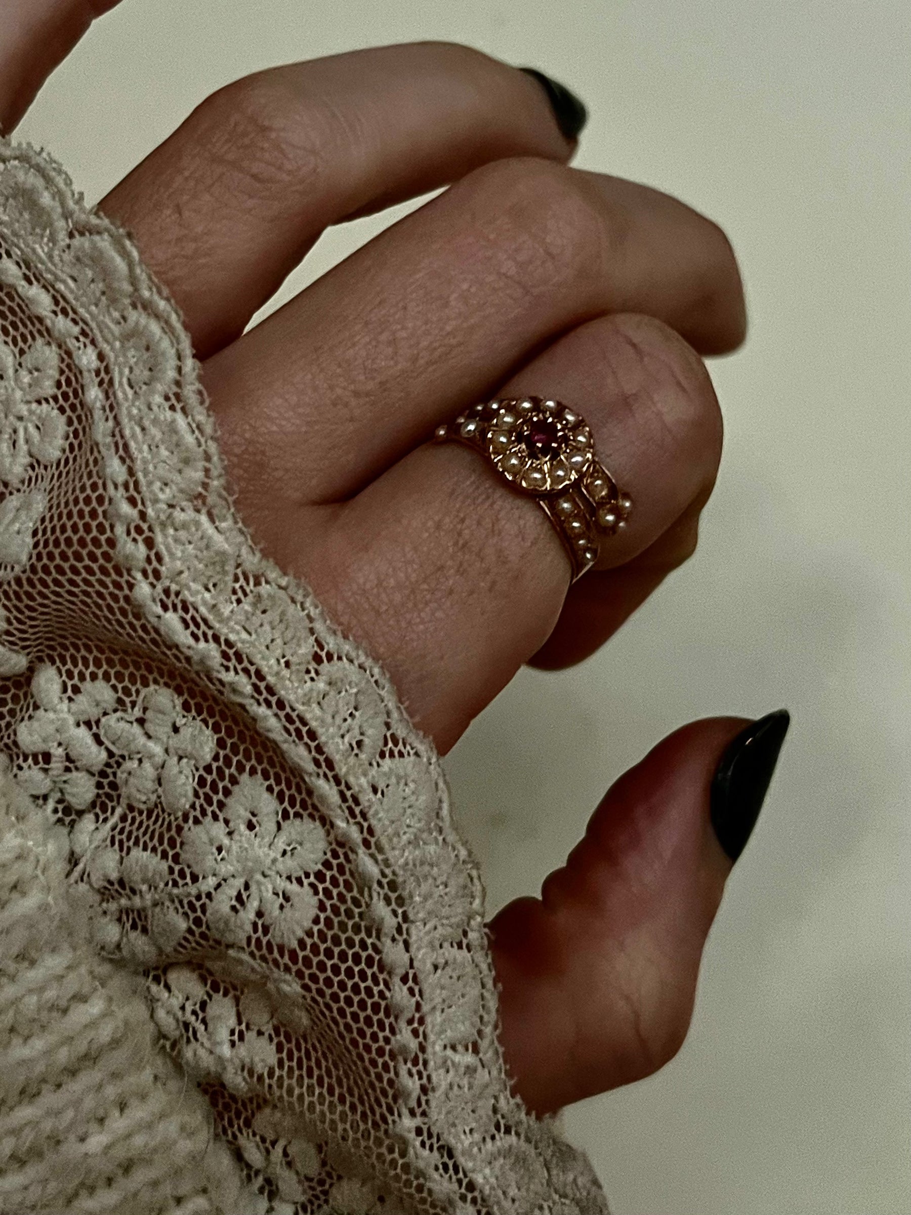An exceptional pink 18ct French ring with a floral bomb seated between two rows of bypassing pearl branches that culminate in three leave'd clovers. This outstanding ring with her arching prongs and spike set pearls is an all original example of French craftspersonship from the 1860's. I love this example, and the shining luster of each pearl.