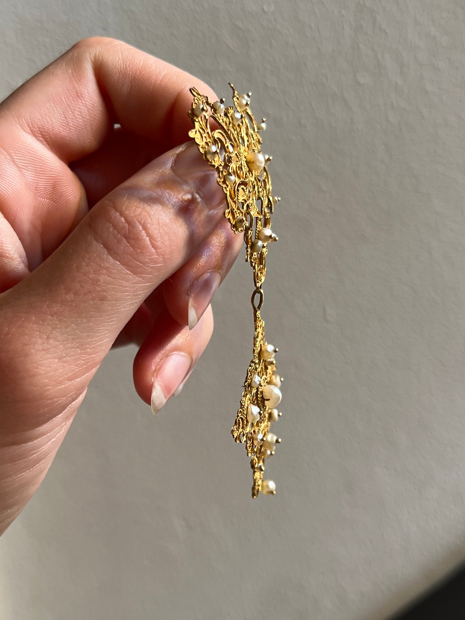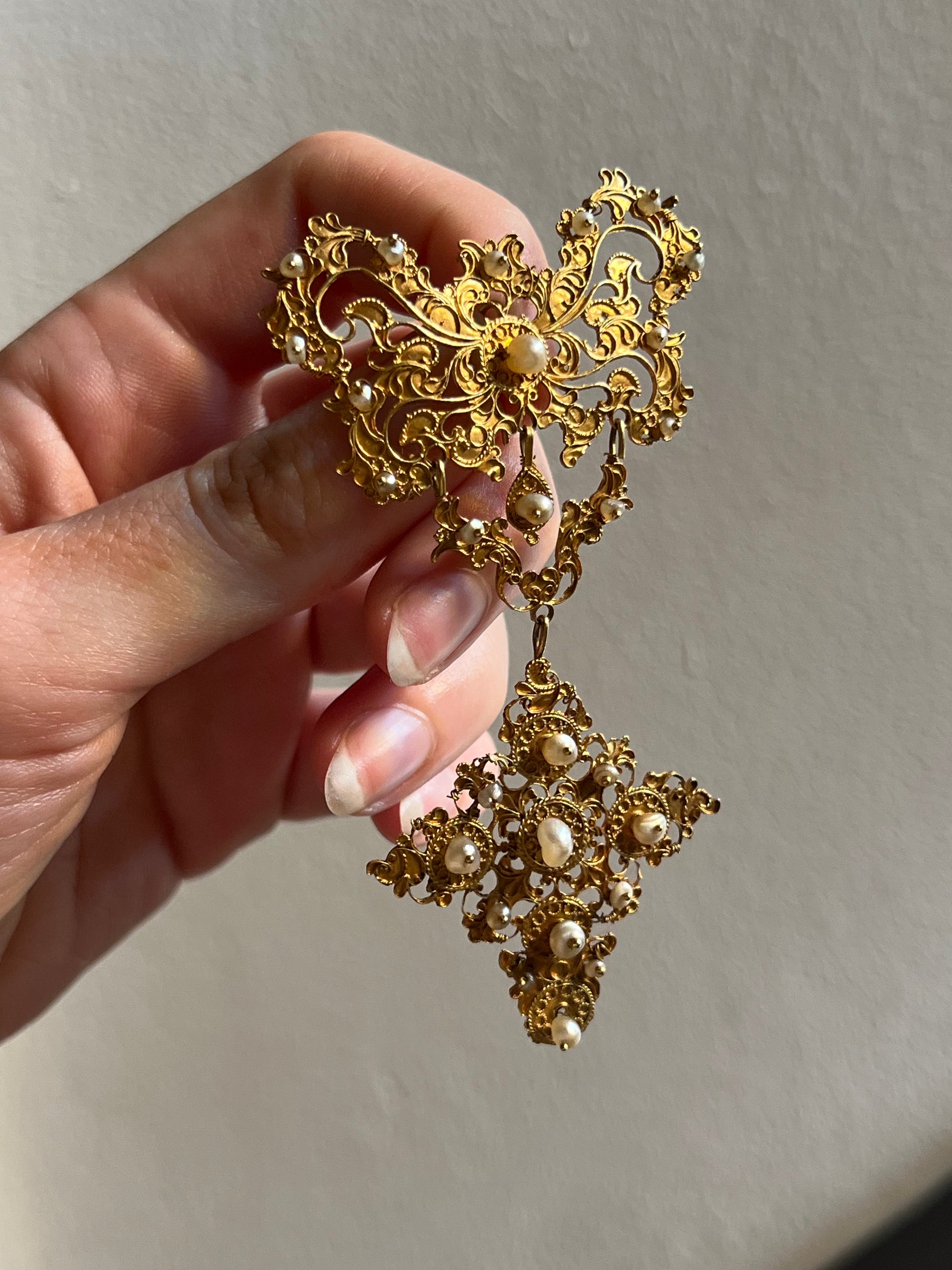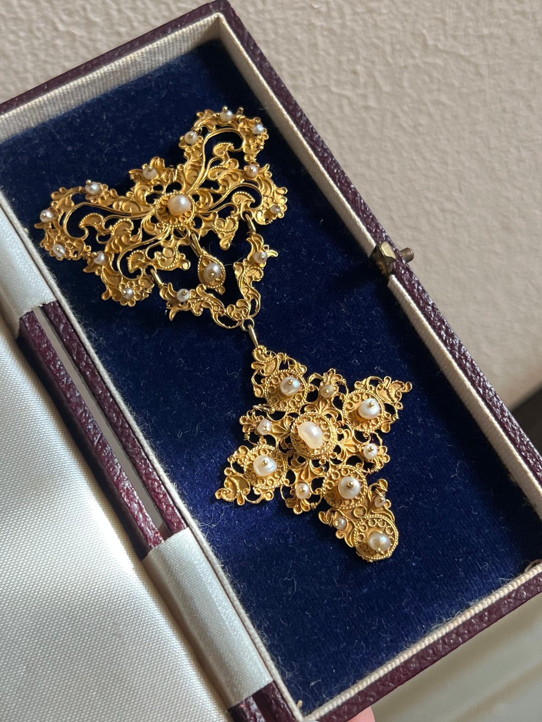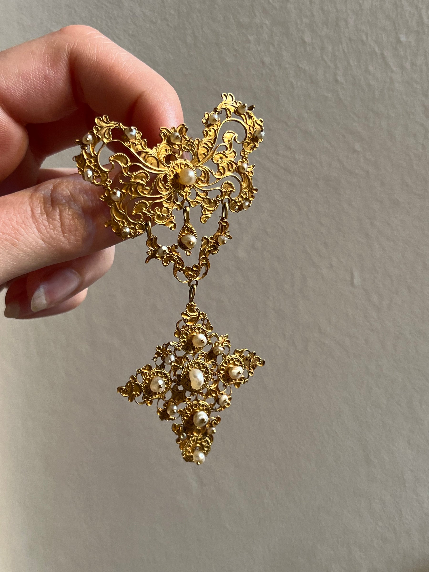 Truly one of the rarest objects we’ve ever had the pleasure of handling, this outstanding late 17th century stomacher is in 20ct gold with outstanding natural pearls. Made of what feels to be the gold forging of faeries, this outstanding Stomacher will be a crowning jewel in your collection, from the coveted 1680’s-1700 period. Needless to say, pieces from this era are elusive; and to find an all original English example is simply mesmerizing. Add it to a chain or simply hook to the front of your bodice for the desired effect.