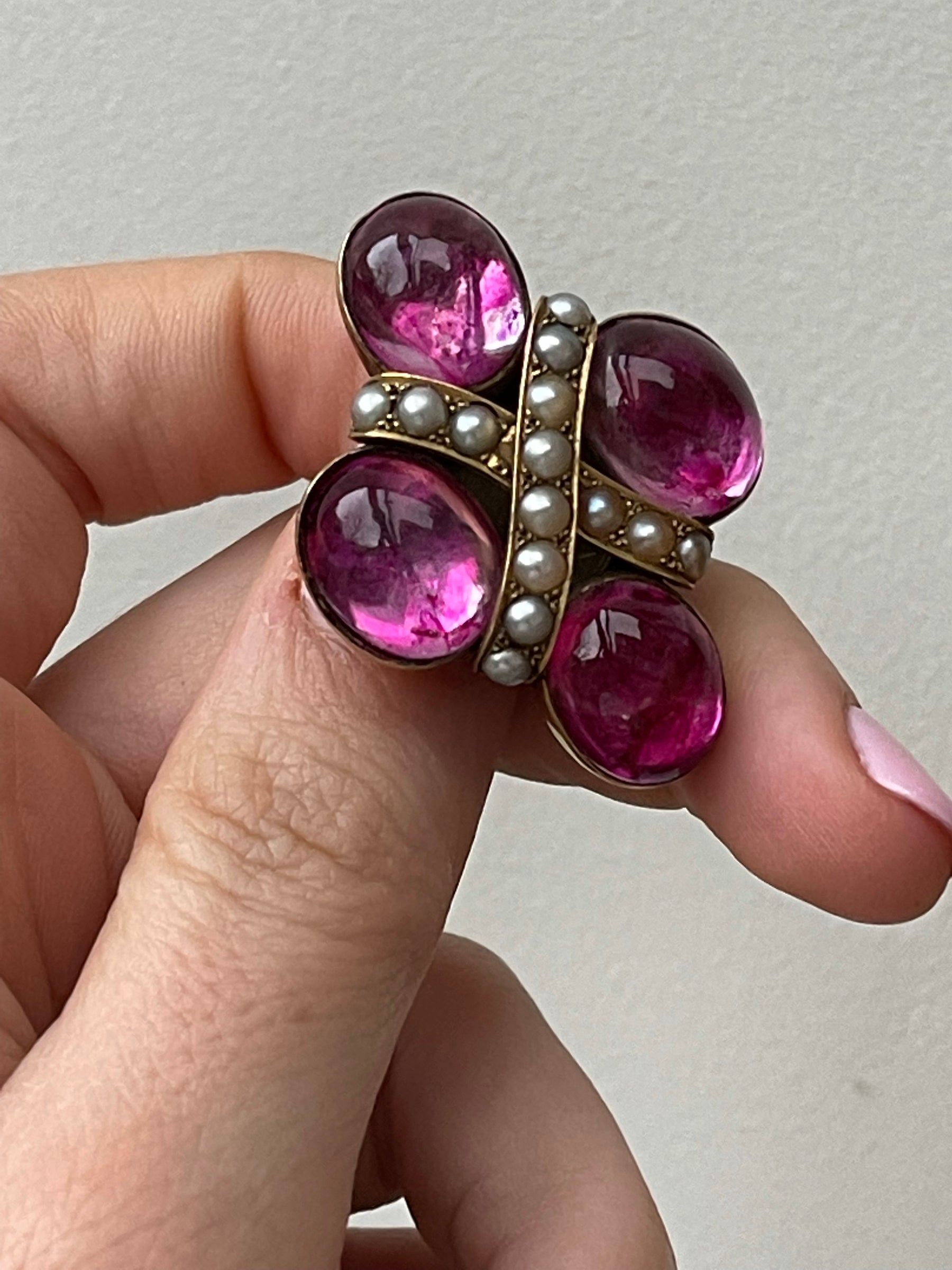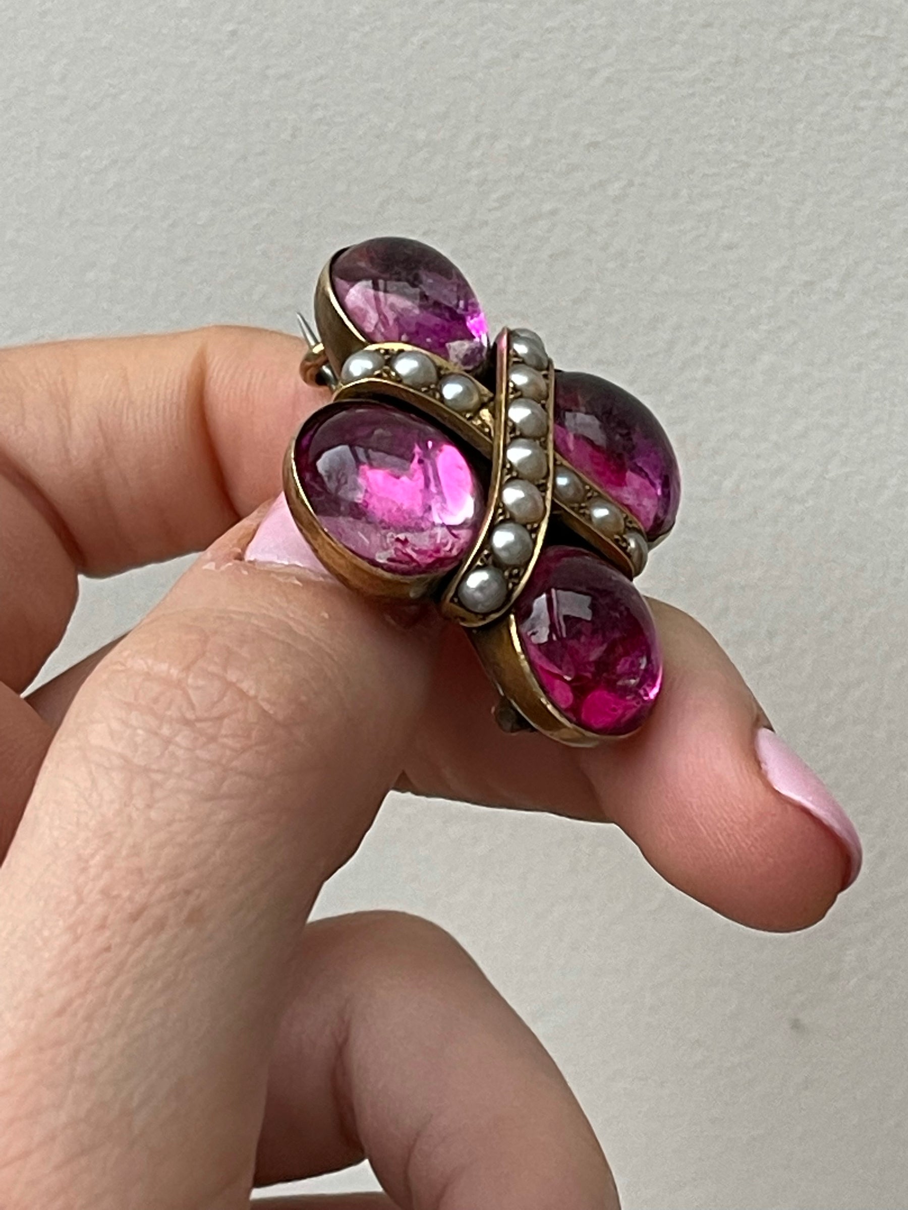 This Victorian example features four vivid pink crystals, almost seeming like water droplets. In between the stunning crystals are delicate, stunning pearls, creating an "X." Additionally, this brooch is convertible in the way it serves as a pendant and features an extension fitting.