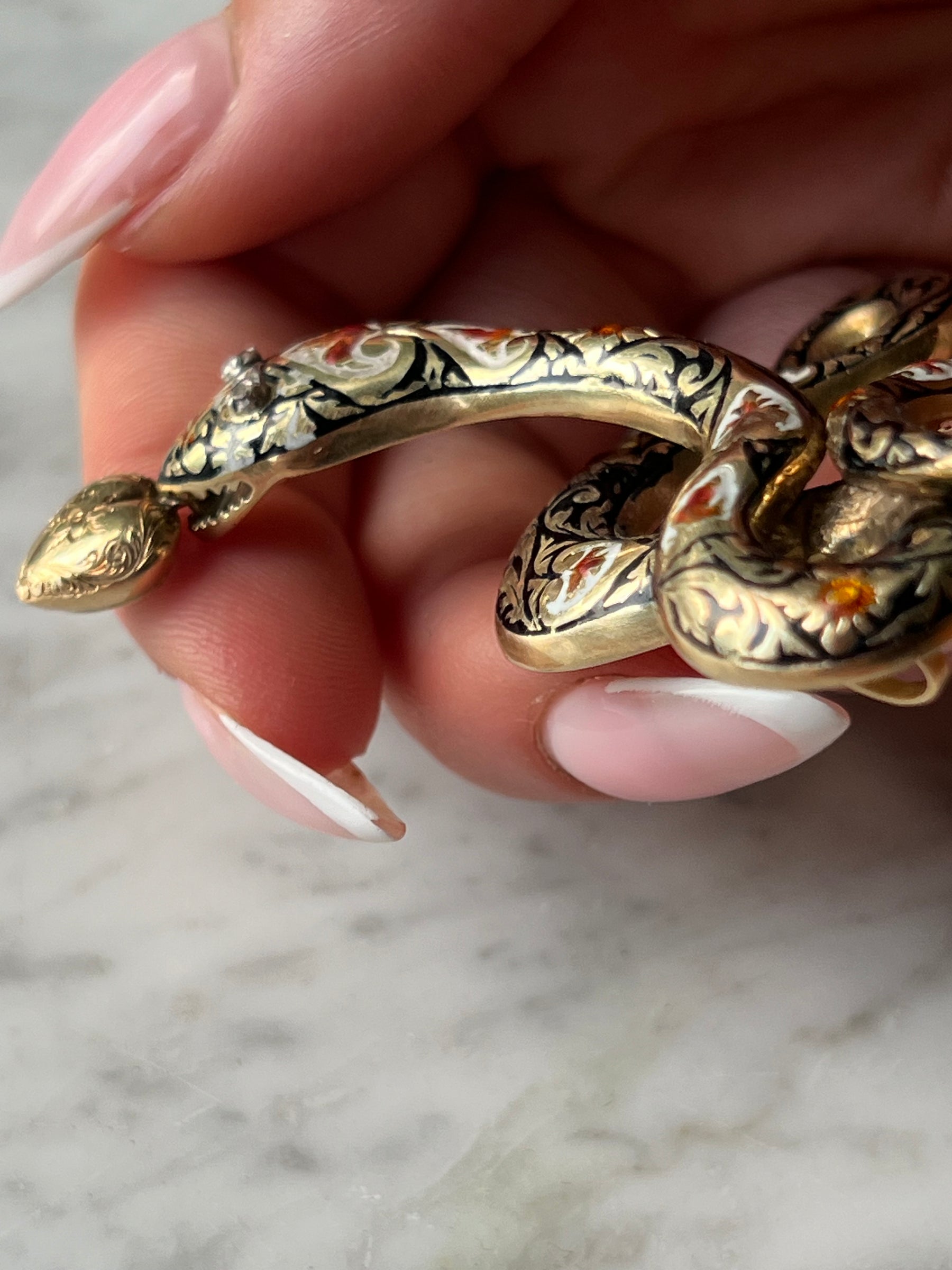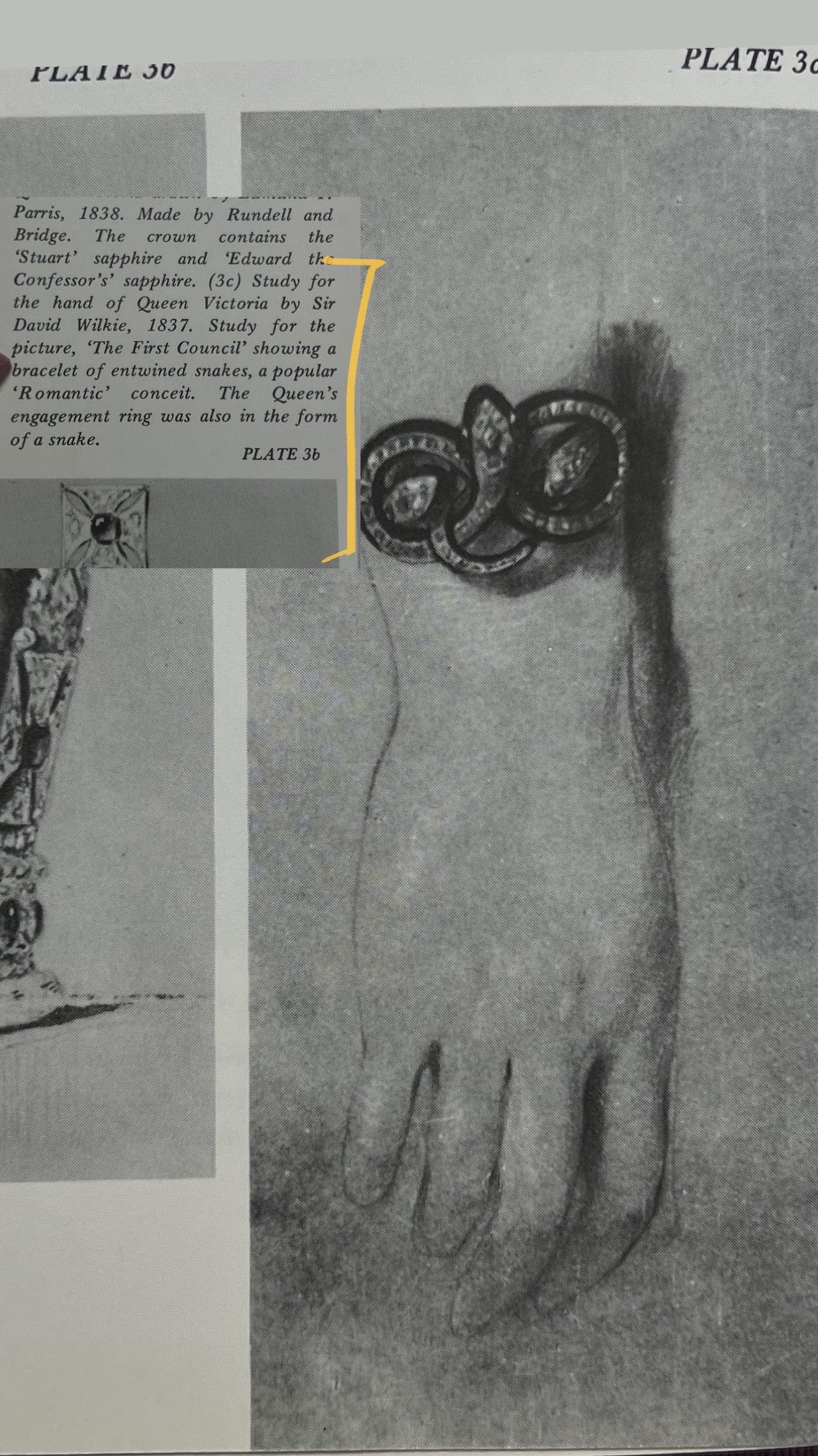 Our incredible snake is likely a close contemporary to a snake bracelet sketched in 1837 for Queen Victoria’s portrait The First Council, giving us an unusually precise historical link. The completed work (1838) was by David Wilkie. Spend some time staring at his little teeth!