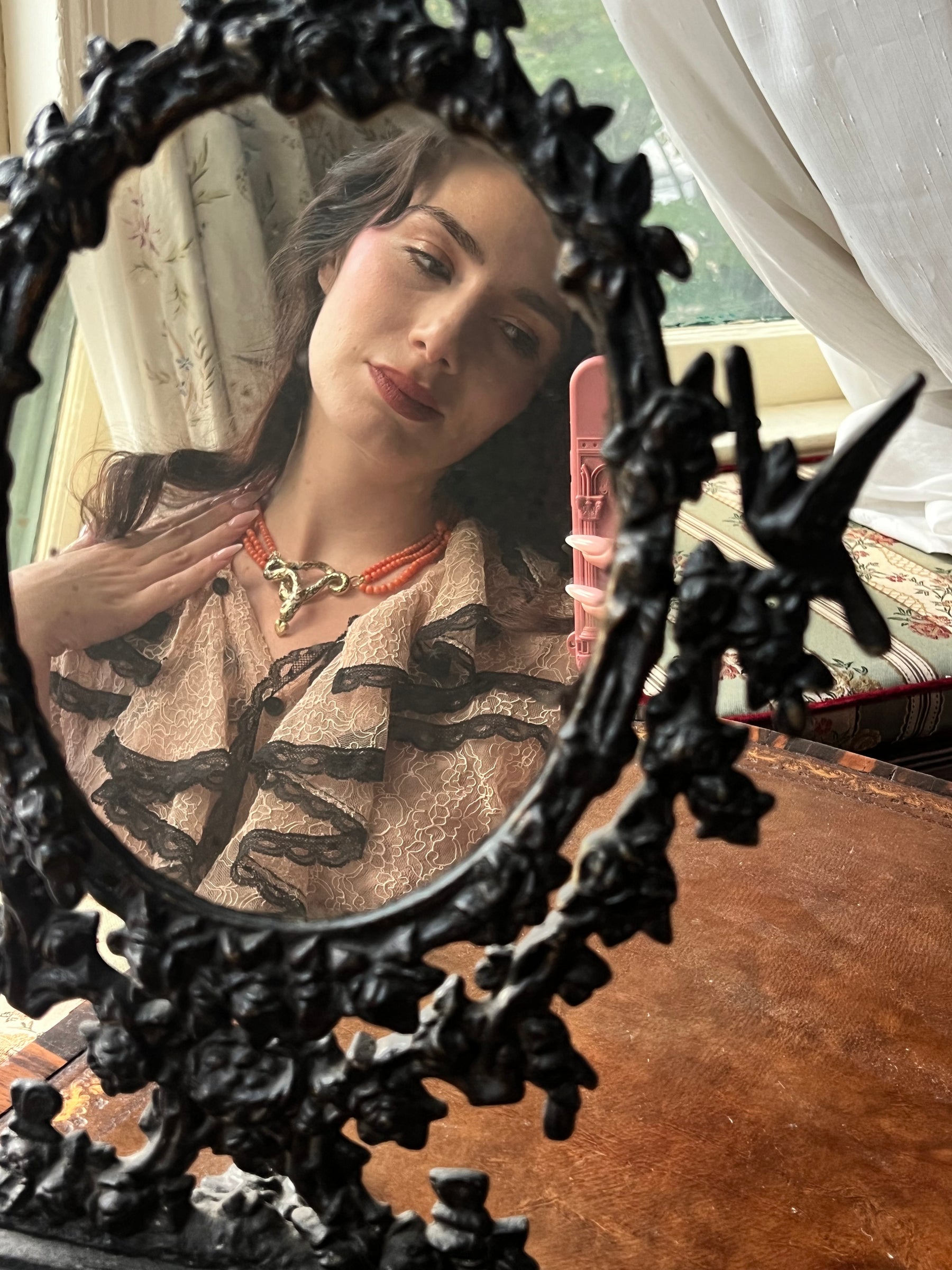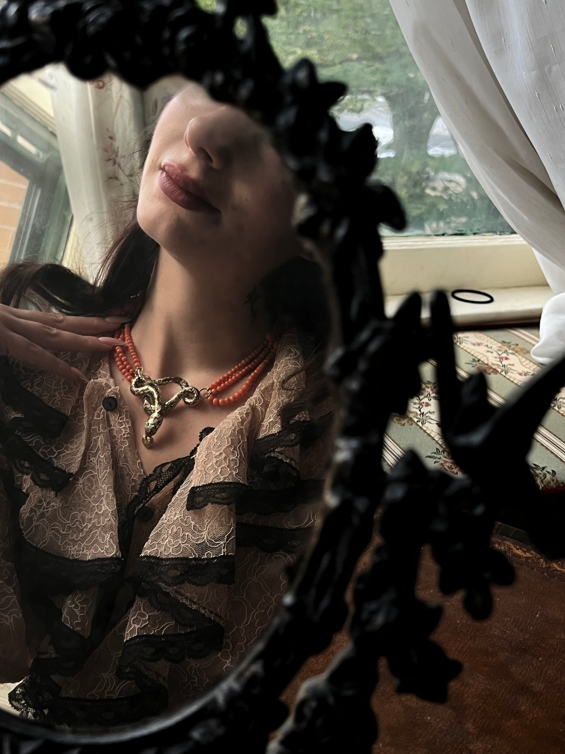 With three hooks on the reverse, the snake becomes a modular wonder: the coral necklace and the snake can be worn together or separately, and each element can be combined with other pieces; the snake with all of your necklaces (hello Eloise!) and chains, the collar with every brooch in your collection. A deeply collectible object, underscoring that the modular jewelry wardrobe is not a modern invention.