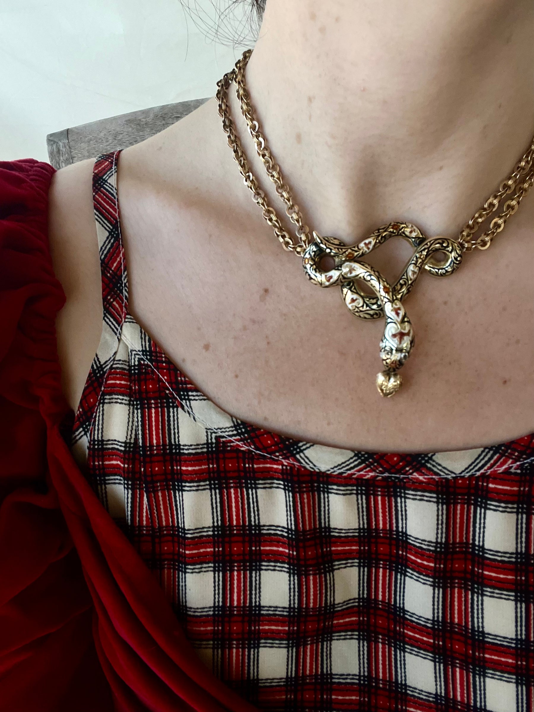 A remarkable pairing: a Sicilian coral collar and a dramatic enamel 18ct snake center piece—originally a brooch—presented as a remarkable 1830s set. The snake, in a rare colorway of coral, black, and white enamel, holds a golden heart locket in its mouth, and sits at the center of a fabulous necklace from Sicily, still in their original swagger collar format.