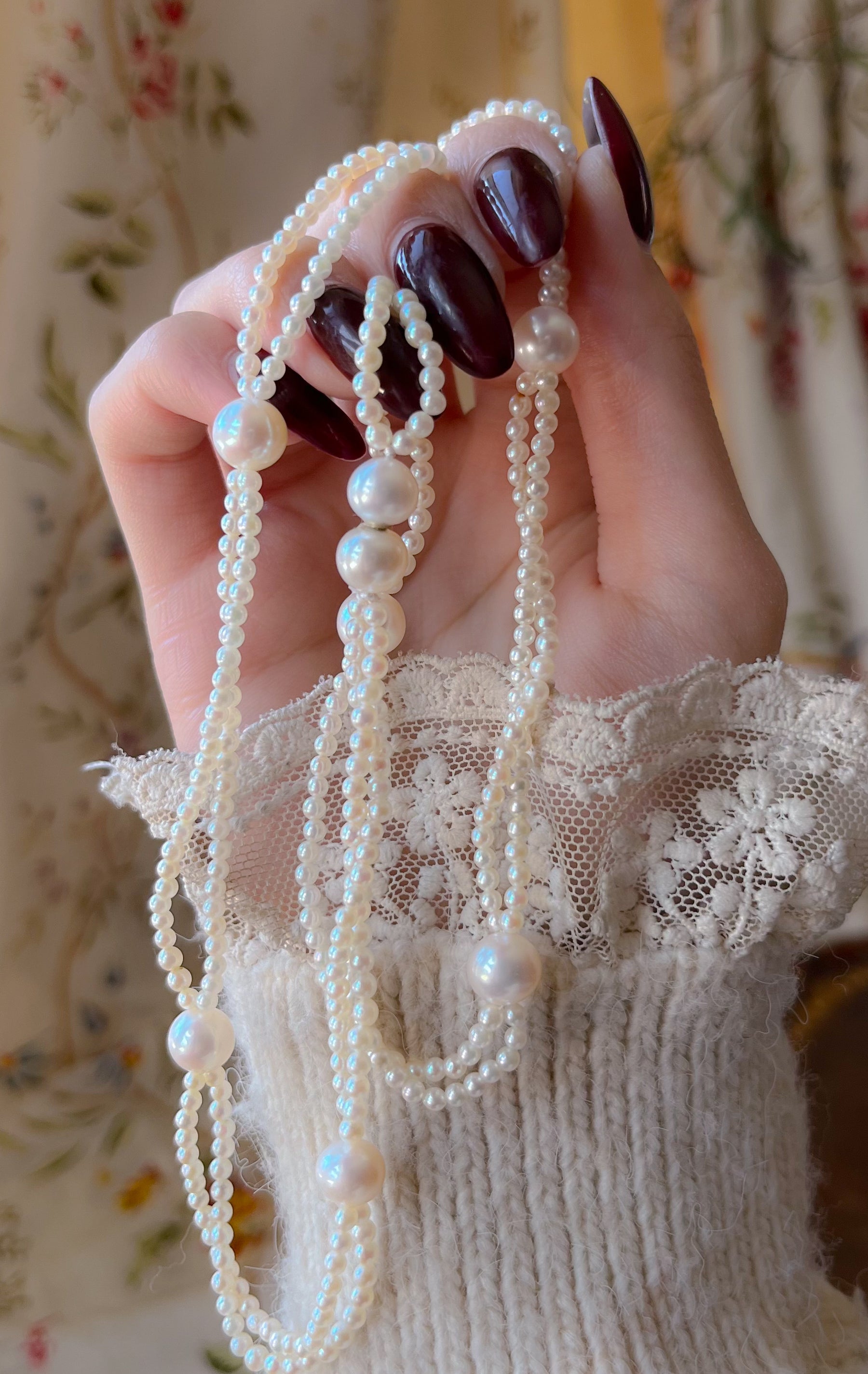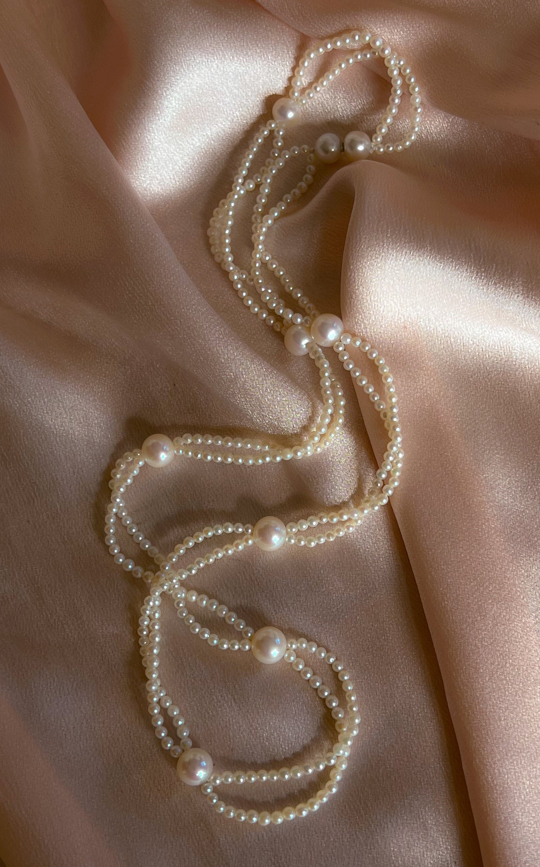Enter, the Eloise. Eloise, Eloise, Eloise! Based on a victorian pearl necklace I acquired in Paris last year, I designed the Eloise to do it all for you. With nine beautiful, large scale 9mm oval Japanese cultured pearls, and hundreds of smaller seed pearls connecting these orbs like an astrological constellation, the strand will fit every wardrobe, and effortlessly integrate into your jewelry box. With a double pearl screw top clasp, you can adjust the strand to accommodate your favorite pendant, double wrap if you'd like, or connect to brooches and other beautiful chains in a myriad of component presentation. She is at home across the décolletage of an English noble-woman, as she is swung round the neck of a roguish rockstar, or strung into the braids of a nymph, eager to frolic. I love the Eloise, she may be the most special jewel I’ve yet created.