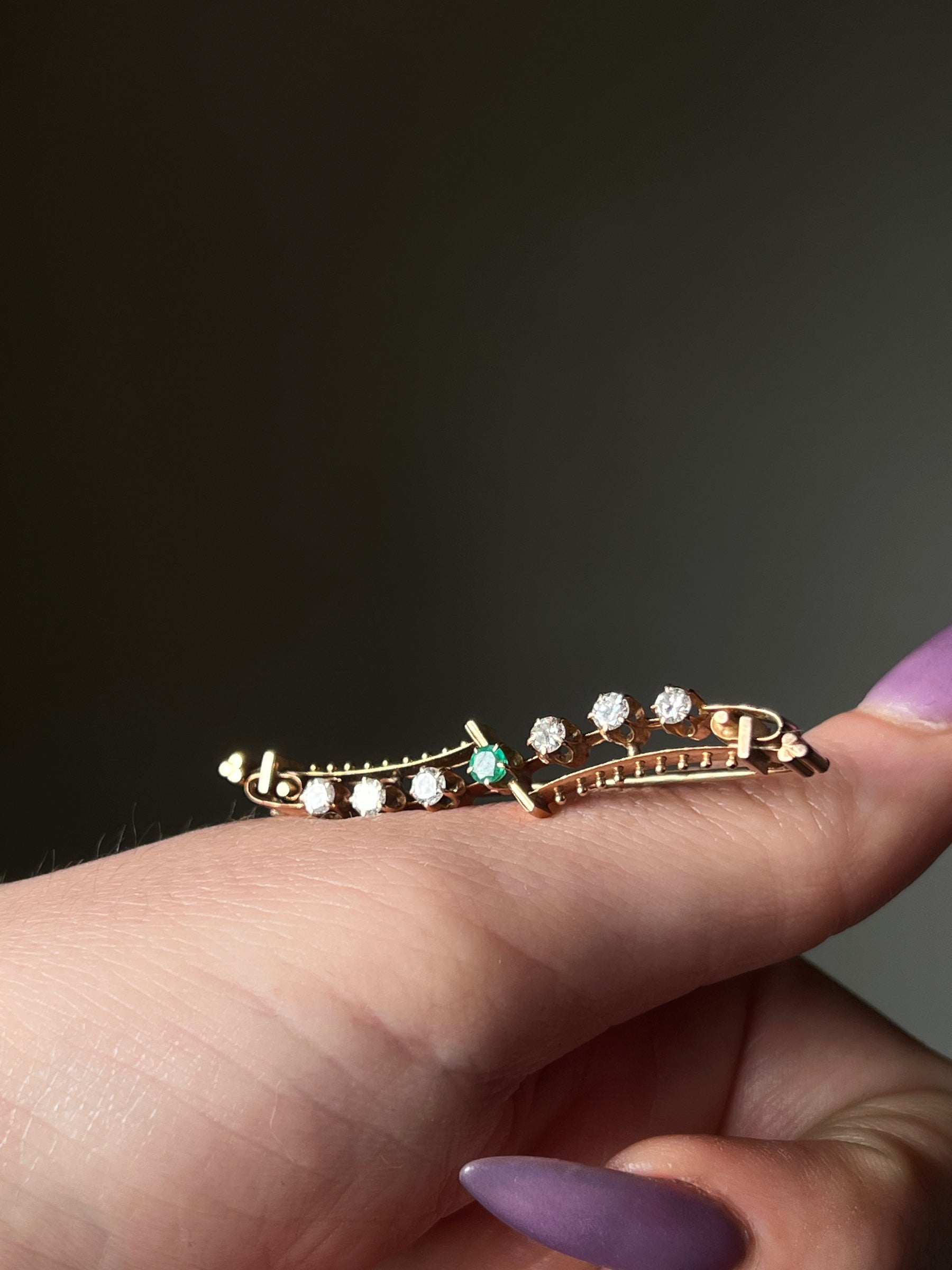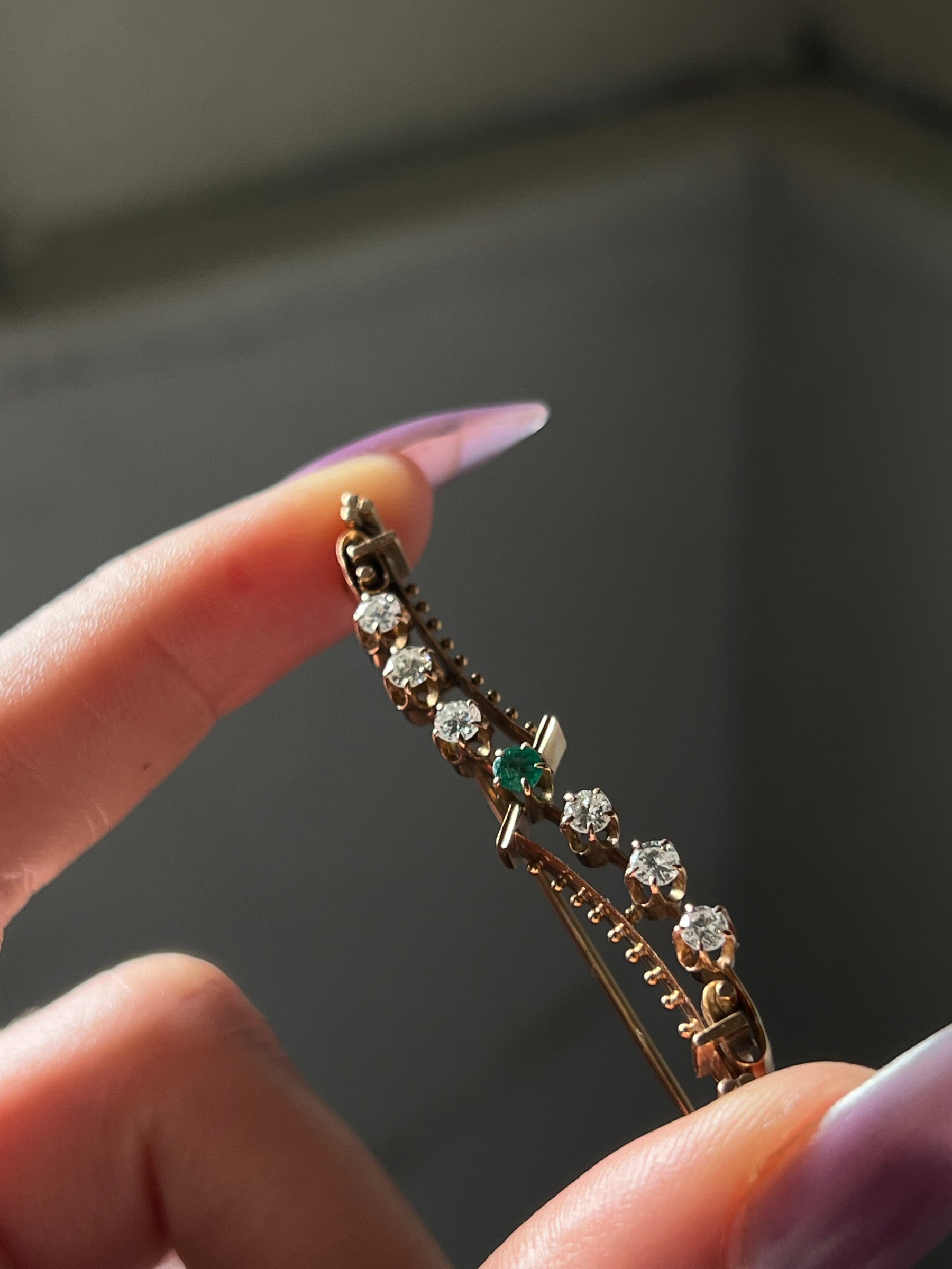 This Diamond and Emerald brooch is a truly gorgeous 19th century American example. Crafted circa 1870 in a lovely 14 carat pink gold, this brooch exhibits fretwork: an architectural element that was made predominantly in San Francisco in the 1870’s. This is notable because the 1870’s was the height of the Aesthetic Movement, which held a significant influence on architectural and jewelry design.