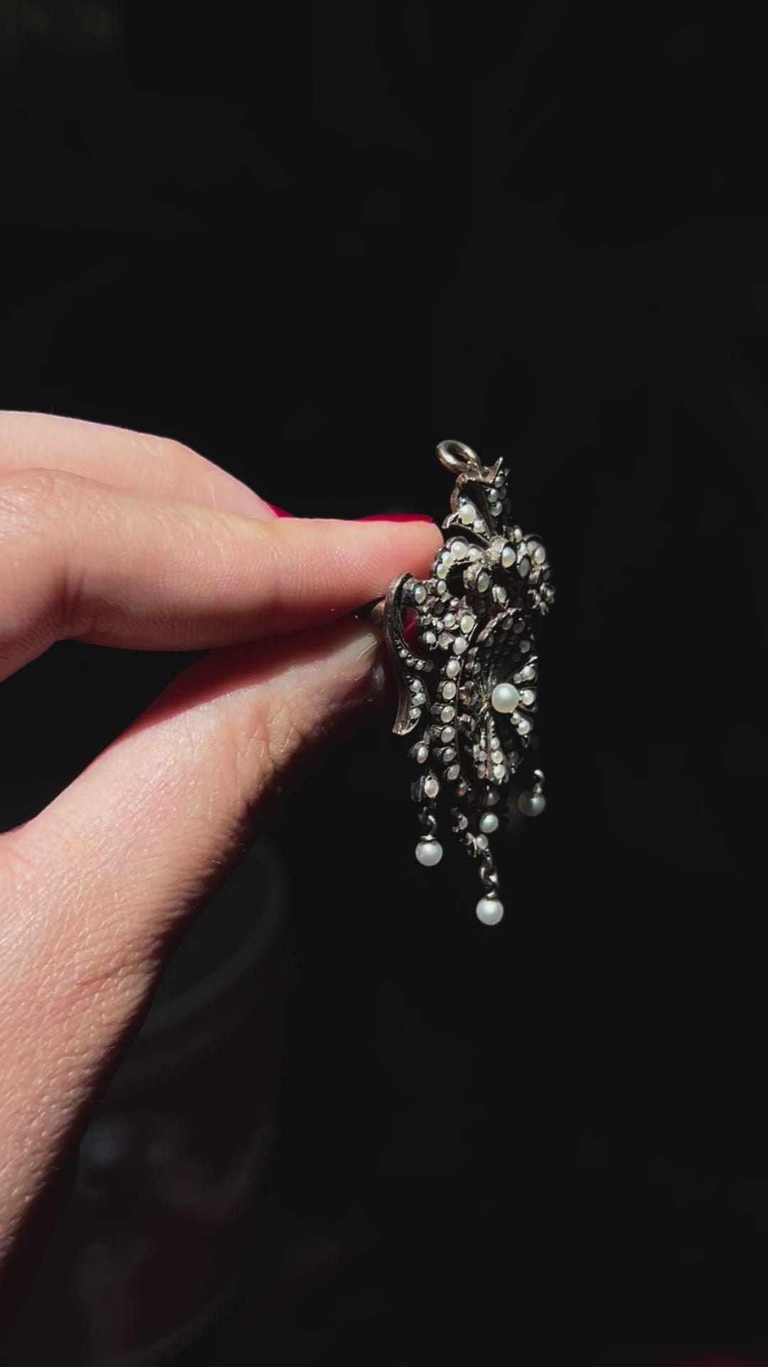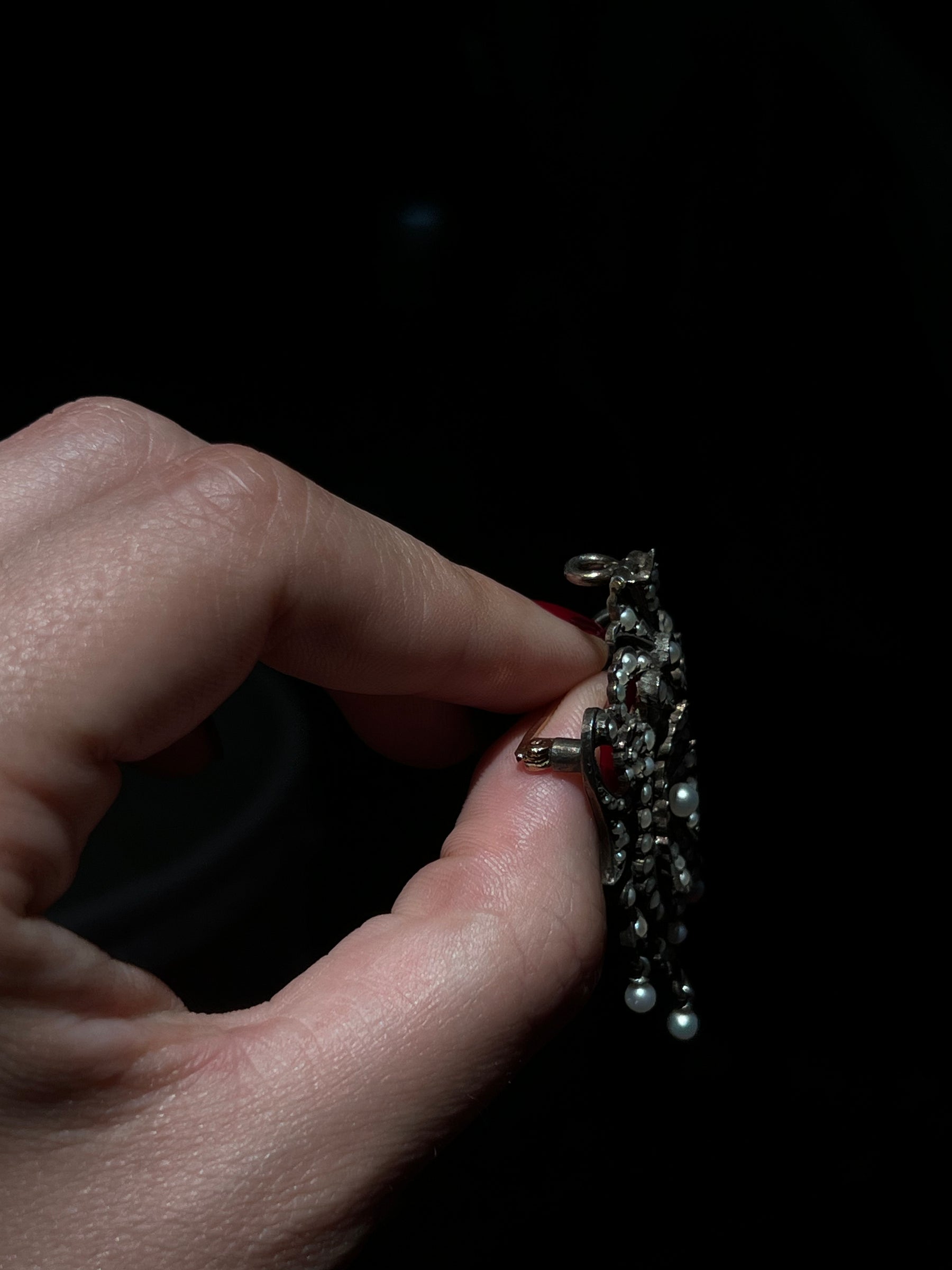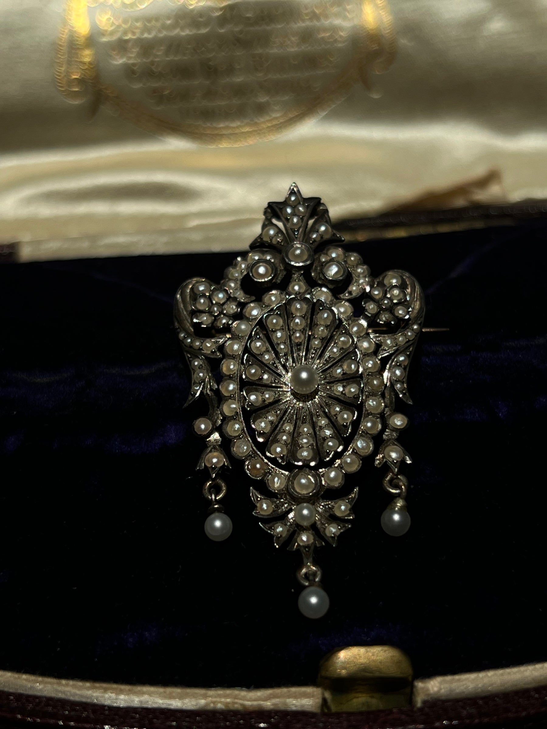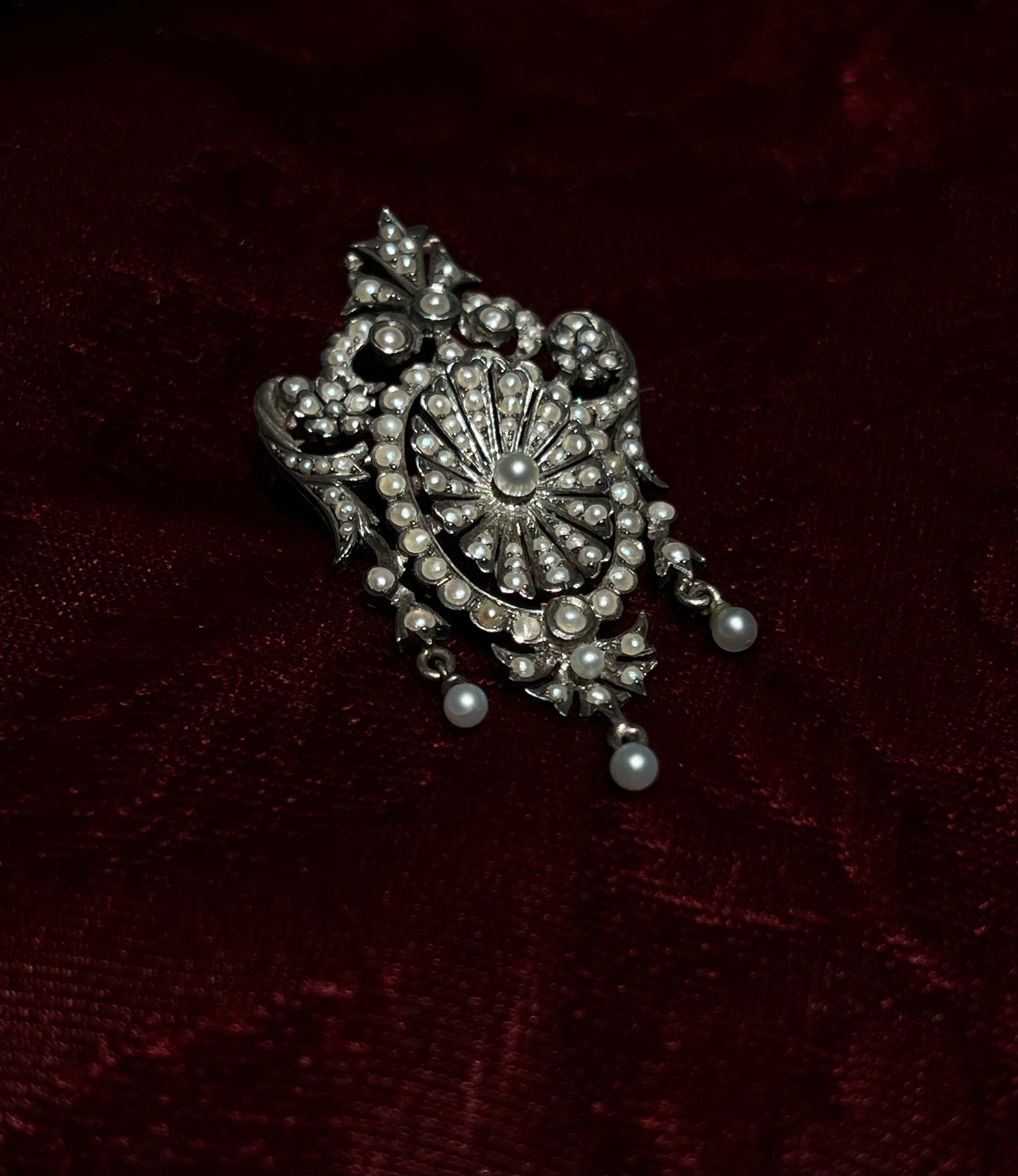 This brooch is lavishly decorated with 118 seed pearls of varying sizes, terminating in three dainty dangler drops at the base. The antique seed pearls on this piece are truly expectational, for they are a natural stone – which can be seen in the luminescent dappling and diverse shapes.