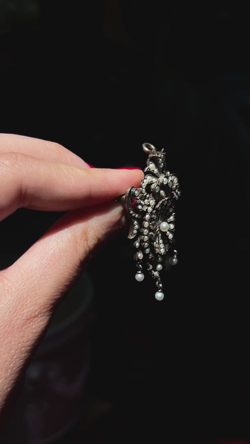 This elaborate 19th century French brooch is a pinnacle of Victorian craftspersonship and artistry. Crafted in sterling silver and a sweet 18 carat pink gold, this brooch possesses that je-ne-sais-quoi that simply stands out amongst the rest!