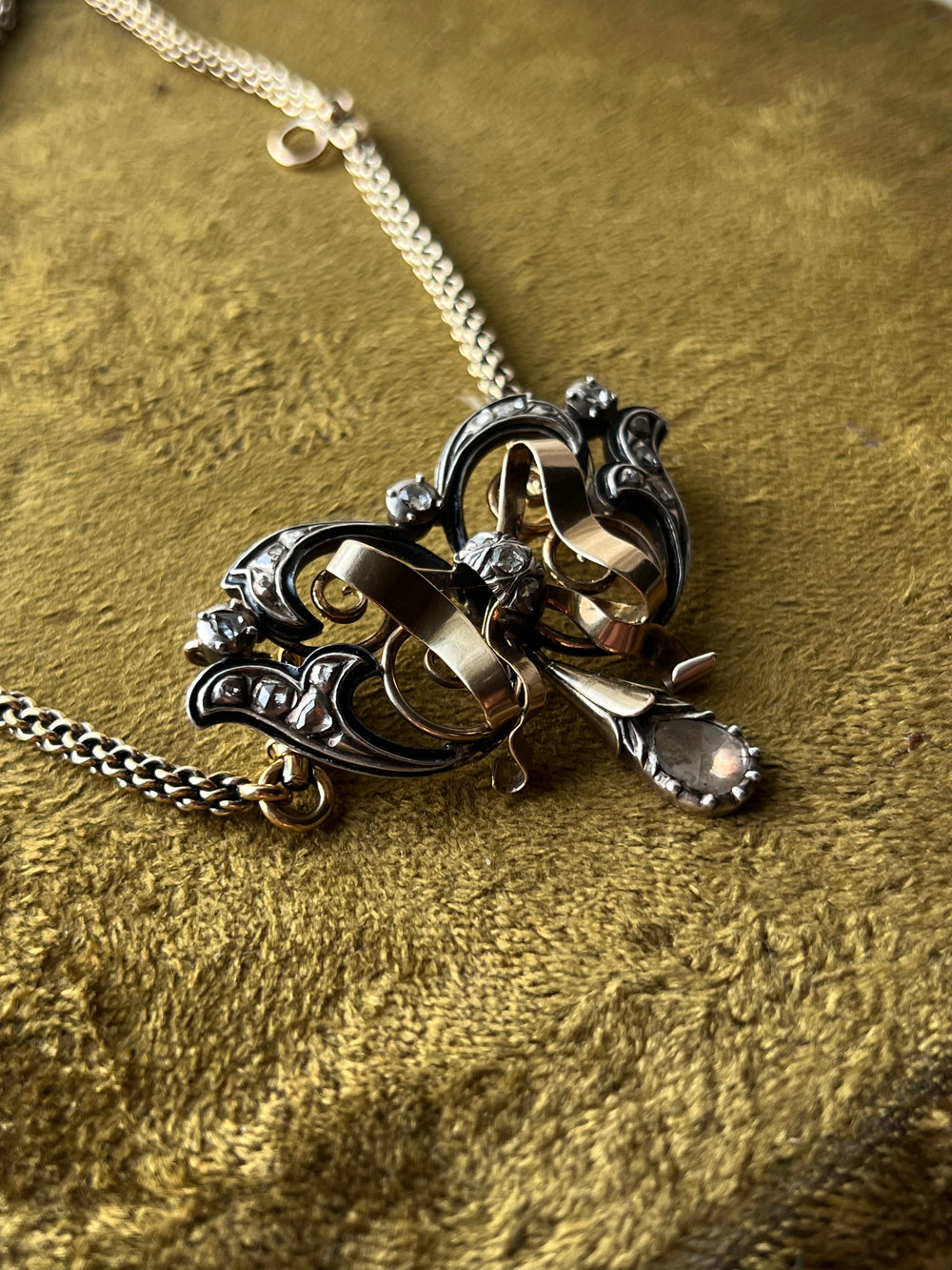 19th Century Rose Cut Diamond and Enamel Bow Brooch