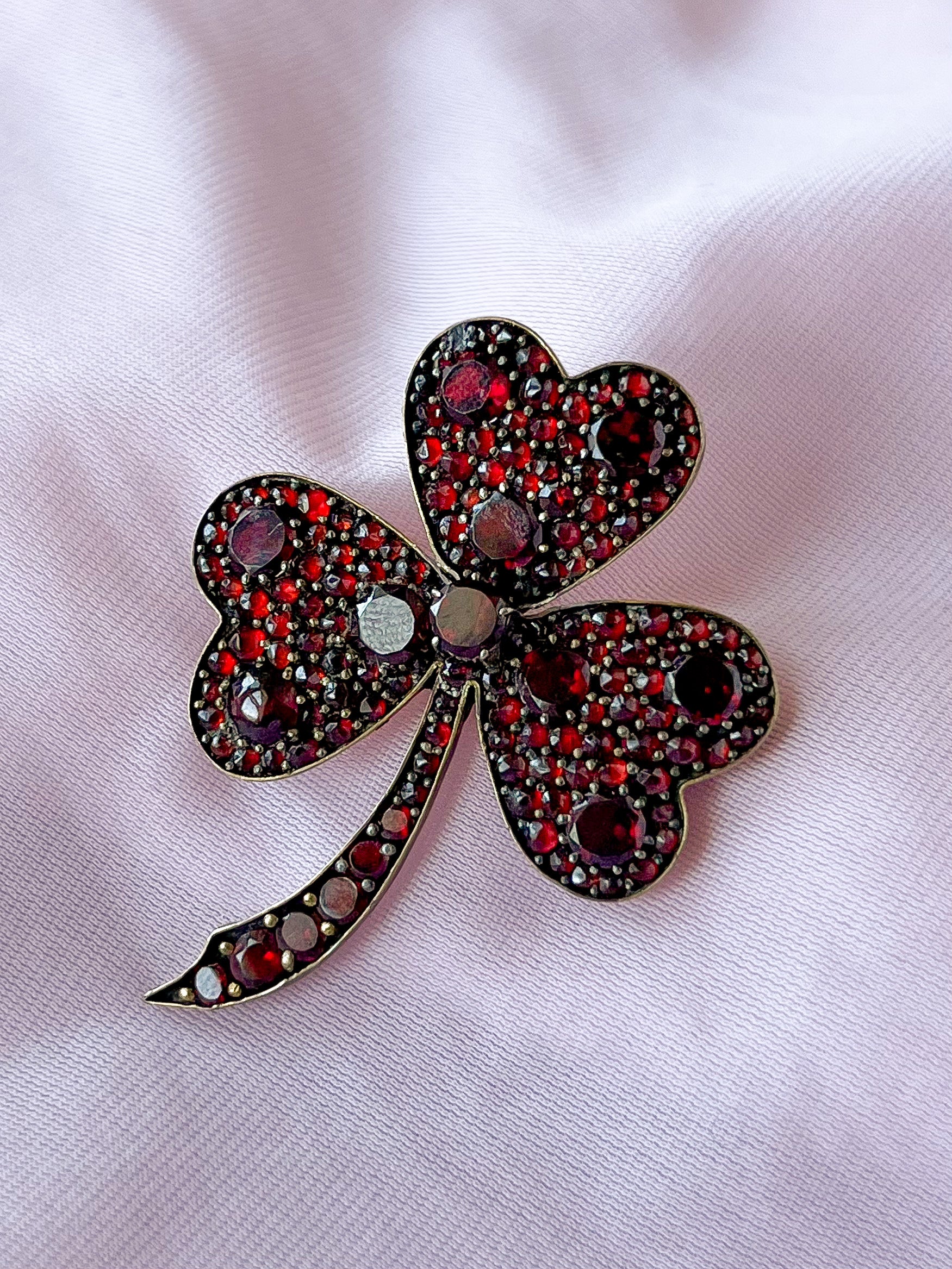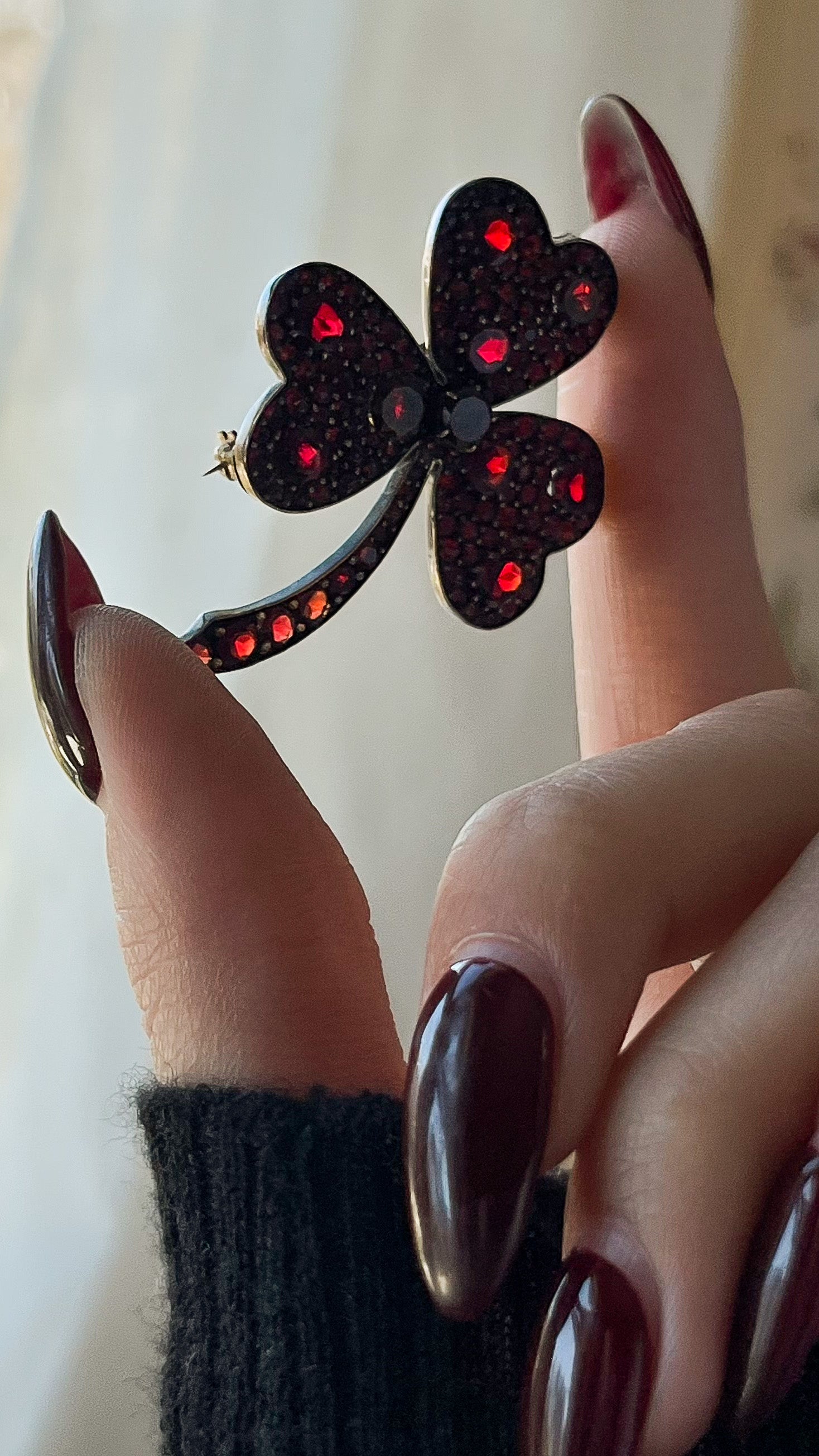 This endearing Edwardian three leaf clover brooch containing both flat cut and pavé set gems, is just fabulous. In the Edwardian era, clovers were a beloved symbol of good luck, easily finding their way into many jewelry designs. The three delightful leaves of the clover were believed to represent the heartwarming values of hope, faith, and love, making it a deeply meaningful and sentimental choice for jewelry. Clover jewels were more than just a symbol of good luck; they also served as a joyful reminder to keep hopeful and stay positive, even when times were tough. It's worth noting that different colors of clovers have different meanings as well. In an effort to produce a bold and bright red color, the stones of this piece were clustered together in a pavé setting, allowing for the richly hued shine of the garnet to create this bright red clover. Red symbolized hope and industry, so if you are about to embark on a new business venture, let this clover serve as your totem. This brooch is truly remarkable, and I’m dreaming of seeing it on a cream or black blazer lapel at your next opening.