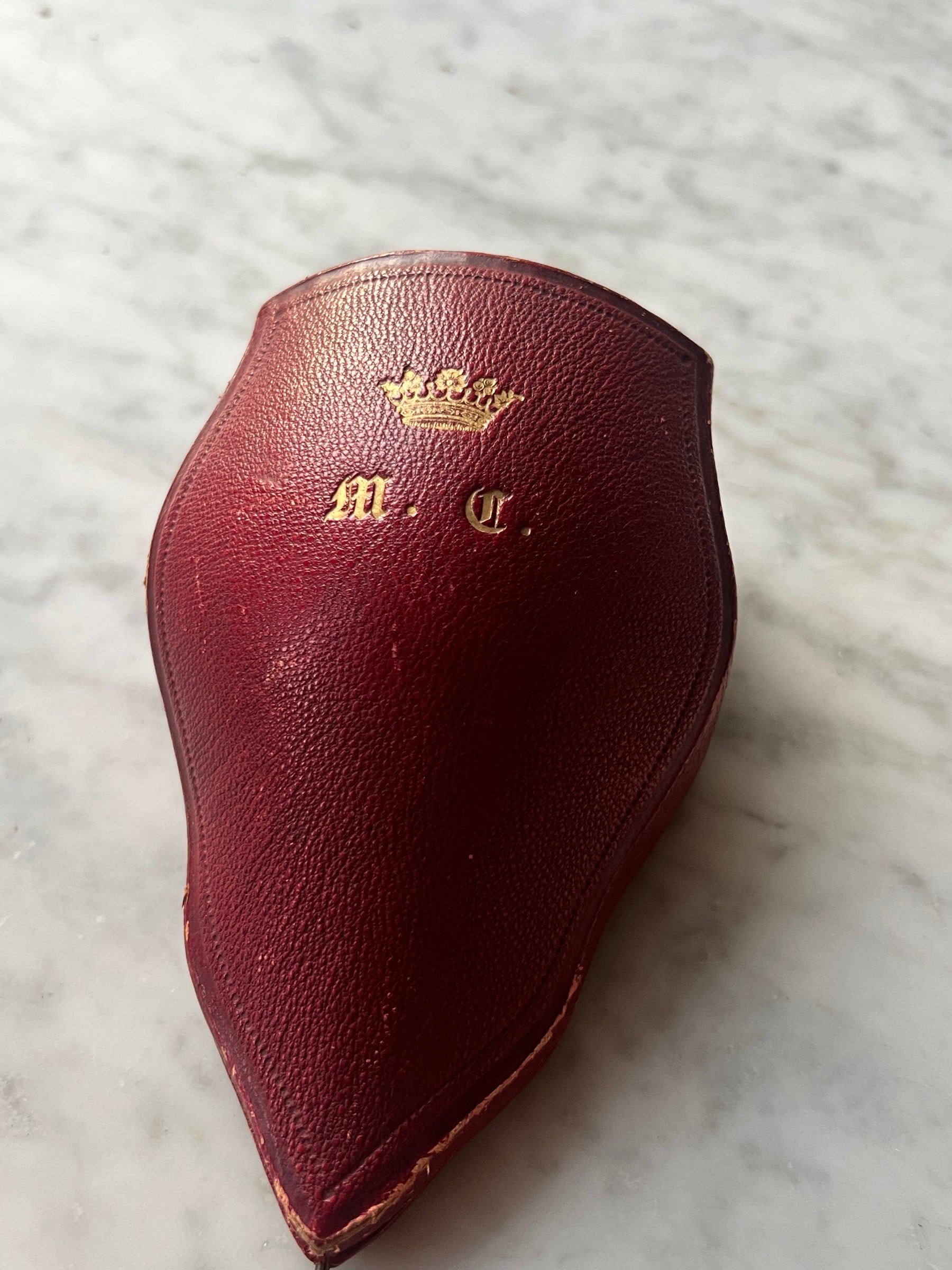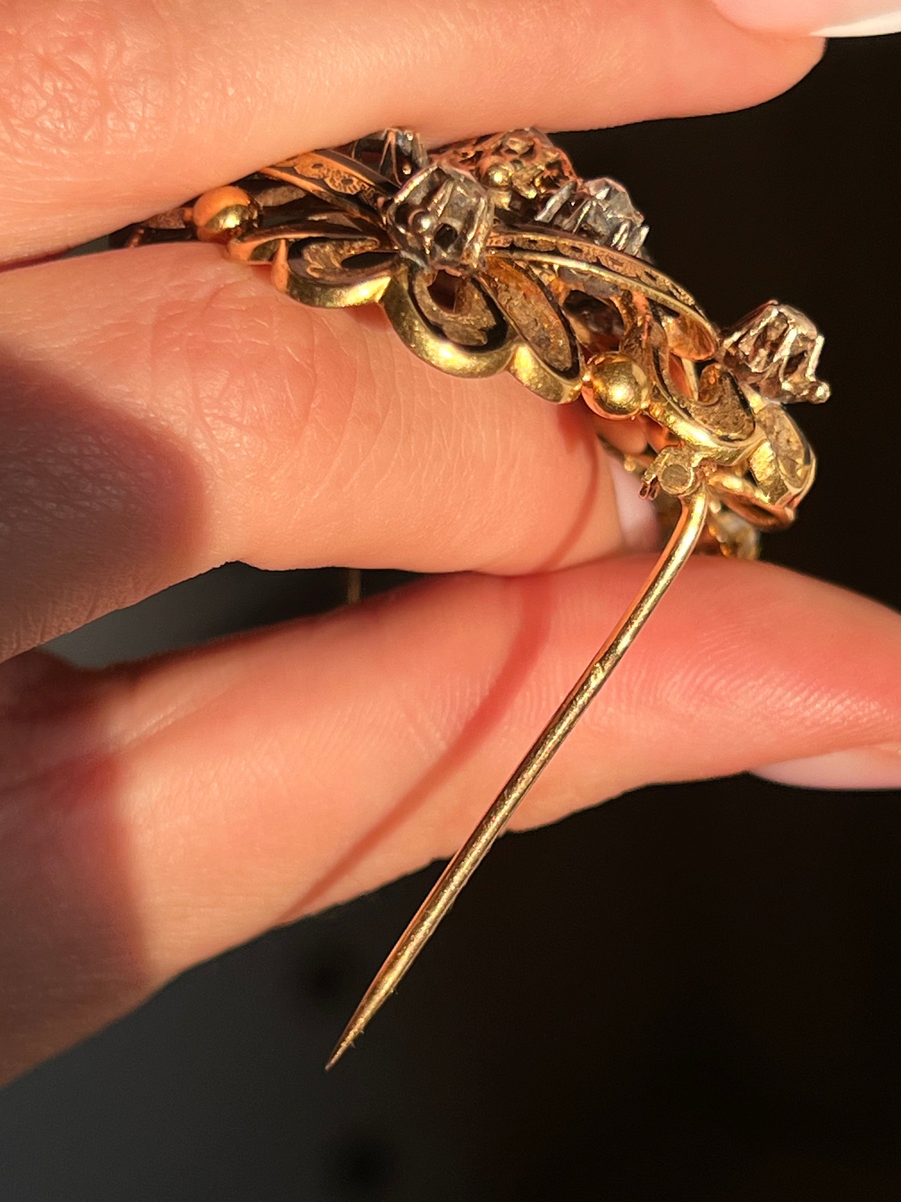 An incredible corsage brooch, likely from the court of Empress Eugénie features foil-backed rose cut diamonds, pearls, and black enamel details—all set in 18ct gold with fringe to rival your favorite chandelier. Likely a court jewel from the early 1860s, with stylistic nods to the archaeological revival trend of the day. Presented in its original box, it would have once adorned a silk gown and spun by its wearer till dawn on a parquet dance floor.