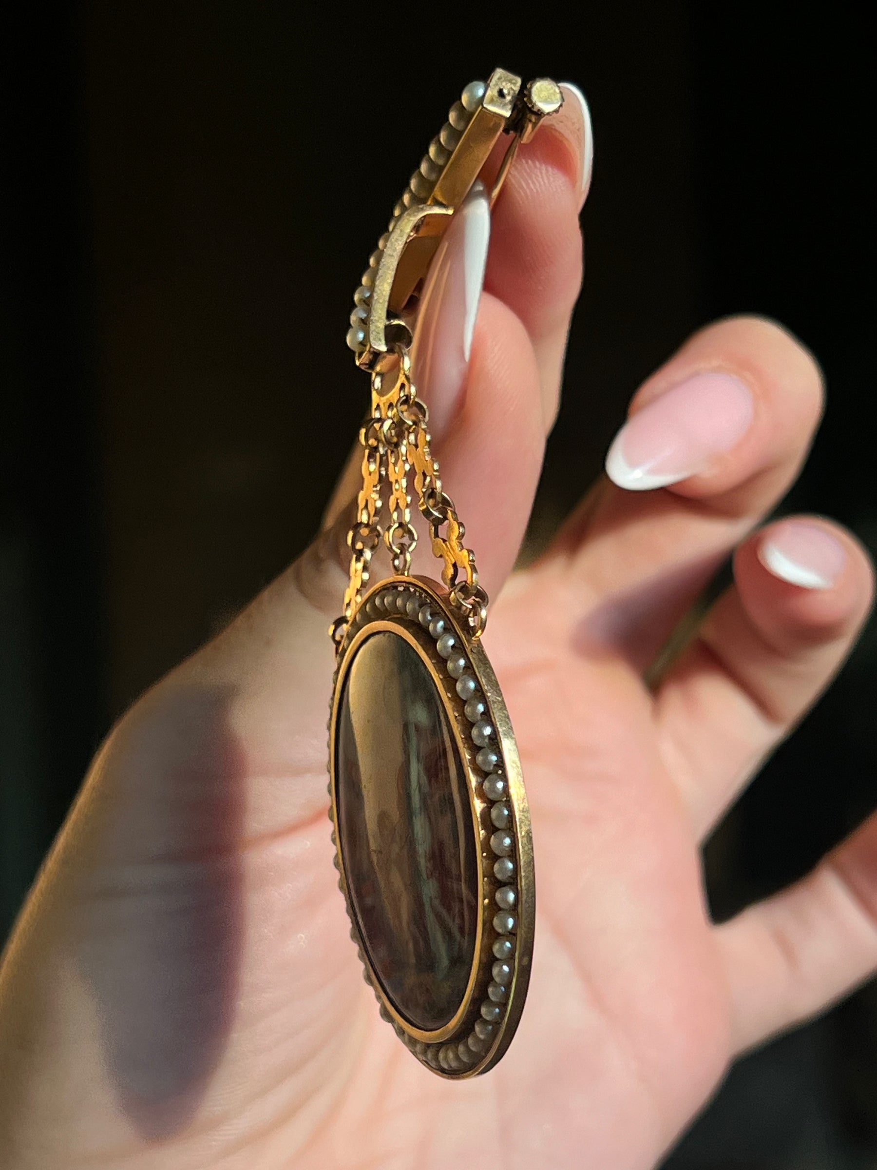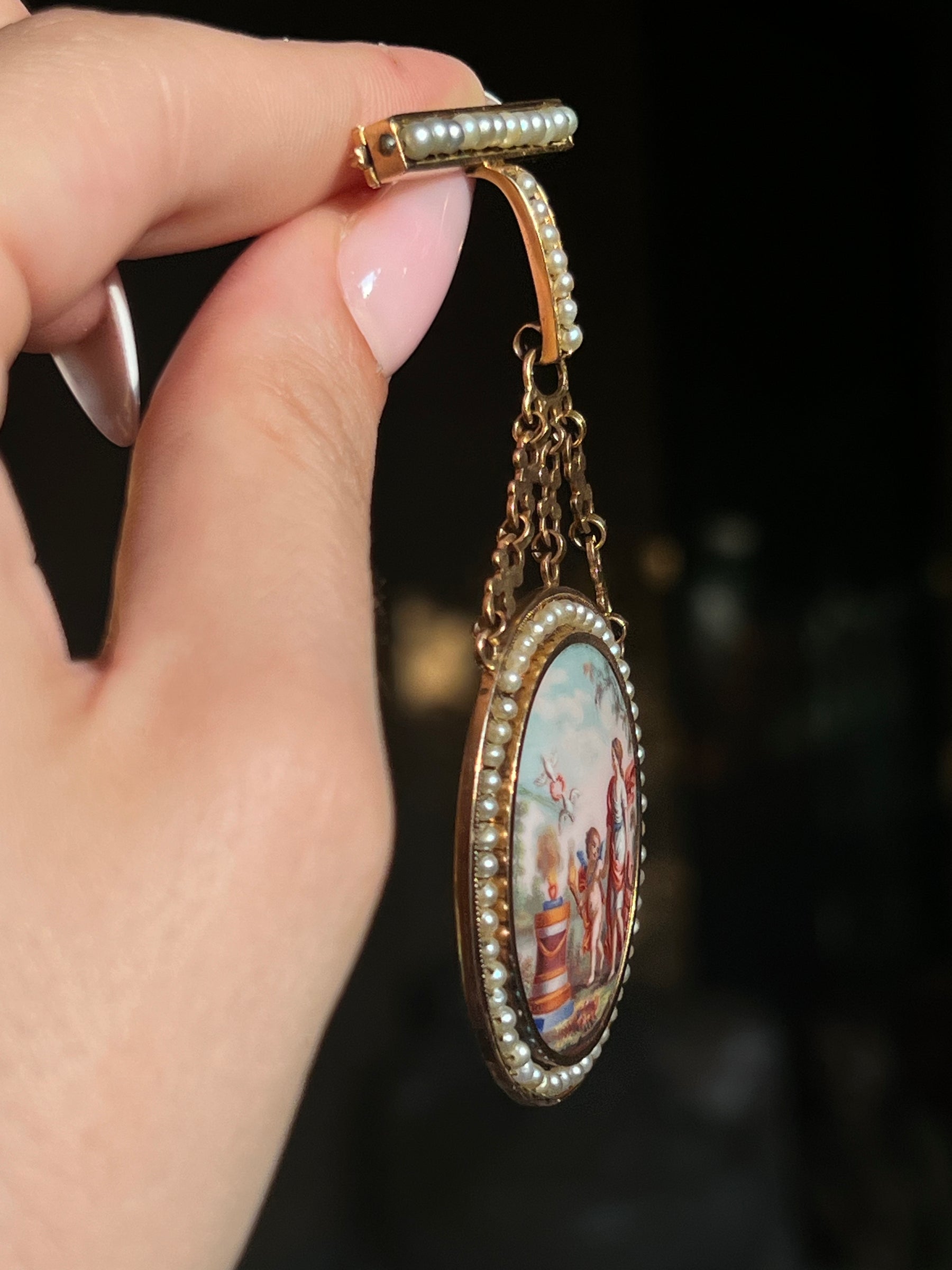 The piece also features a vinaigrette top and a glass locket back, both rare. It’s a jewel with narrative depth, painterly sophistication, and historical pedigree, the perfect 1850’s collection cornerstone.