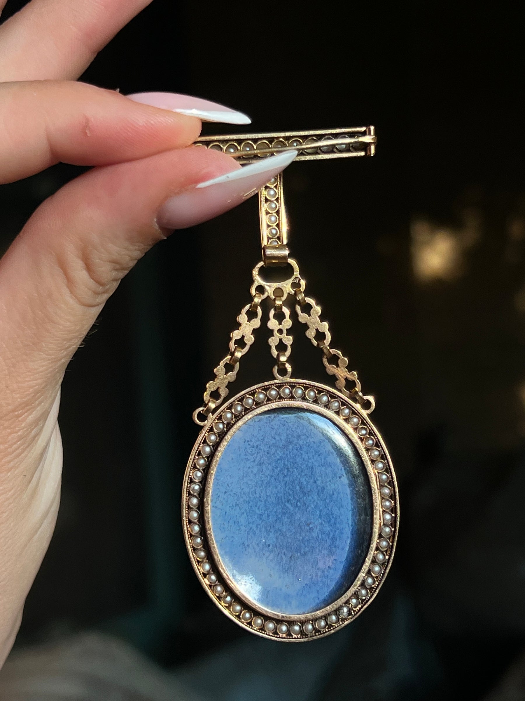 Materials and Features: 18ct gold, enamel on copper, pearls, locket back, vinaigrette top