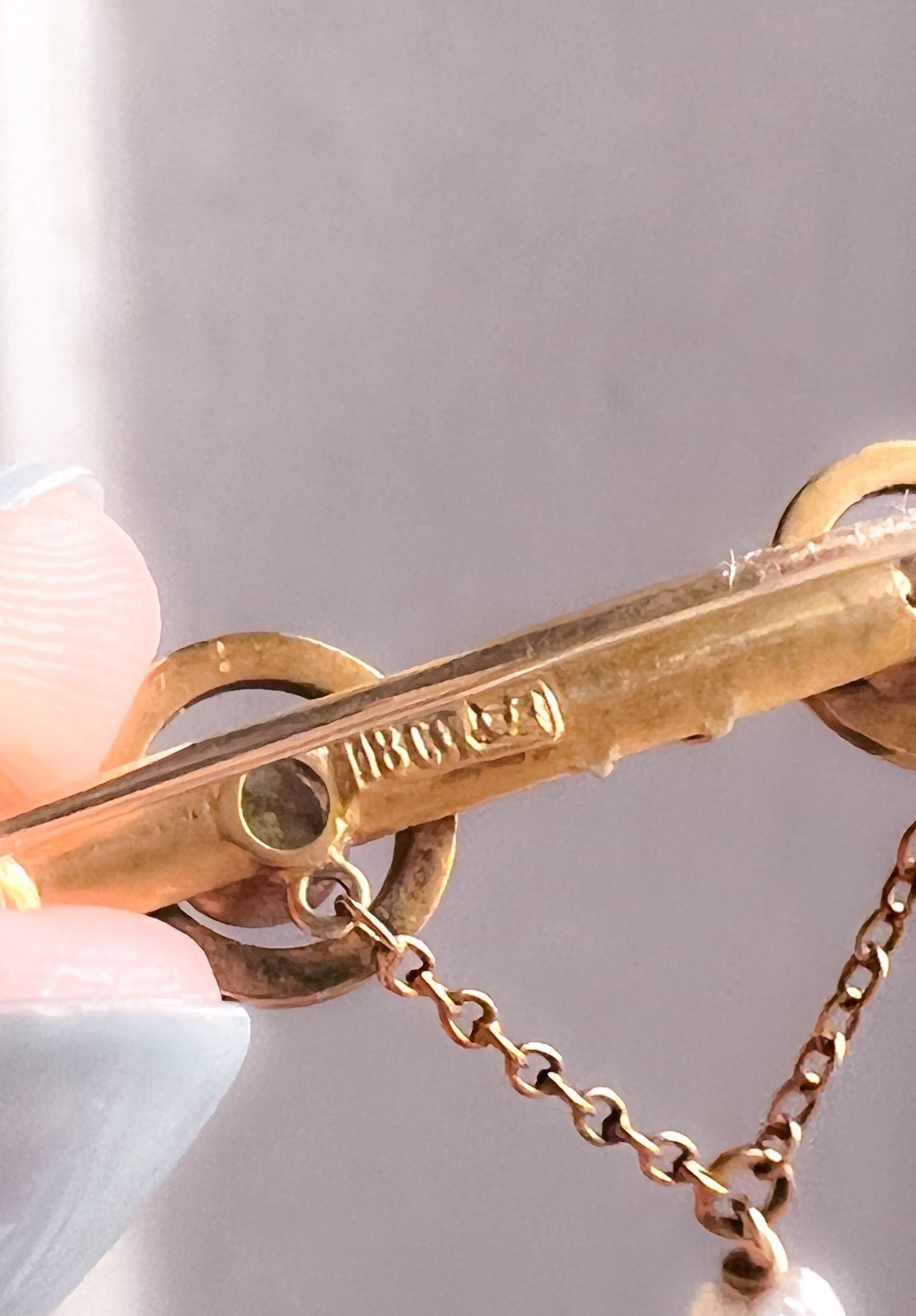 Featuring the colors of American suffrage, this wonderful brooch is an outstanding example of late 19th-century craftspersonship. Small details like golden “stars” in the white enamel halos surrounding the Old European Cut peridots, the finest chain, suspending the natural river pearl, and an outstanding reeded bar connecting them signals that this small bauble was made for a figure of importance and wealth.