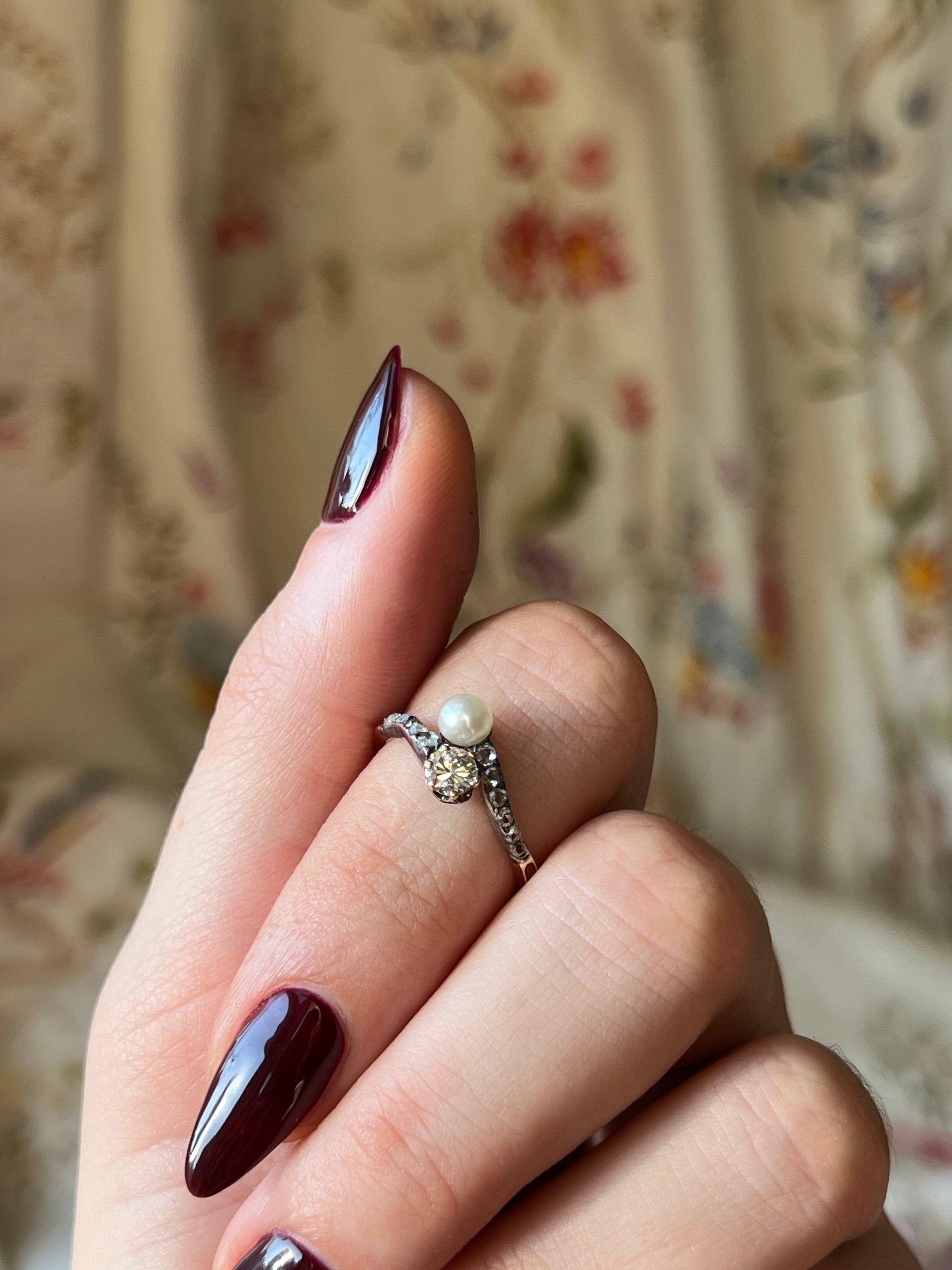 Crafted circa 1880’s in a delightful 18 carat pink gold, this French Diamond and Pearl ring is a wonderful Napoleon III example. Toi et Moi rings like this were a classic mainstay of this aesthetic period; in fact, they first gained popularity in 1796 when Napoleon Bonaparte gifted one as a gift to his wife, Empress Josephine.
