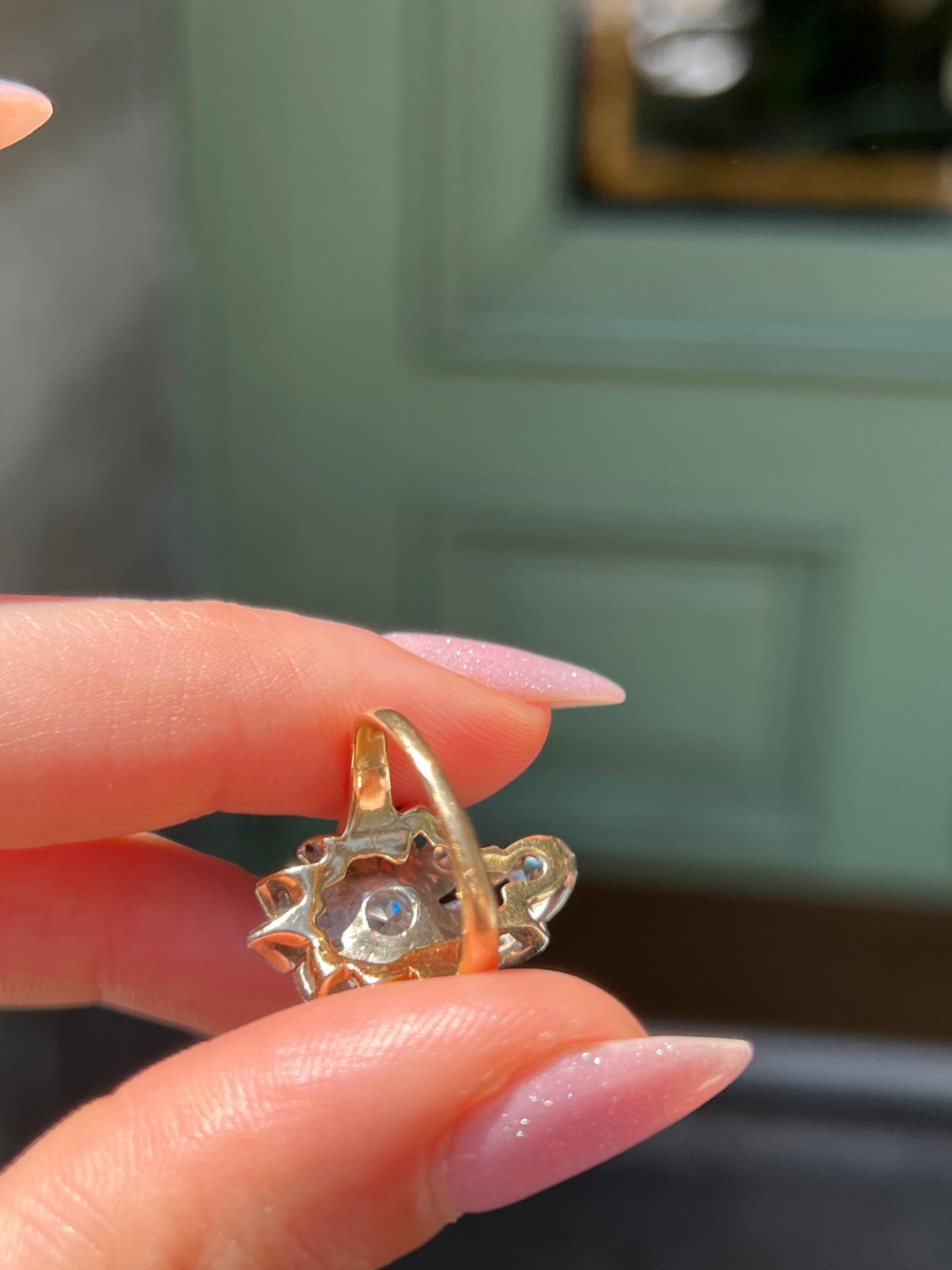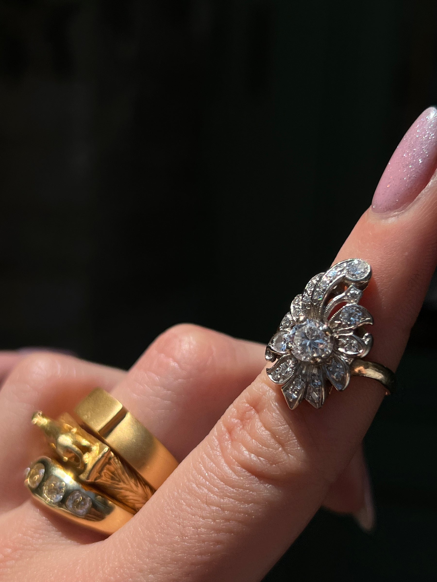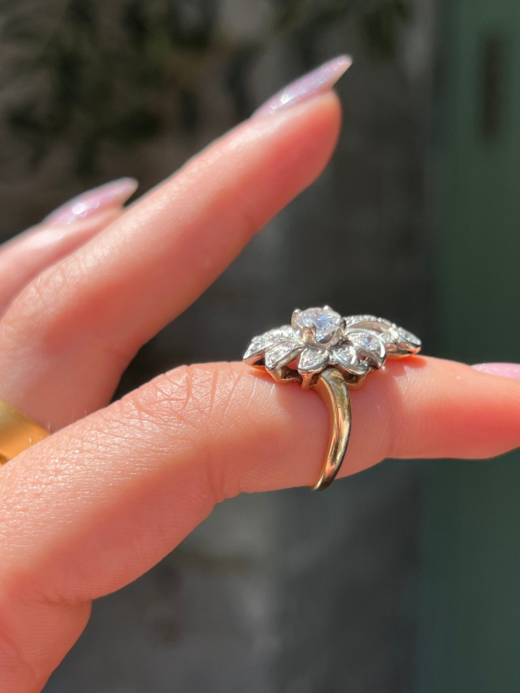 Playful yet elegant, this vintage Retro “Plume” Cluster Ring is a remarkable statement piece. Crafted circa 1940’s, this ring is a glimmering example of the ways 1940’s jewelry continued some of the Belle Epoque design traditions.