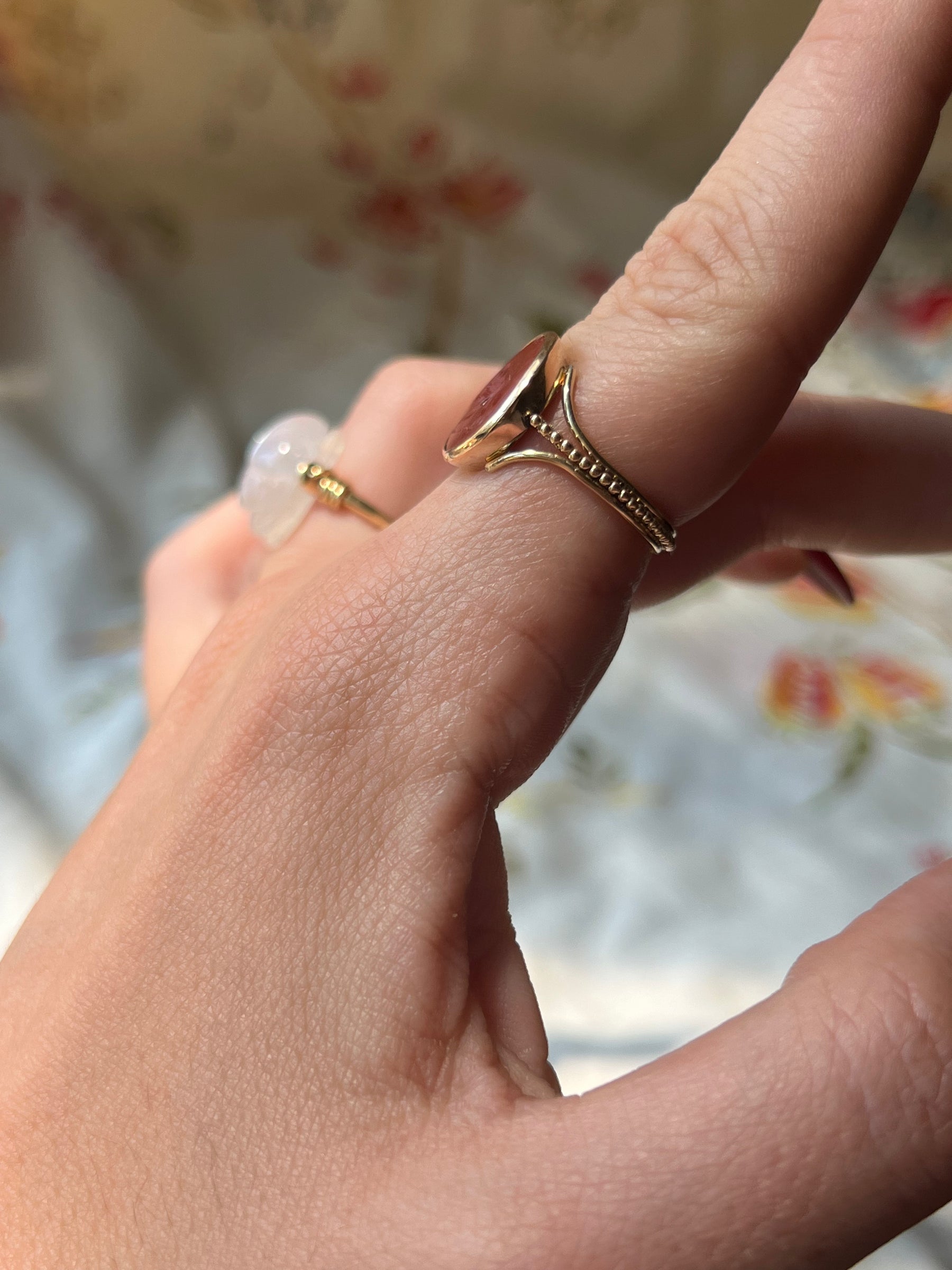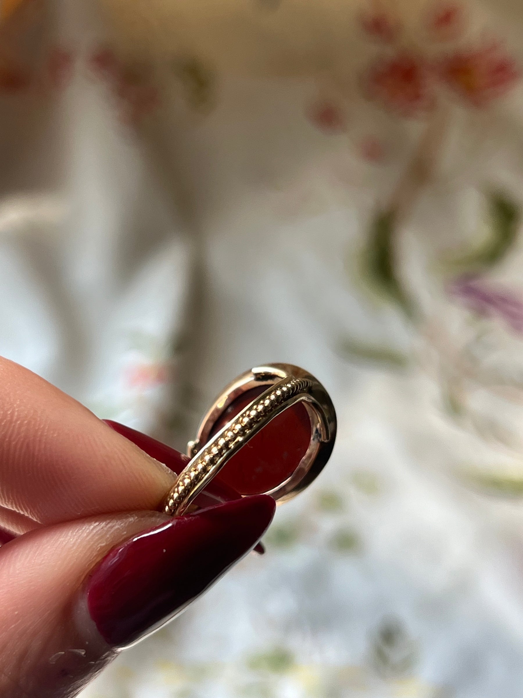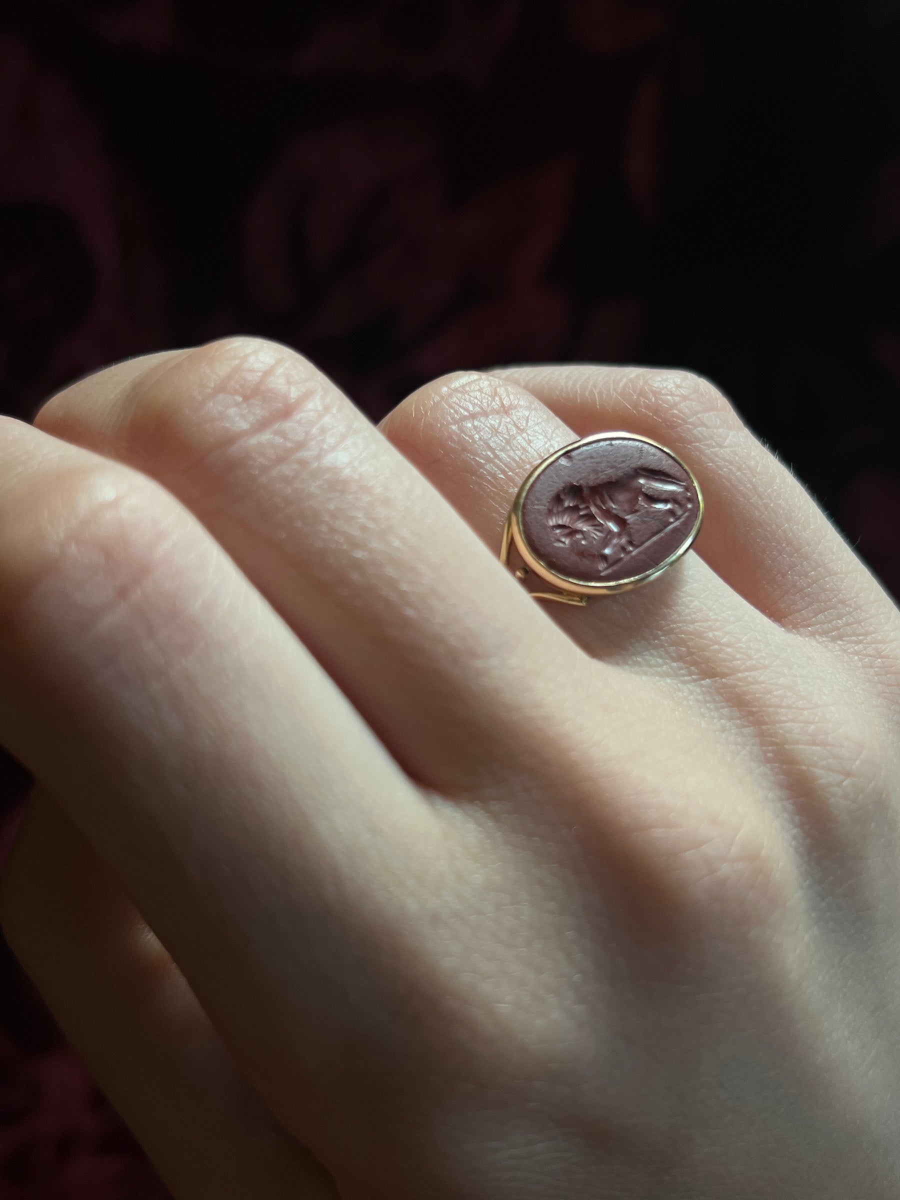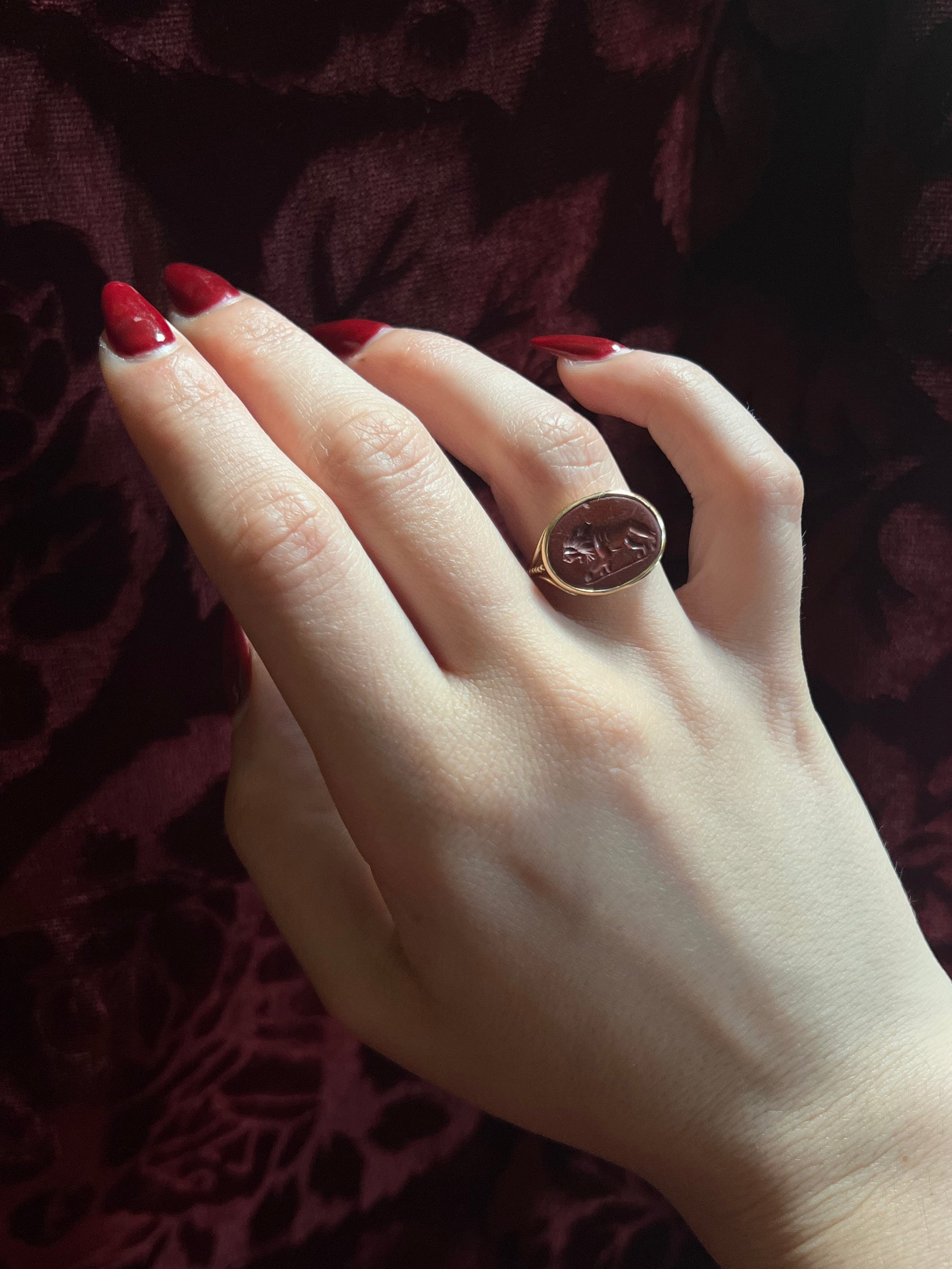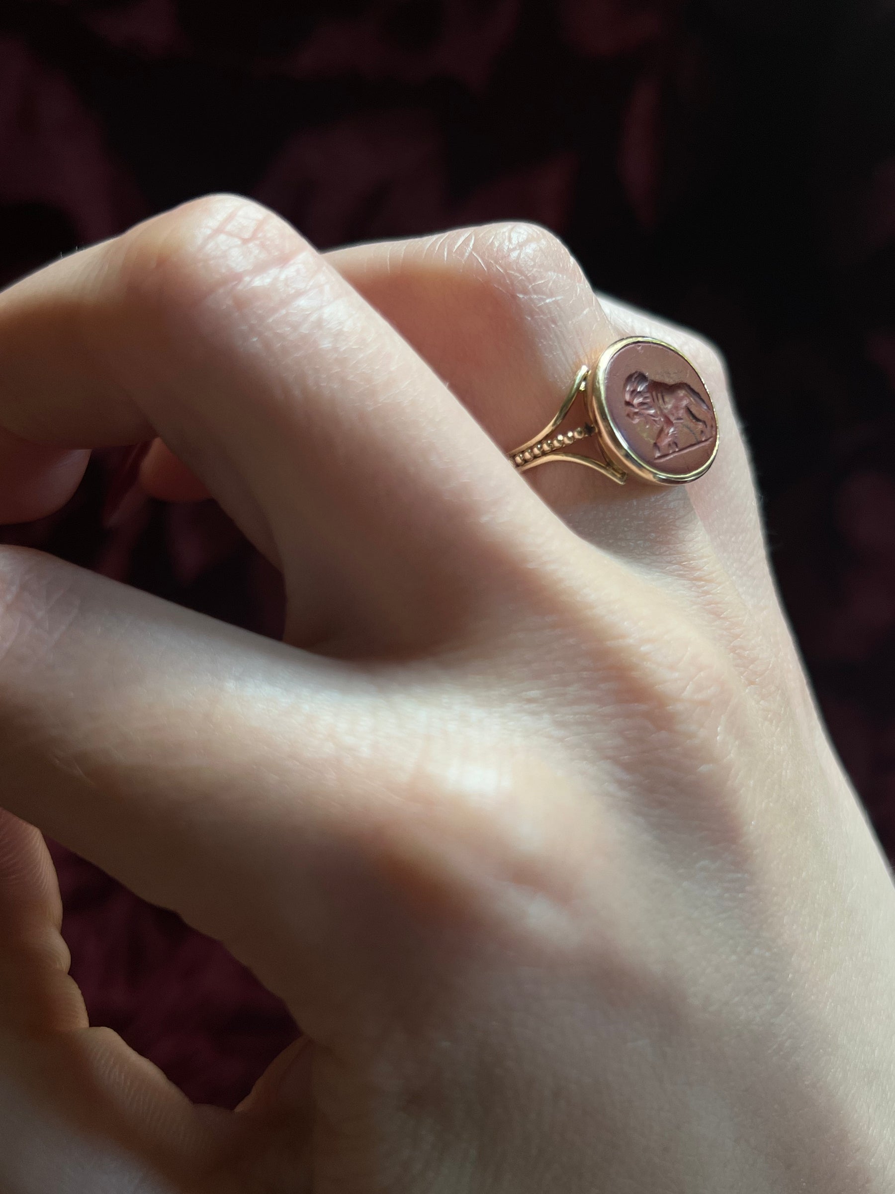 Curio Fantasy objects are each one-of-a-kind, and can never be recreated. This gorgeous ring features a gorgeous 19th century Italian intaglio of a lion, cast in a soft peachy jasper. Intaglio rings are an iconic testament to Italian craftpersonship and culture. In ancient Rome, intaglio rings were designed as totems of power and wealth, and also served as seals for hot wax – allowing the wearer to emblazon their documents with their unique, personally commissioned signature.
