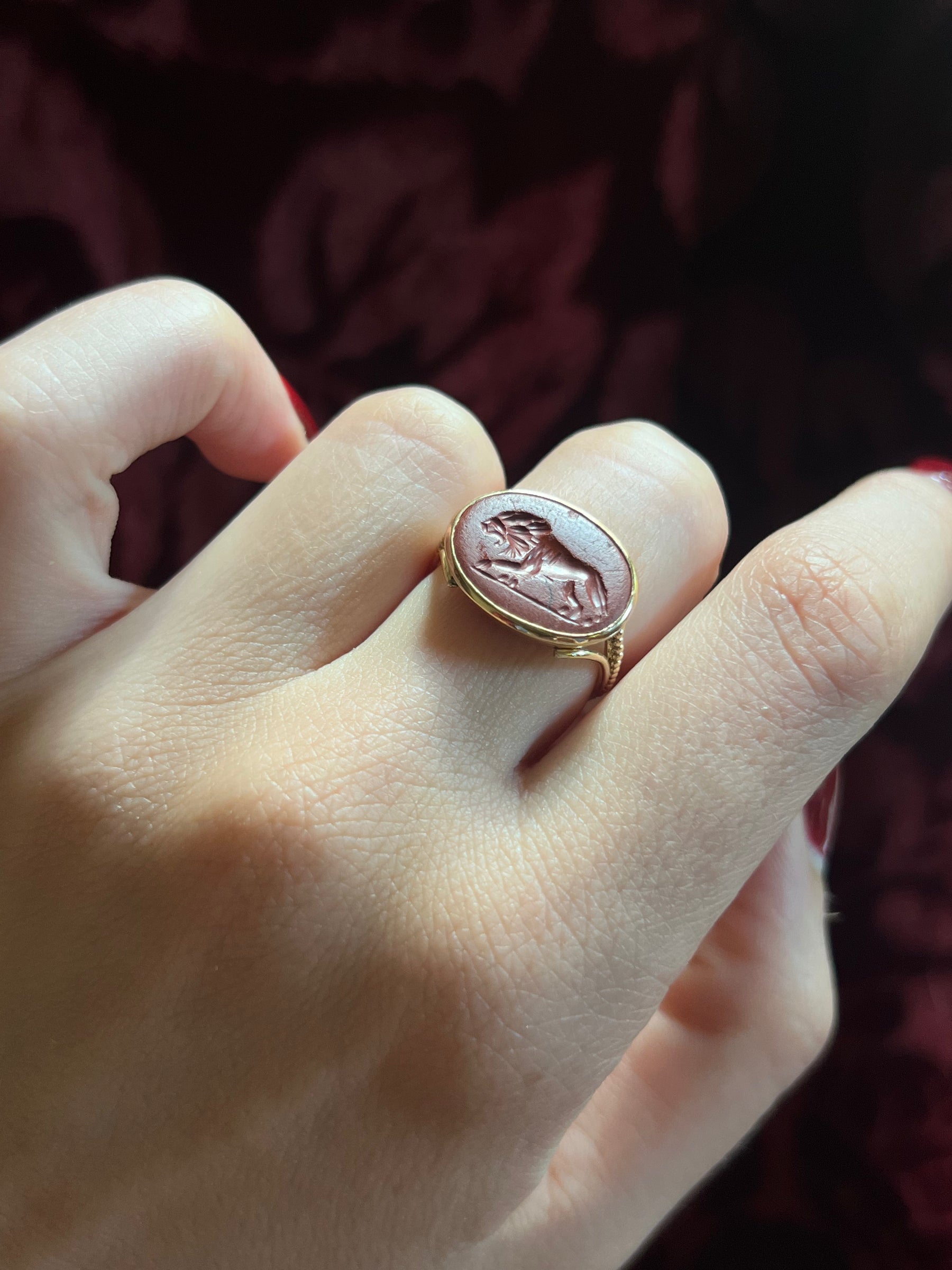 Age/Origin: Curio Fantasy hand wrought 18ct shank, 19th century intaglio of a lion