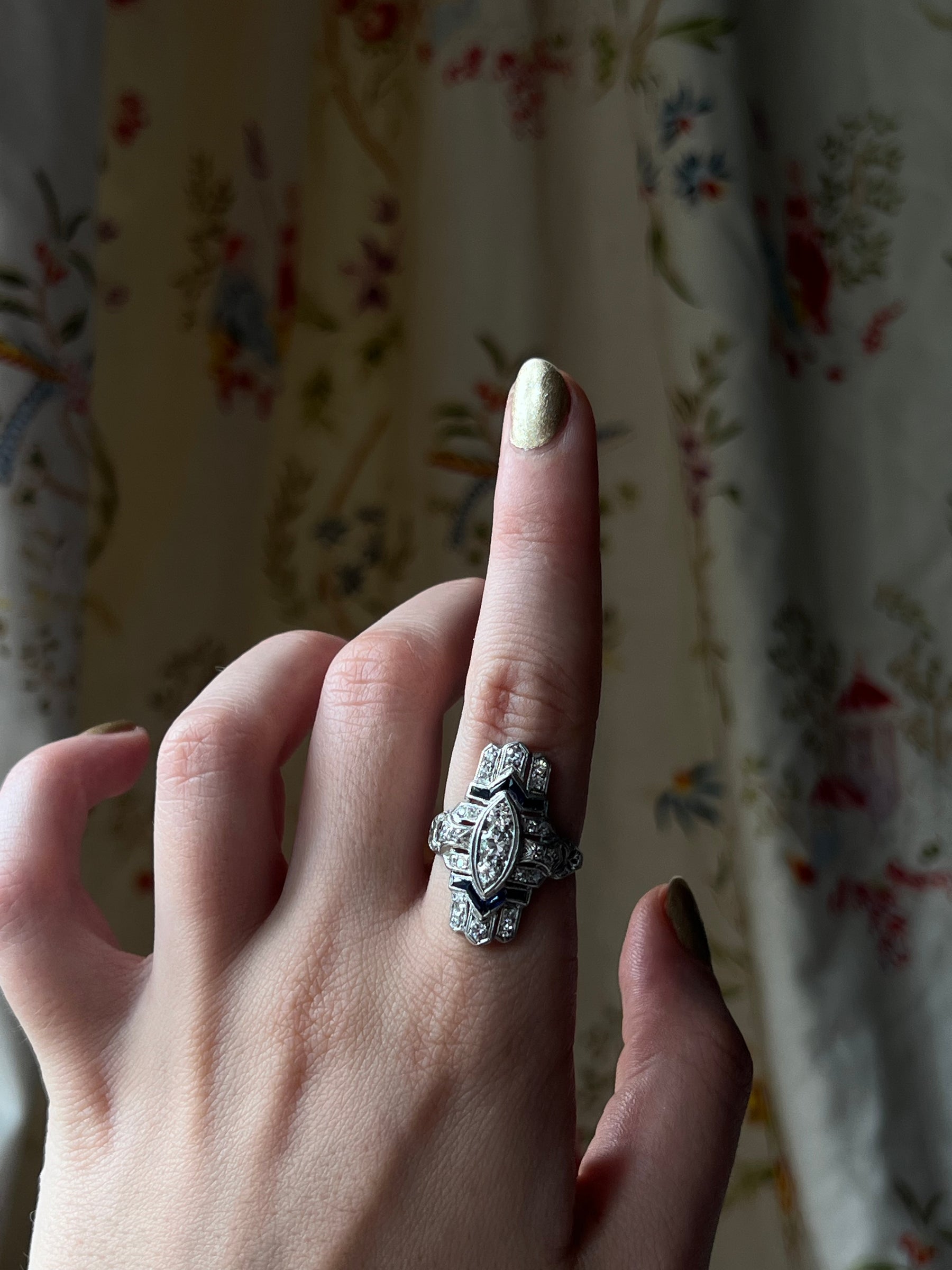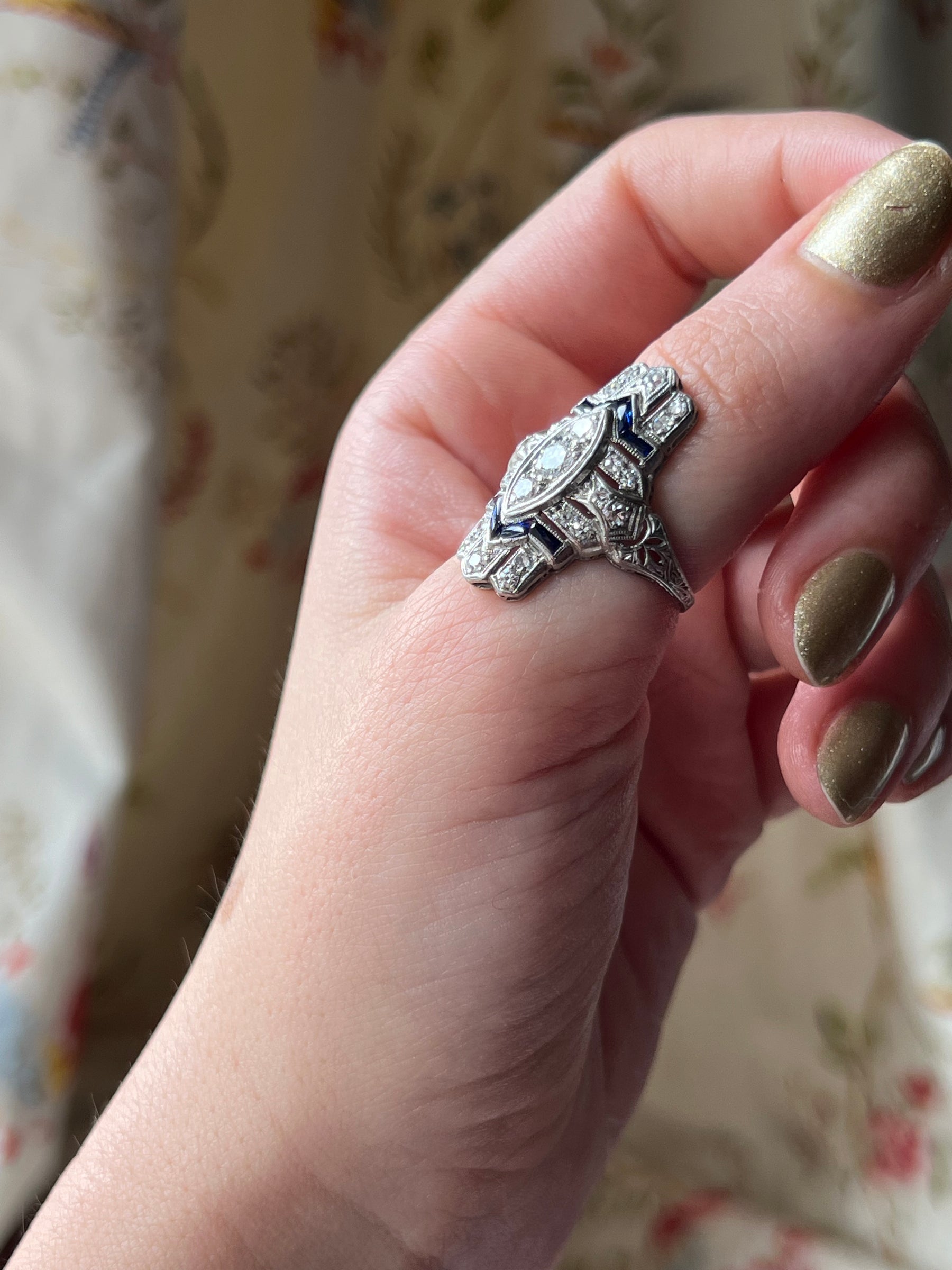 From top to bottom, this eye-catching Navette ring shines with Art Deco style! Three center diamonds are set within an oval frame, with accent diamonds making up the building blocks of the piece. Dynamically set sapphires help to create a beautiful ring top, echoing the stylish architecture which was so well received at its inception. Truly a ring that celebrates all the aspects of the era, bringing us a sophisticated and and classic beauty with the  "thoroughly modern" sensibilities of the time!