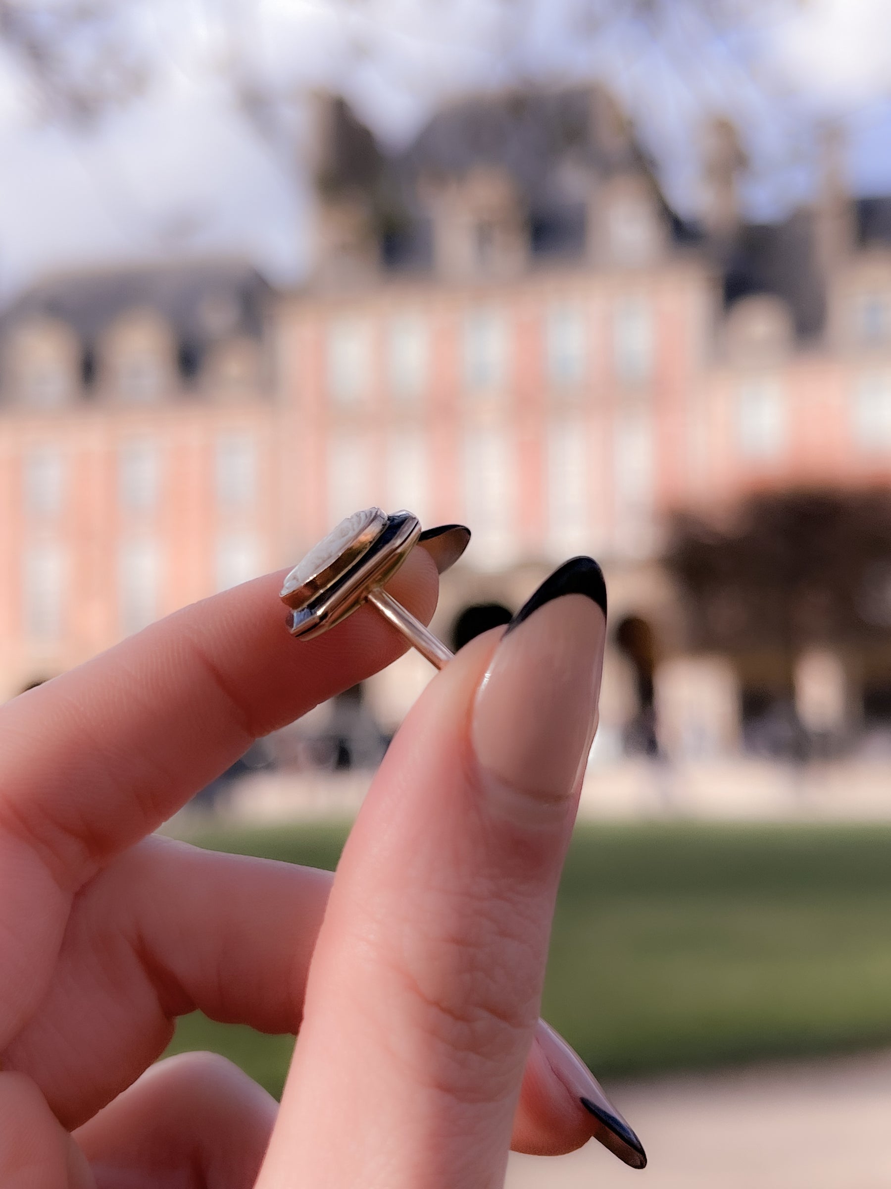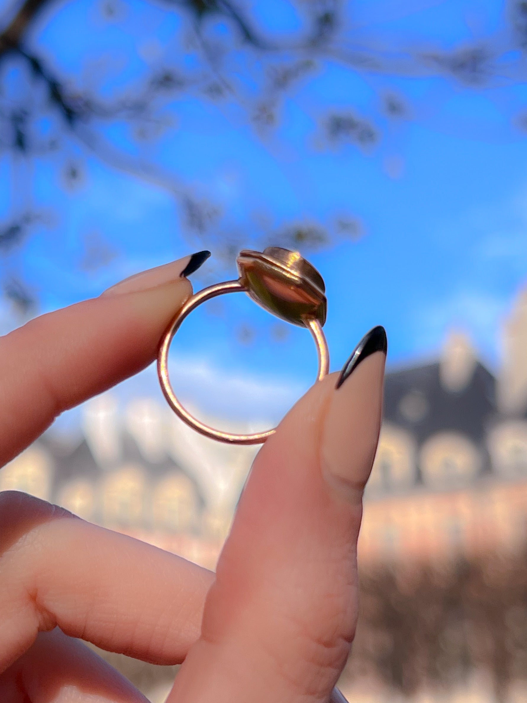 Zeus was not only the king of the Grecian Pantheon— he was the reigning royal mascot of the 19th century cameo pantheon. A particularly virile depiction with a curling beard and steadfast expression, I love this rare cameo set within a beautiful octogonal pool of black enamel. With a rounded reverse, this immaculate cameo makes a wonderful addition to any ring stack. Carved of shell, perhaps converted from a stick pin or button.