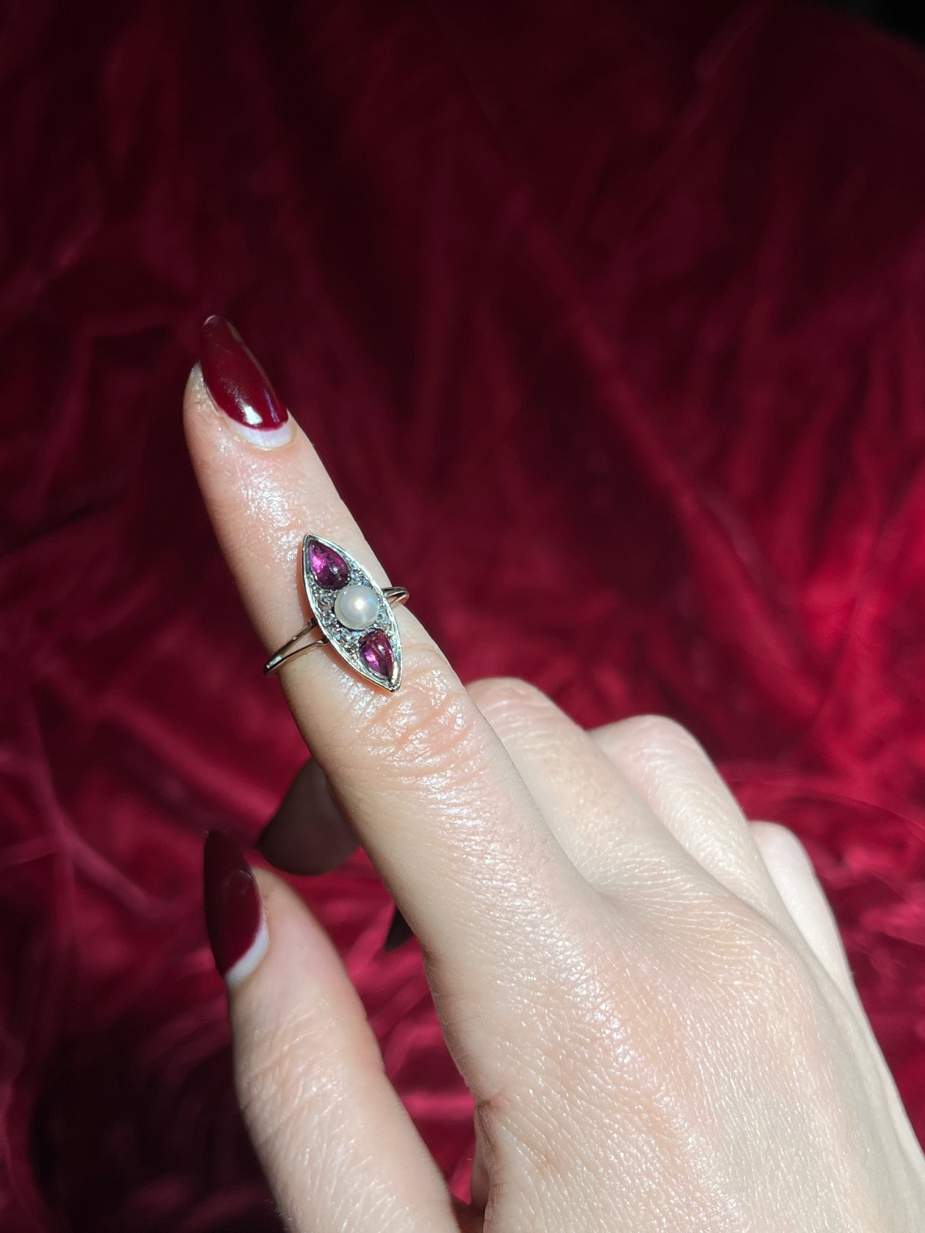 However, despite its appearances, this French ring is pre-art nouveau, with a beautiful construction and navette (“little ship”) design that foreshadows the aesthetic moments to come in 19th century French jewelry.