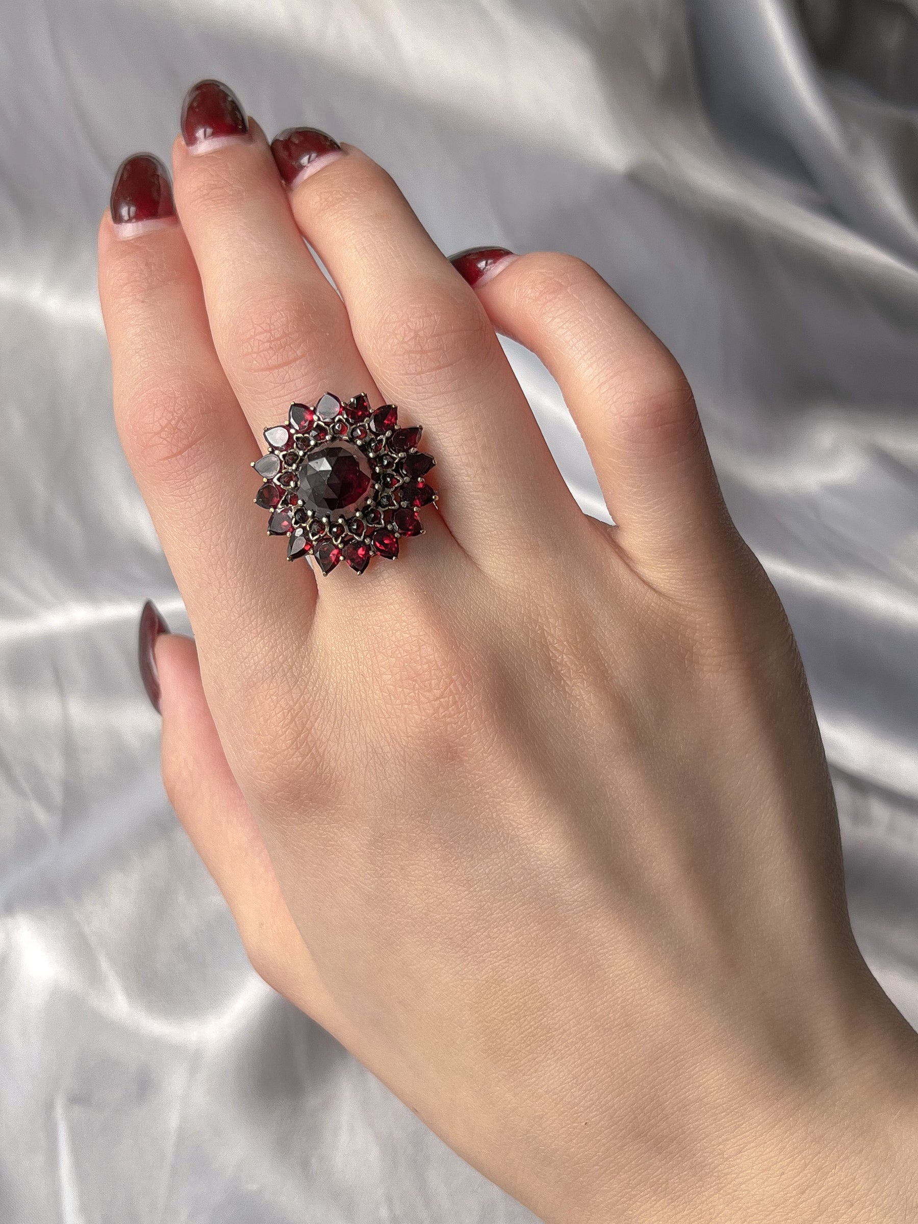 This angular double Bohemian garnet halo ring is just divine! Circa 1970, this piece pulls most of it’s design from the wildly popular bohemian garnet pieces of the 19th century Victorian era; which clustered these bright lustrous garnets together to hi-light their rich color. The double halo of garnets encircle a large central garnet in an almost sunflower-like formation due to the pointed cut of outermost halo, encompassing the flower child era it was created and paying homage to the bohemian garnet jewelry that came before it. A ring perfect for someone who loves statements with subtle hints of color, as the garnets are rather understated until they burst into a bright and brilliant cardinal red in direct light.
