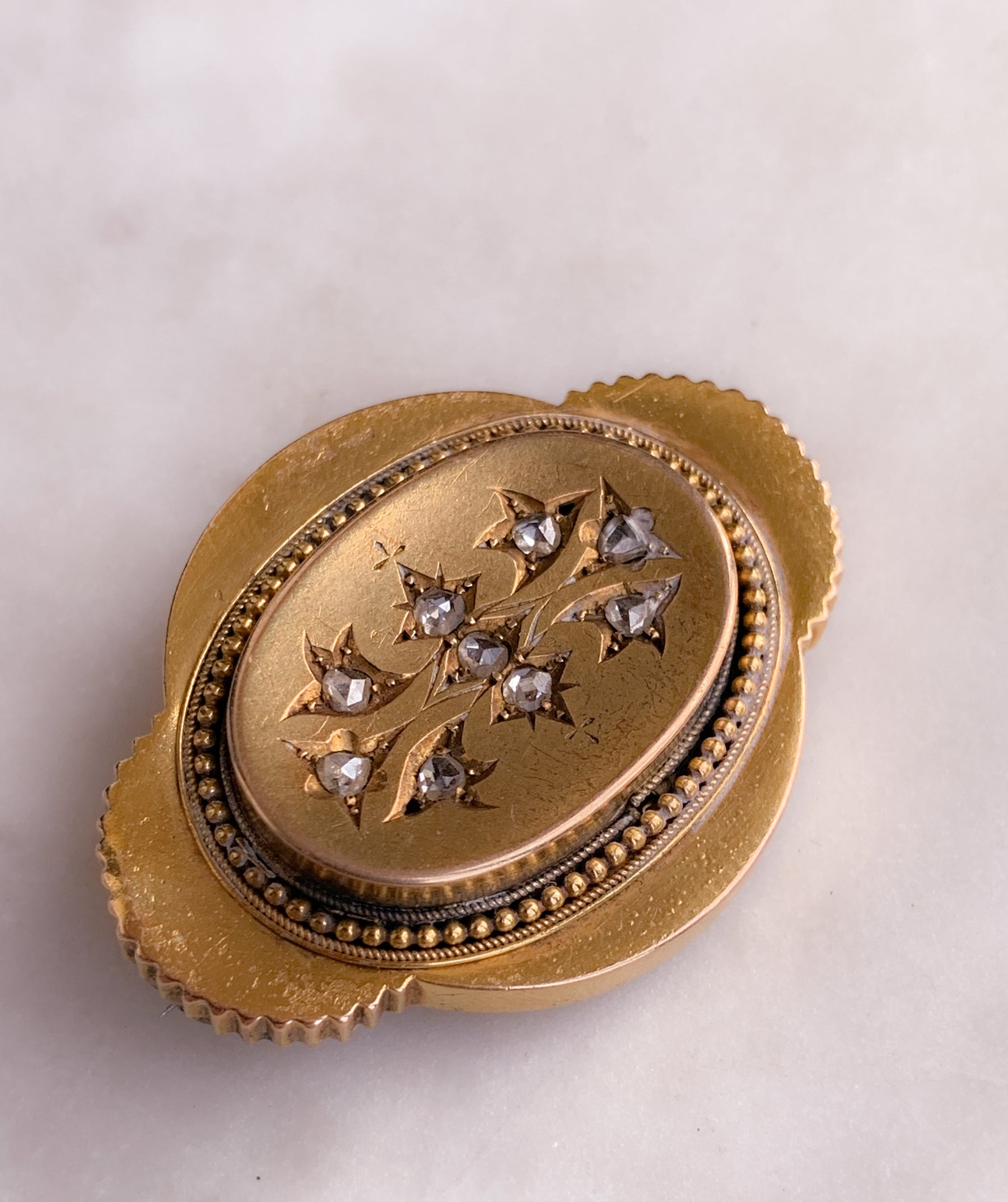This gorgeous brooch features rose-cut diamonds inset delicately with Etruscan revival details. This brooch visually intersects two of Elle's favorite themes in Victorian jewels; ivy leaves, radiating beautifully from twinkling diamond stars that form the epicenter of the medallion.