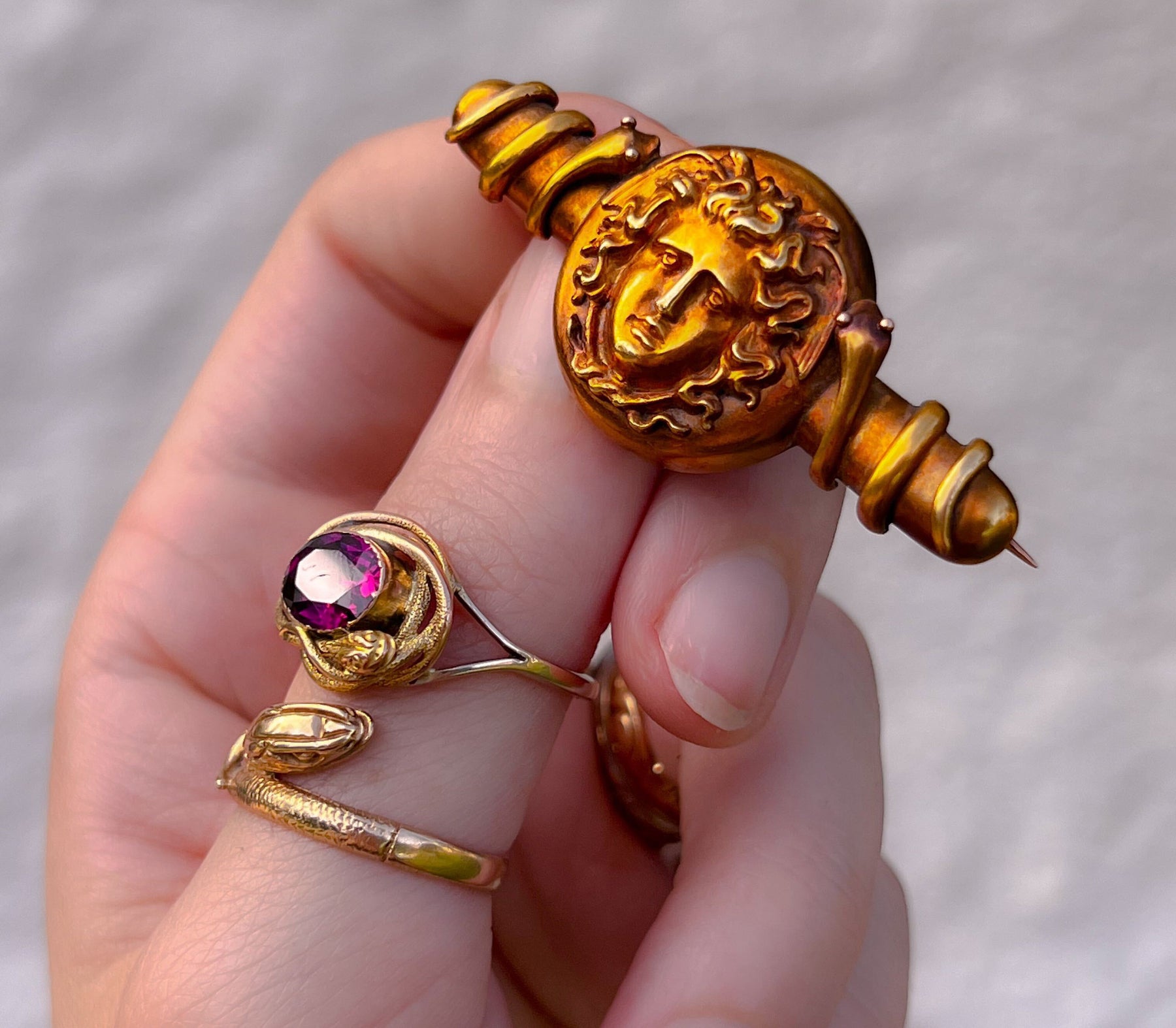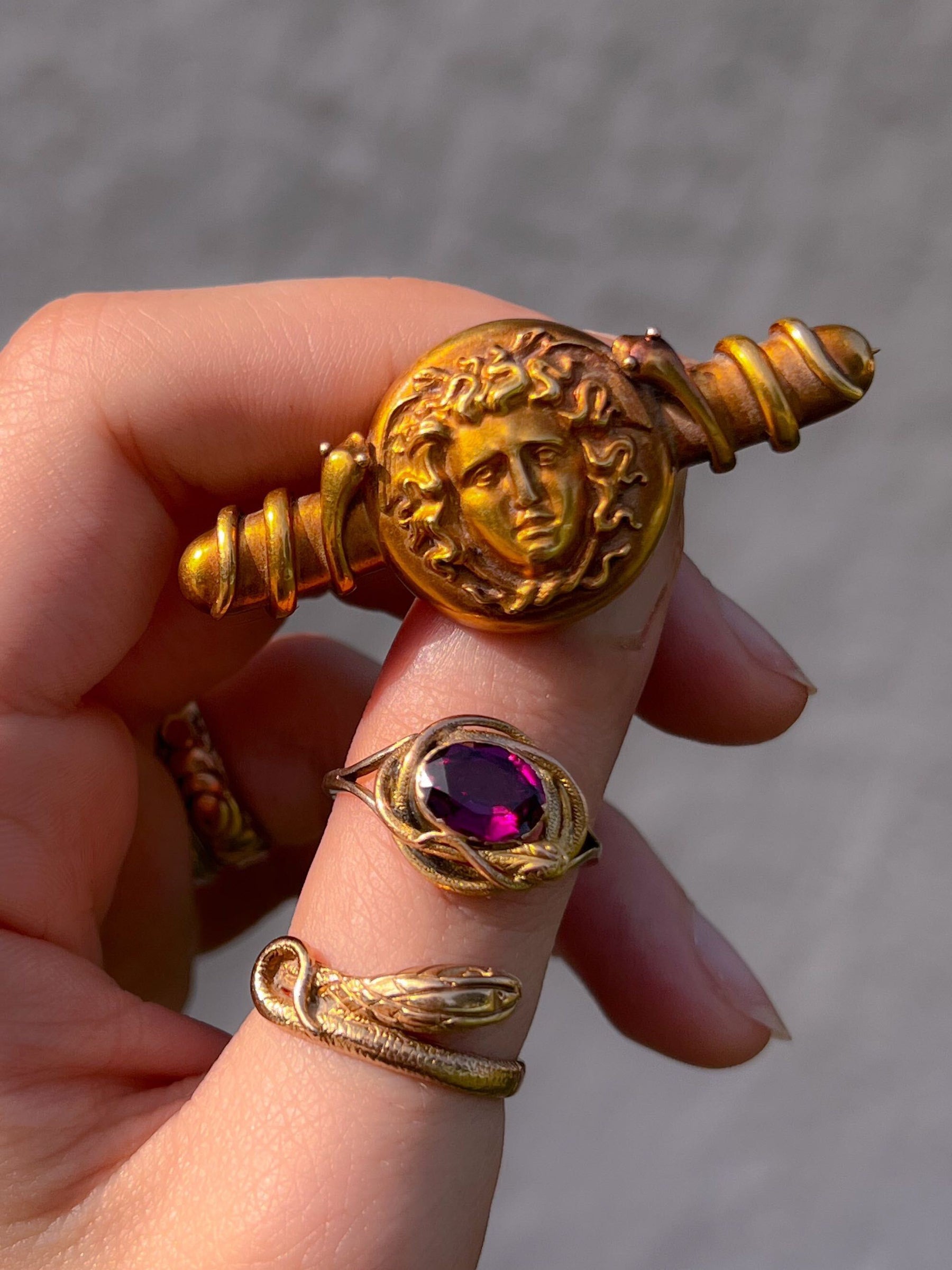 One of the best pieces of Grand Tour jewelry we’ve ever seen, this superb brooch featuring two snakes coiling around a bar that leads to a central shield. Firmly planted in the Archaeological revival movement, this piece pulls from the iconic 1597/1598 Caravaggio shield that was crafted for Cardinal DelMonte’s collection, which would have likely been on display at the Ufizzi during the 19th century.