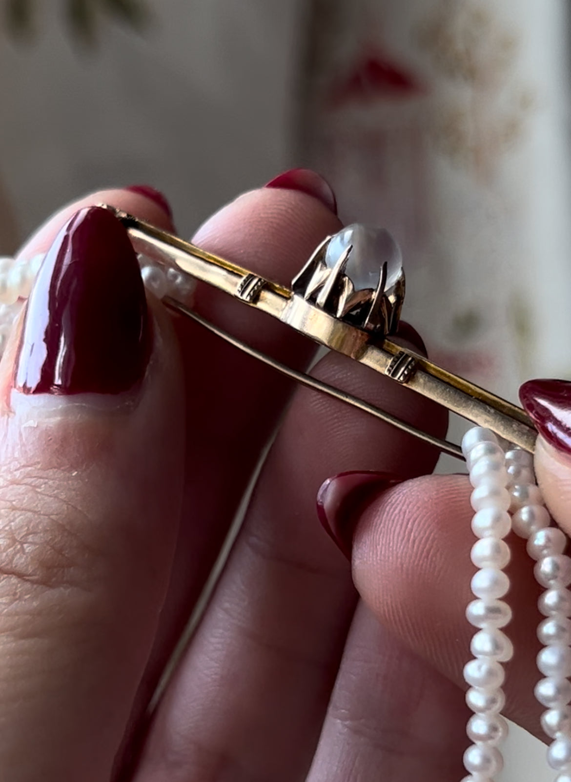 A delicate 14k gold bar brooch with a remarkable moonstone cabochon, fashioned into a pendulous "bullet" shape. This bar brooch speaks directly to the eastlake pattern of jewelry that was popular in the late 19th century, specifically in San Francisco.