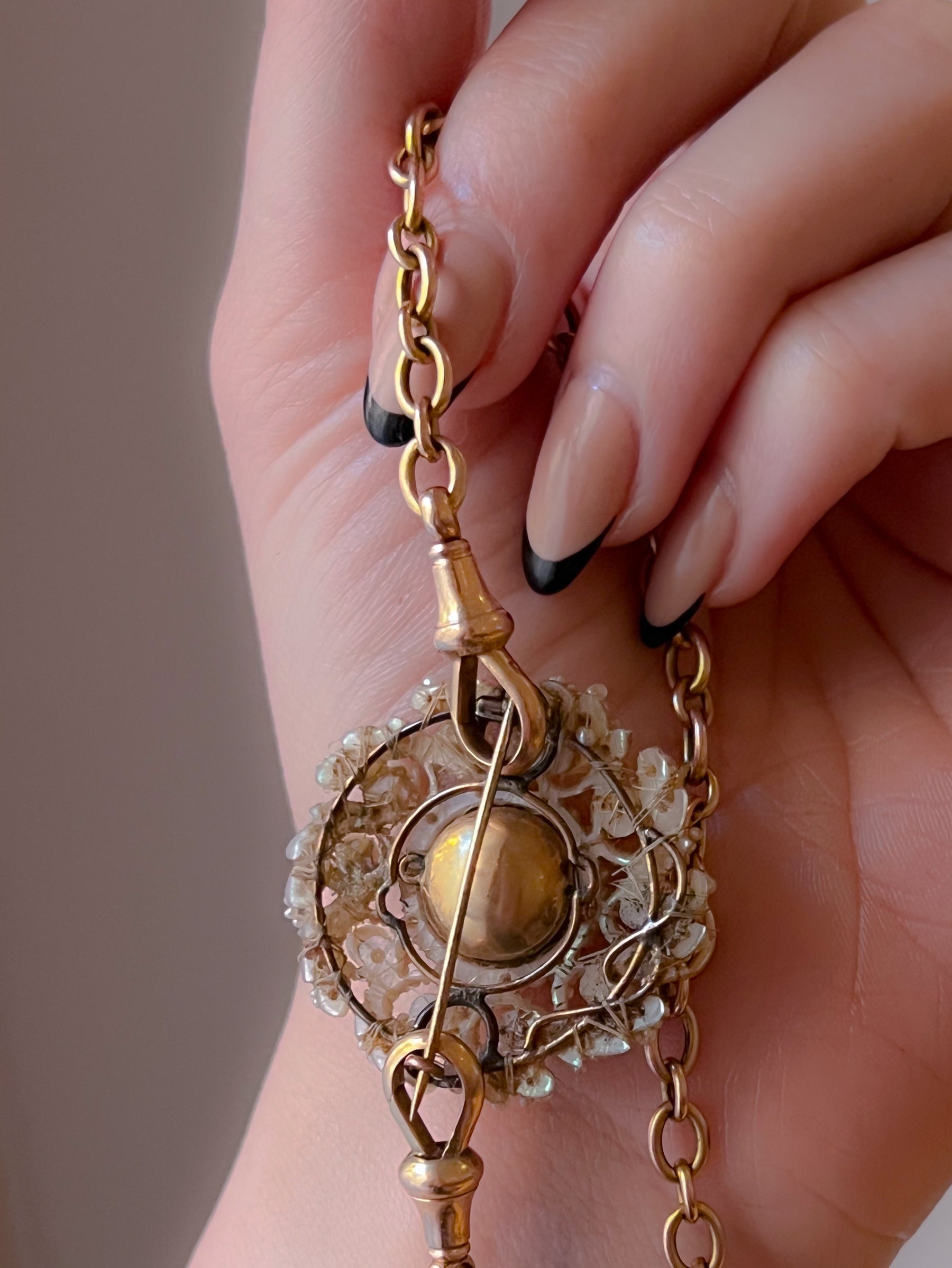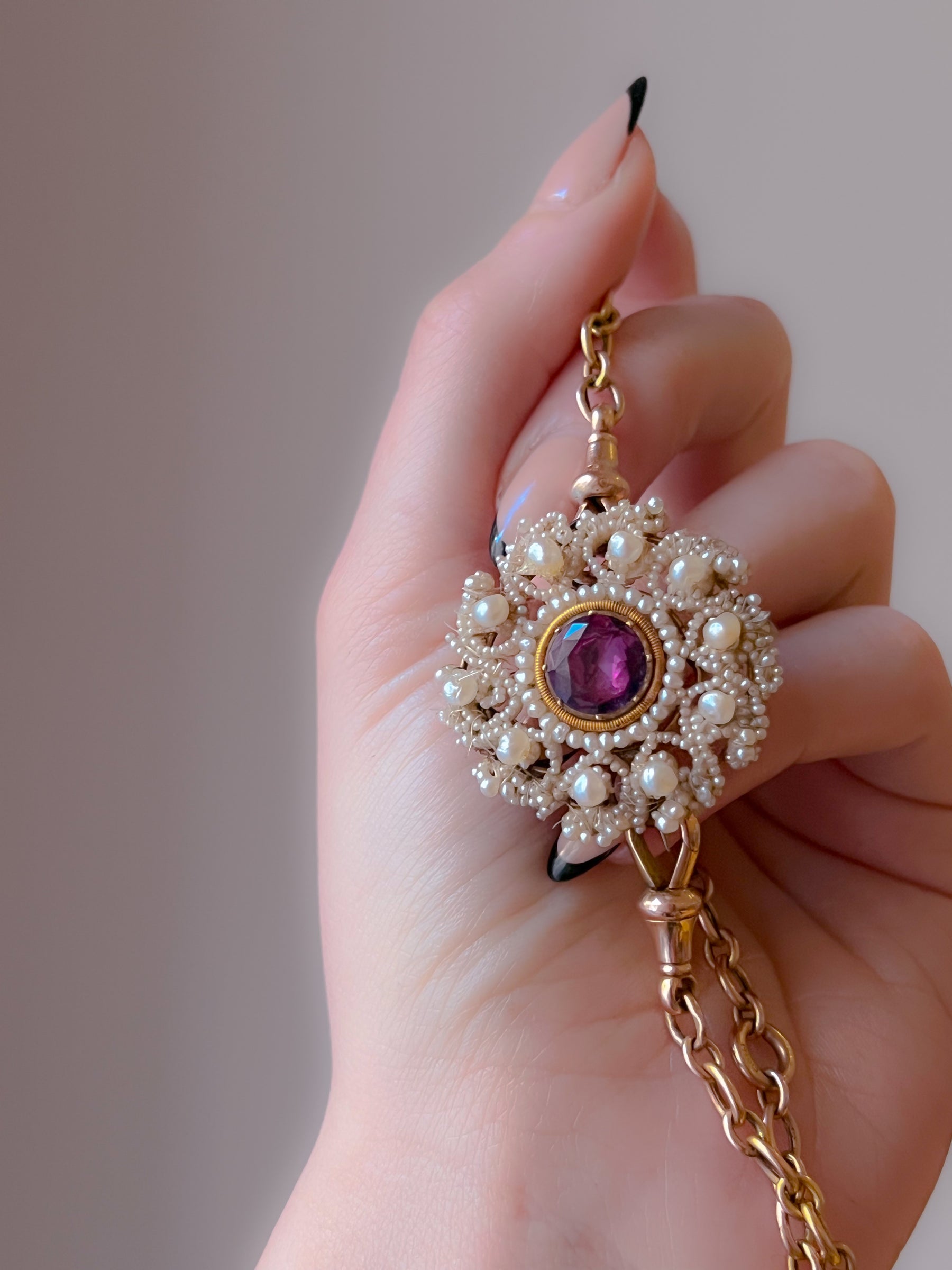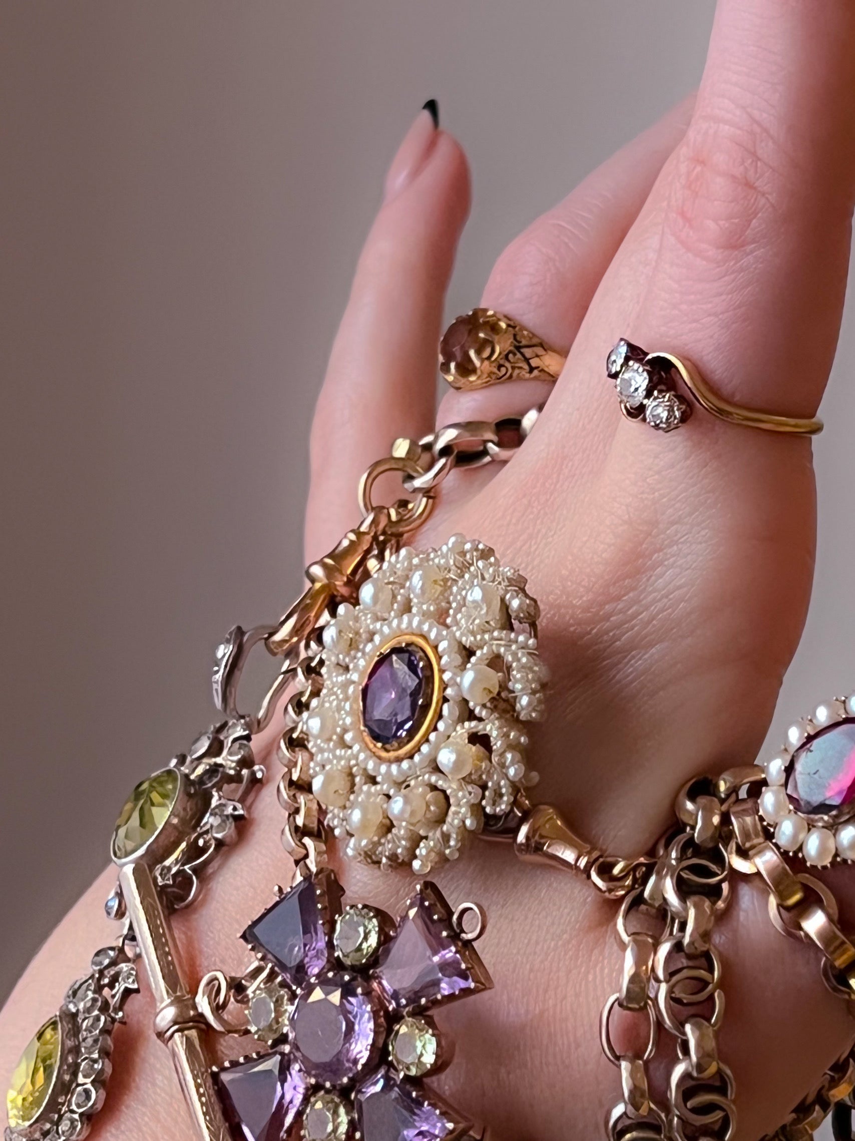 A superb Georgian pearl-work brooch in 15ct— this rare gem-set jewel is a text book example of the finest quality that early 19th century craftspeople could create. A massive amethyst set in pink and purple foil creates the radiating centerpiece of this brooch, cupped by a hand carved mother of pearl base, to which hundreds of seed pearls are hand attached— creating a luminous, glowing, lace-work effect. I couldn’t be more enamored of this gorgeous brooch!