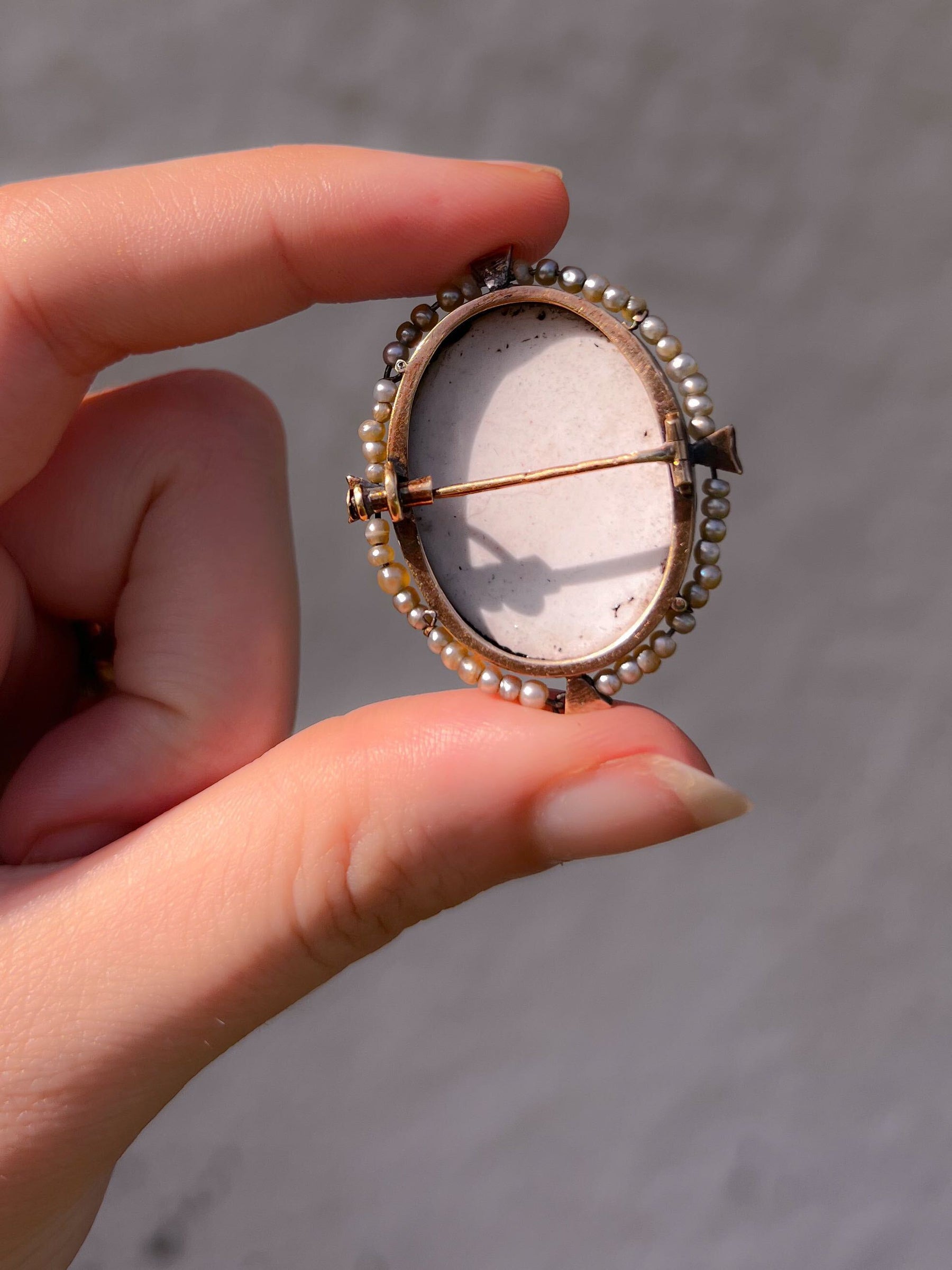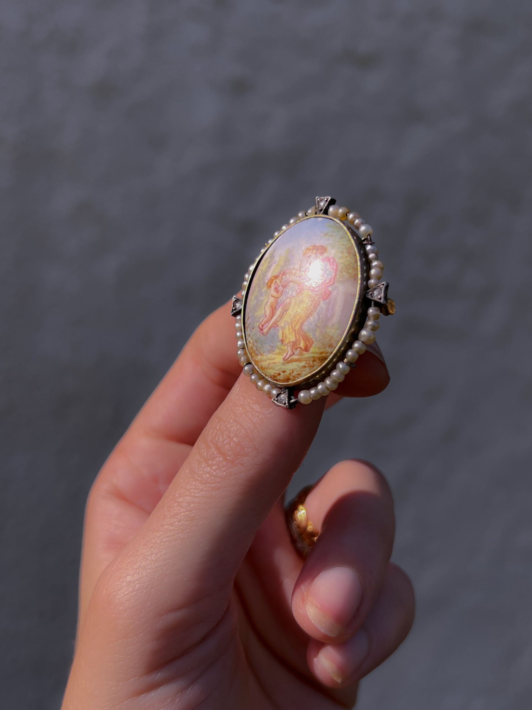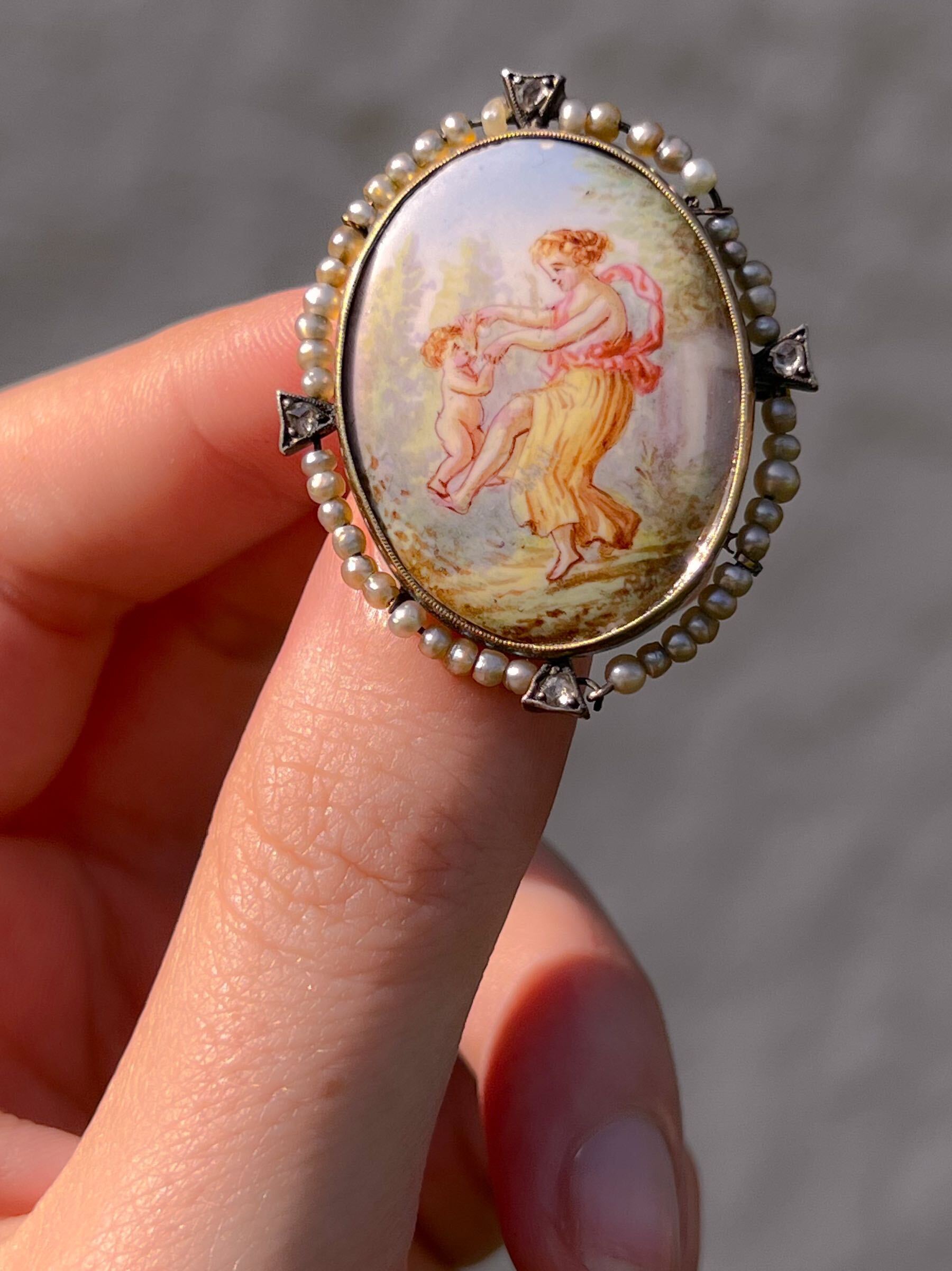 A diamond and pearl halo’d enamel of an extremely informal, Venus frolicking with Cupid. It is extremely rare to find such a rendering of two of Olympus’ tenants- I love the excitement of the swaths of fabric levitating around their bodies as they pirouette to a soundless song. Likely French, this pairing is pure magic.
