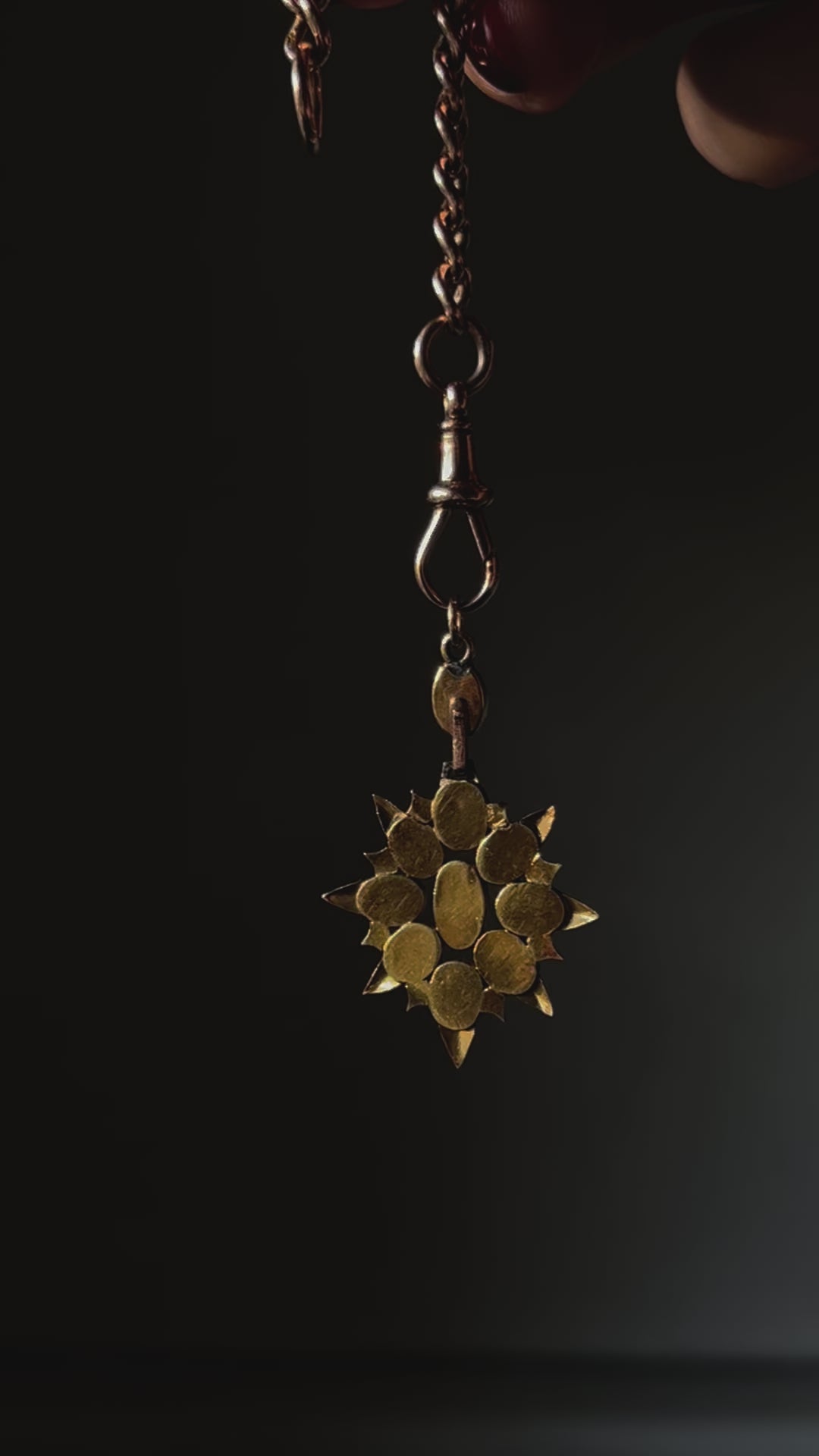 This pendant, with its sharp starburst shape and stunning garnet stones that refract beautifully against the light, beautifully illustrates many of these interests. A wonderful addition to any antique jewelry collection!