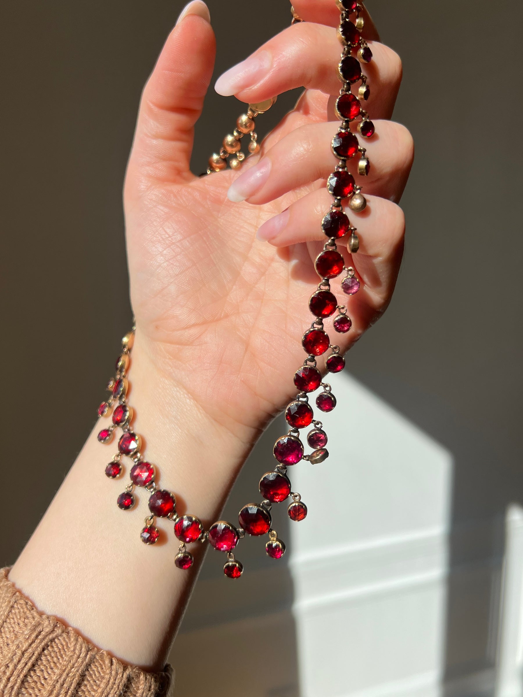 Each garnet is closed-back and foiled, a defining characteristic of traditional work from Perpignan in southern France, where jewelers perfected the art of coaxing extraordinary depth from these richly colored stones. The garnets range from 7 mm to 13 mm, with the fringe drops at approximately 4 mm, creating a beautifully graduated and fluid silhouette along the neckline.