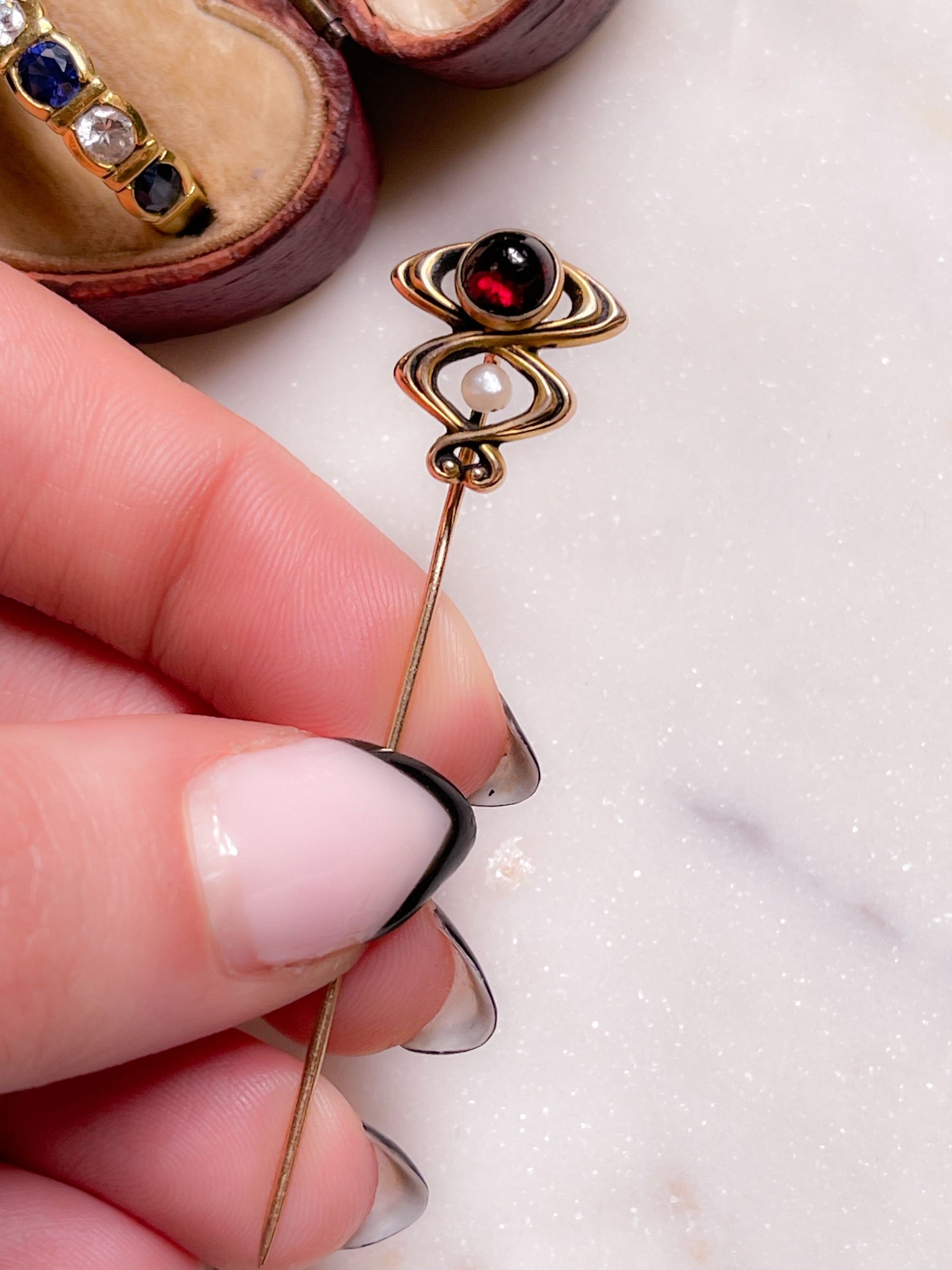 A cabochon garnet takes center stage in this delicious example with a most peculiar Art Nouveau setting. The movement of the jewel is astonishing; the gold captures the movement of opposing rivers swirling around the stones; the bezel-set garnet glowing from within, the spike set pearl lustrously observing.