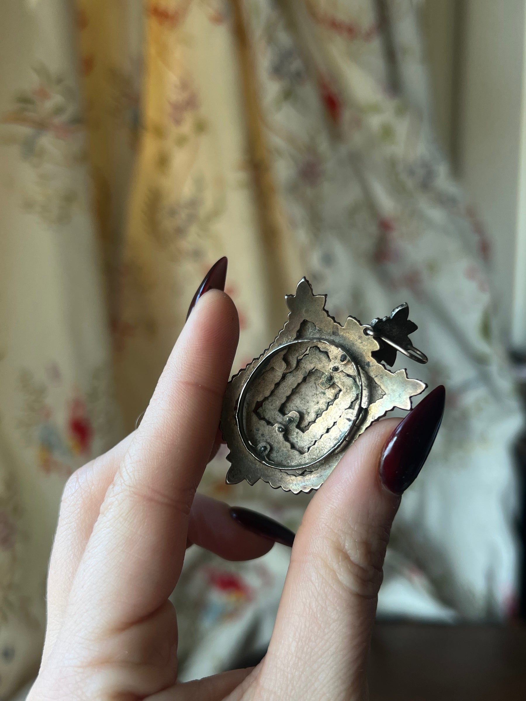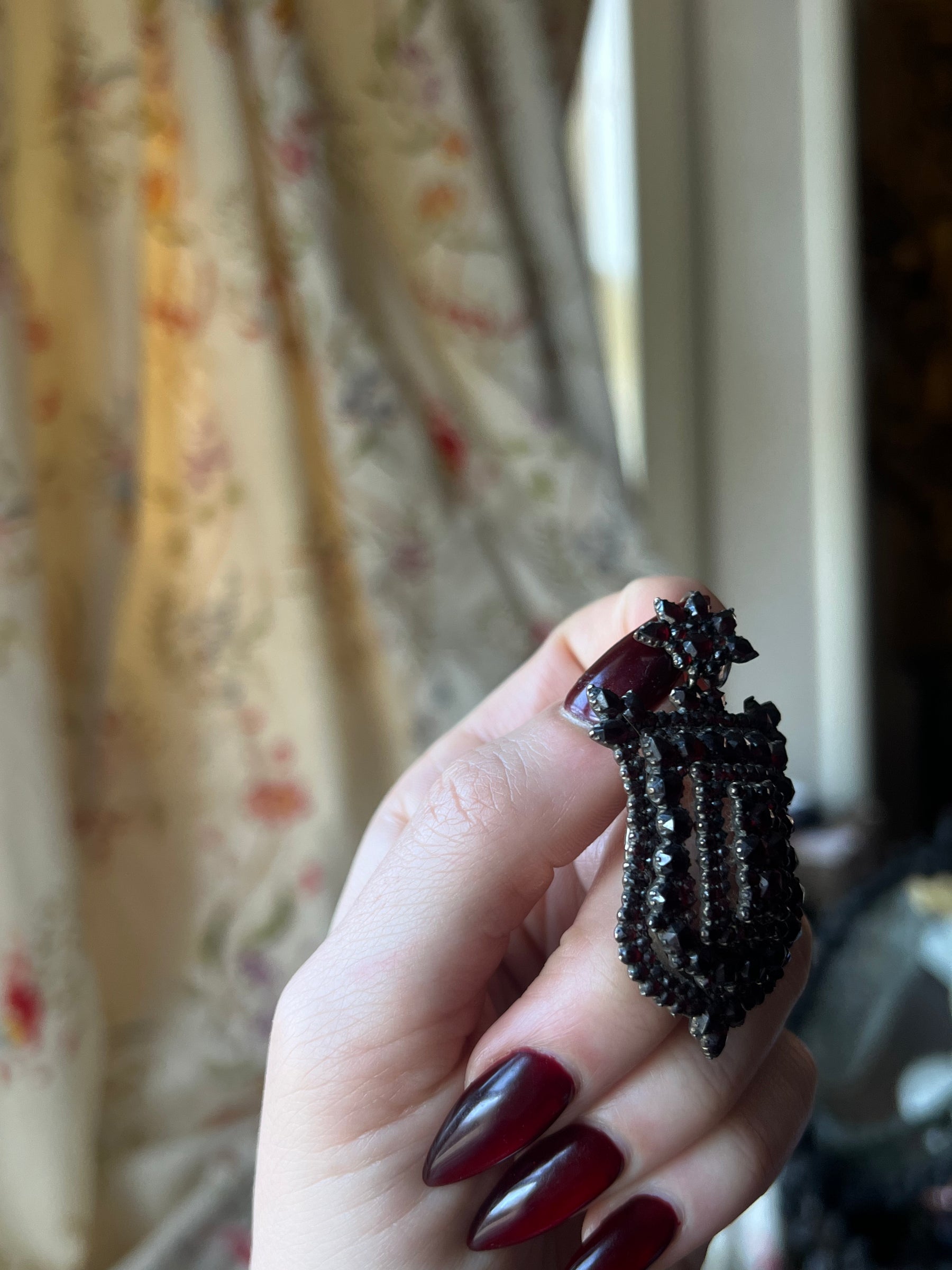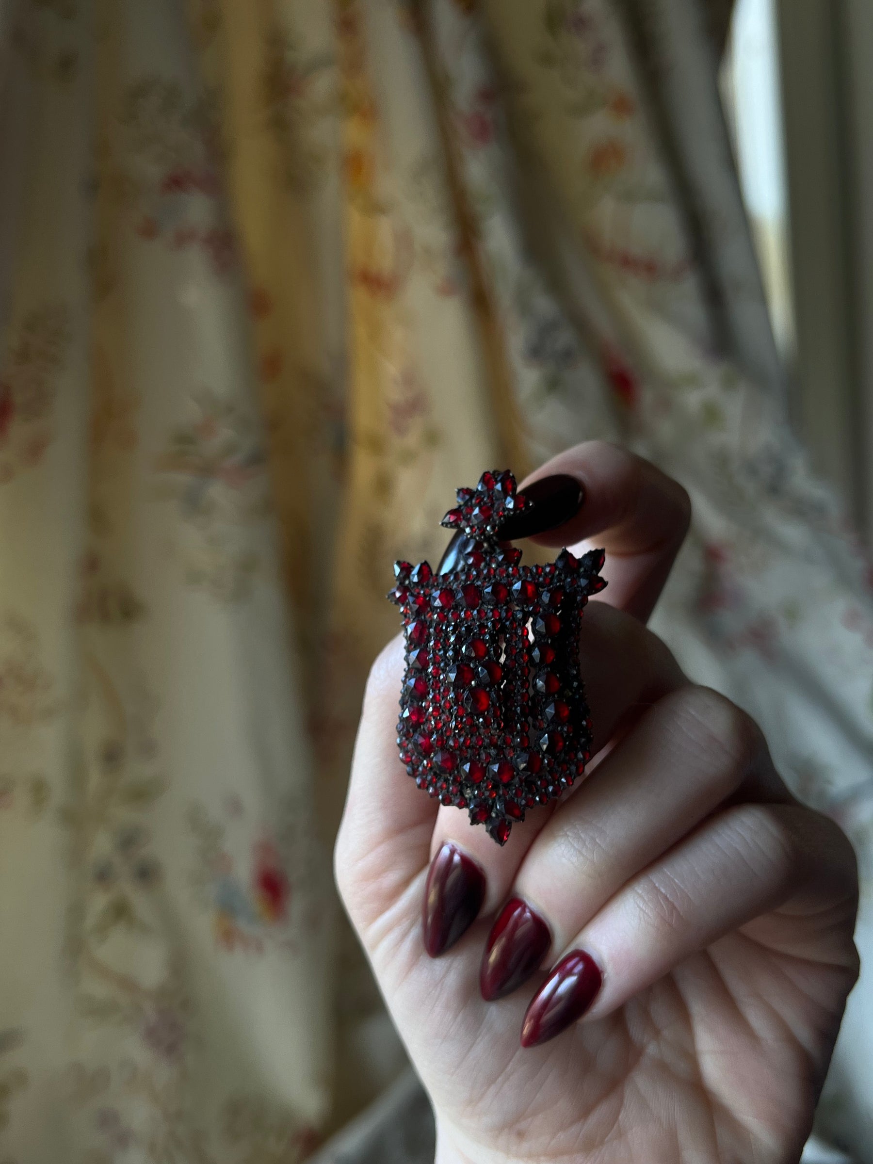 Bohemian garnet jewels are so coveted nowadays, and this rare shield locket is no exception! Crafted circa 1870, this locket is set in a vibrant 6 carat garnet gold. The star of the show of course, is this dazzling array of miniature Bohemian Garnets!