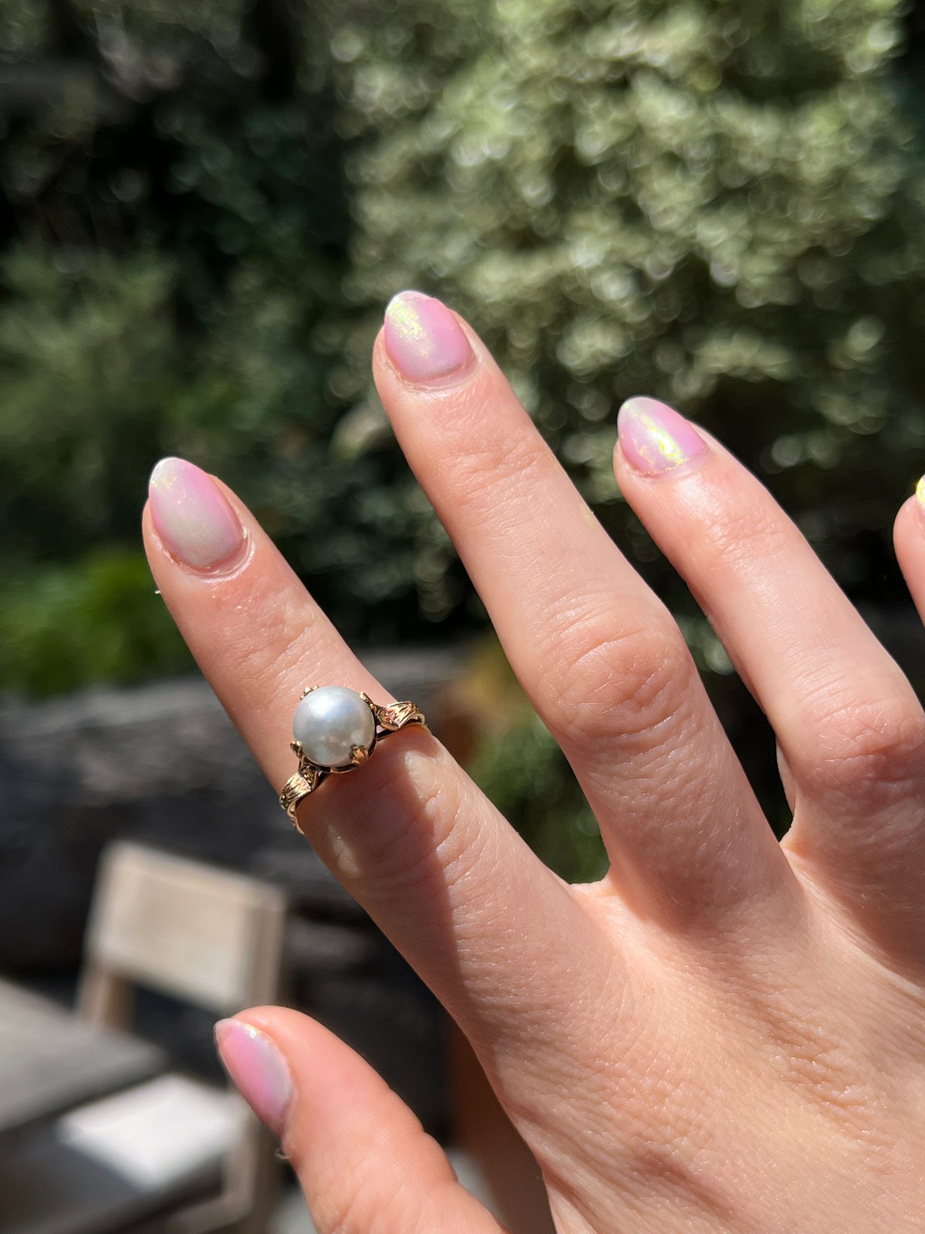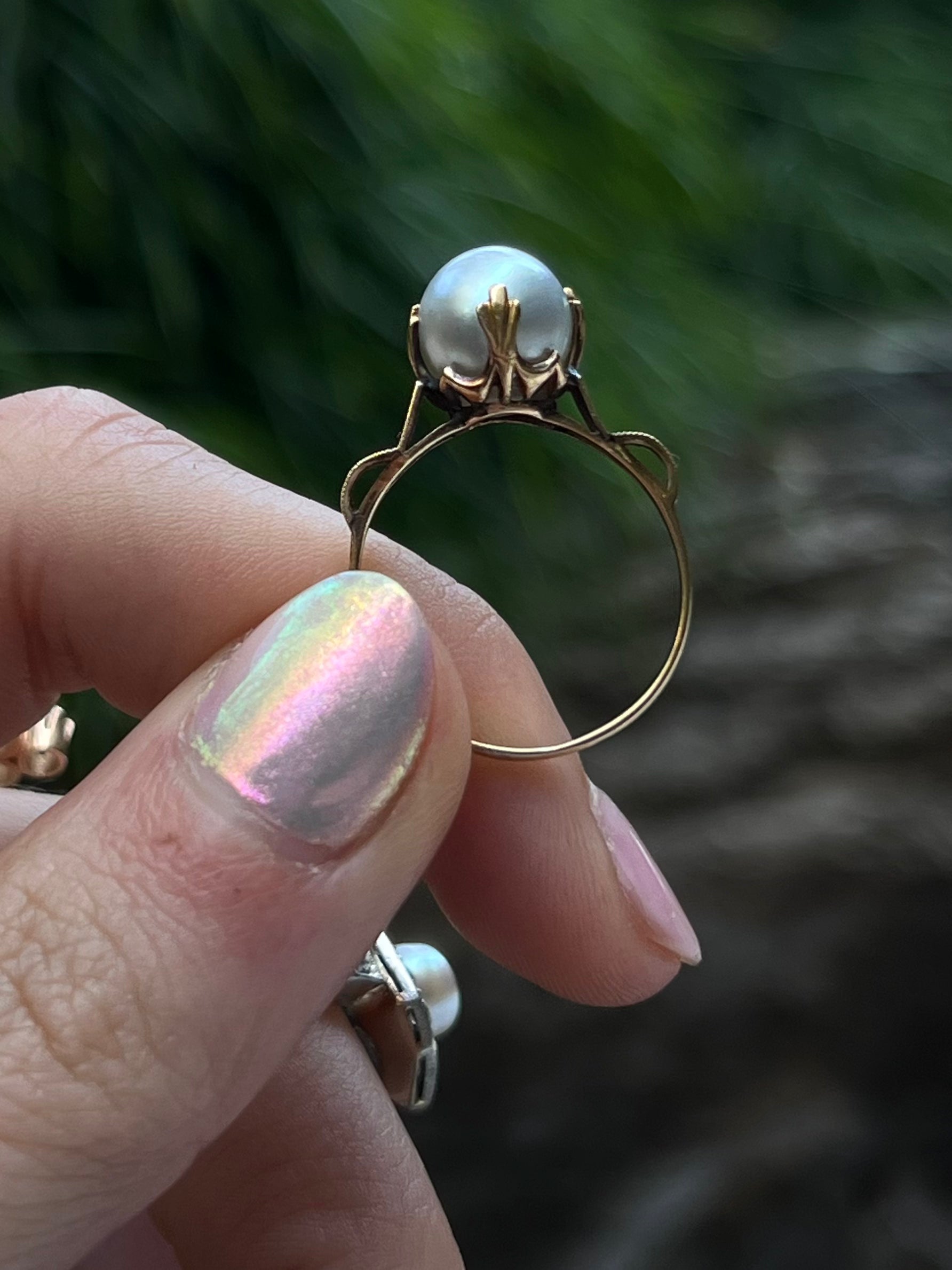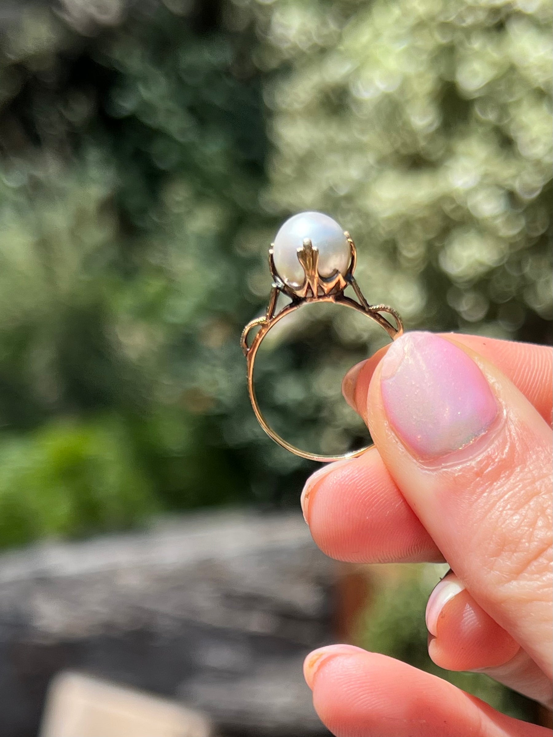 This mid 19th century stunner has a certain luxury to the construction that is quite uncommon to find these days. With sky high prongs that celebrate this rare 10mm blue/grey pearl, the prongs are in the Renaissance fashion- clutching the treasure there held! We are especially excited about the delicacy of the softly illuminating gray luster of the central pearl. Freshly sourced in London, this remarkable 19th century ring is a joy to wear and a textbook example to curate.