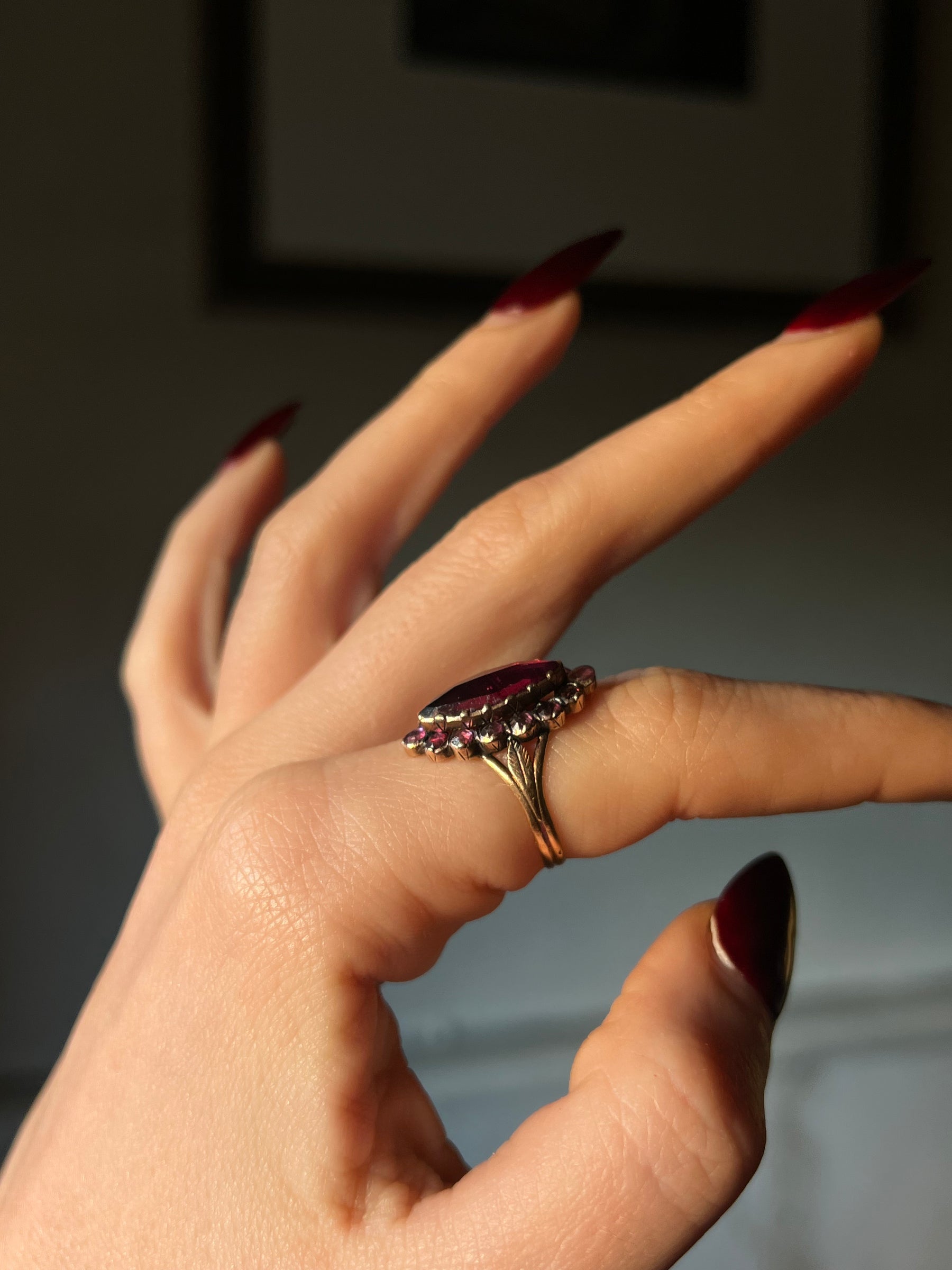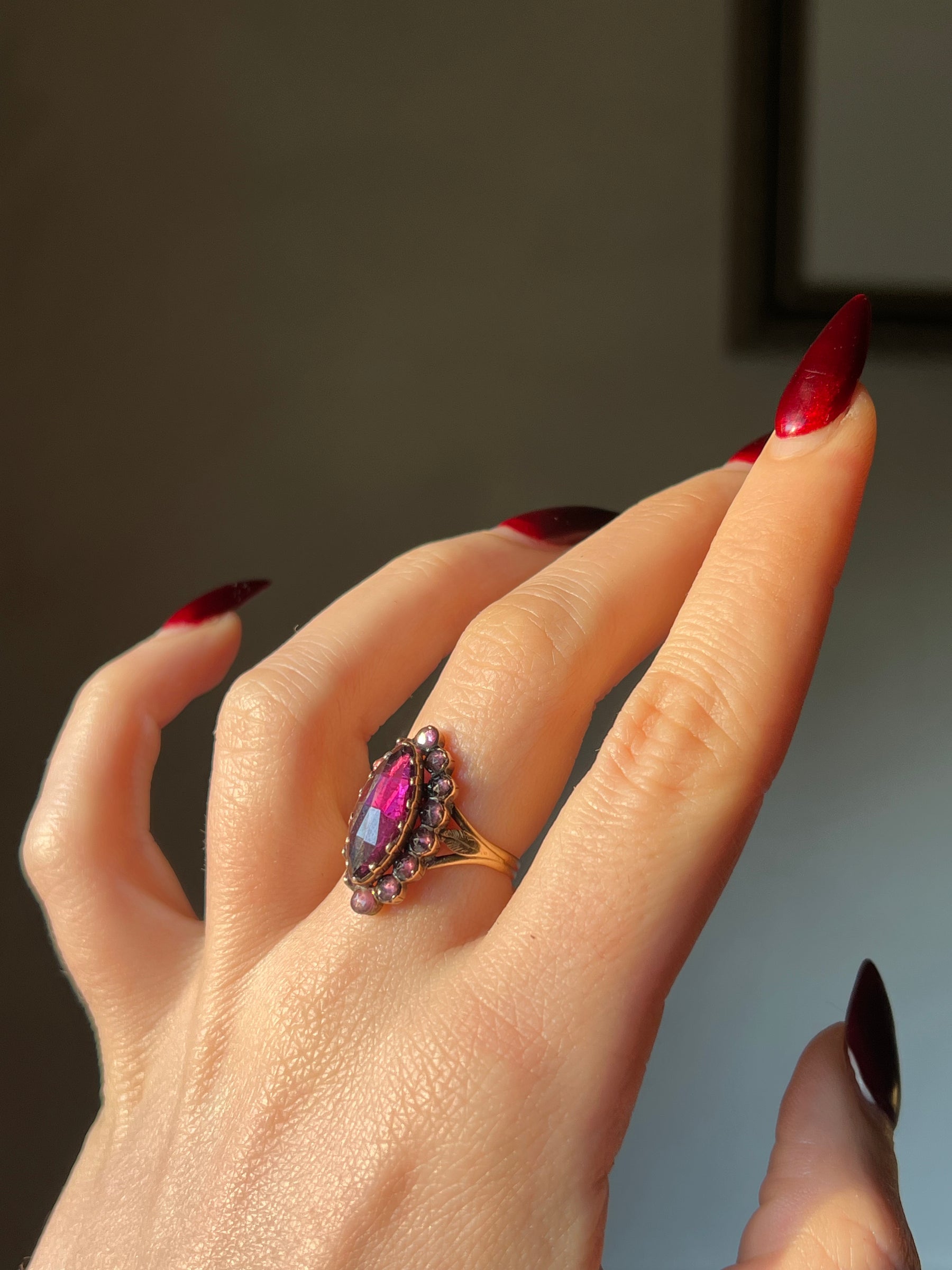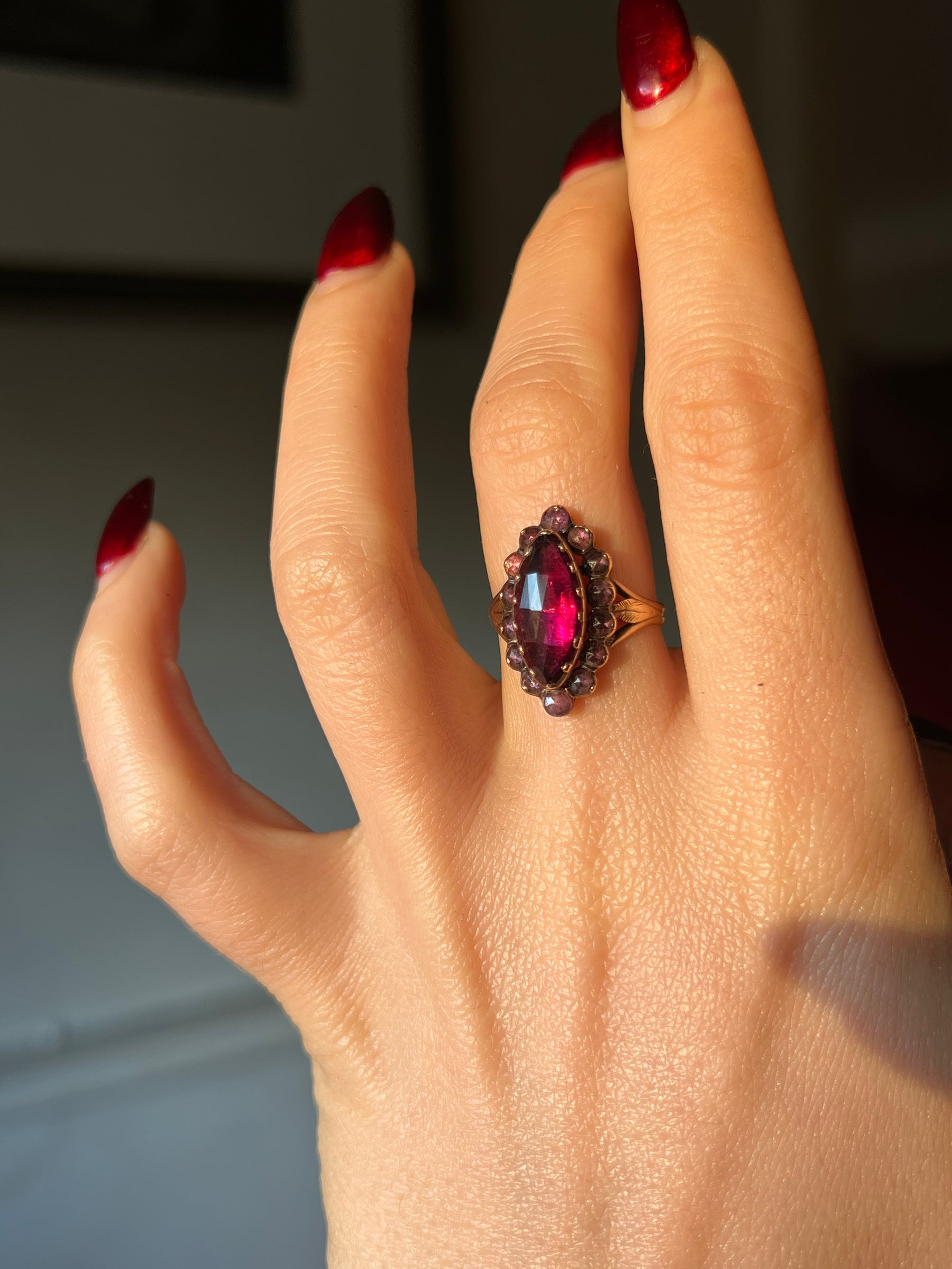 It features a foiled Marquee cut Perpignant garnet at the center, halo’d by a cluster of round cut garnet stones.