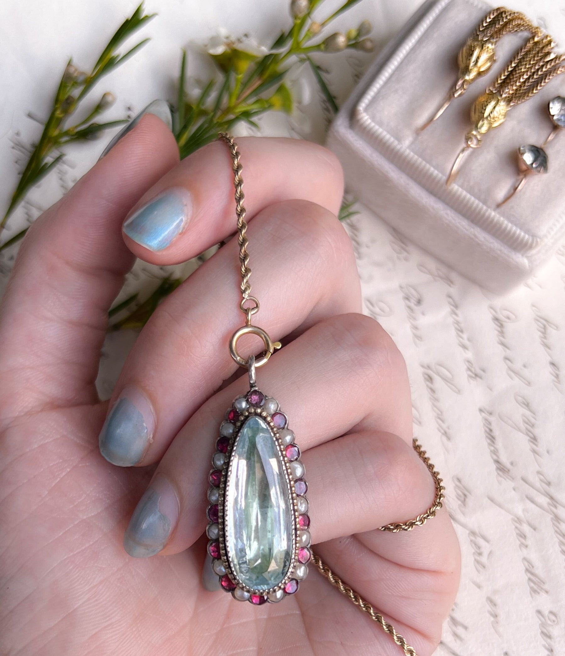 Outstanding 9k Georgian Aquamarine, Flat-Cut Garnet, and Pearl Pendant